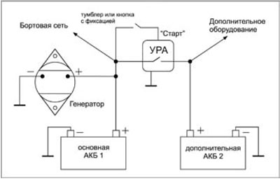 Устройства развязки аккумуляторов (УРА) предназначены для автоматического подключения/отключения дополнительного аккумулятора к бортовой сети автомобиля и развязки его с основным. УРА обеспечивает автономный режим работы аккумуляторов, что позволяет использовать один из них для питания дополнительных устройств, таких как автомагнитола, холодильник, осветительные приборы и др. при неработающем двигателе автомобиля. Это исключает разрядку основного аккумулятора, необходимого для надежного старта двигателя. Применяются УРА на автомобилях, а также на морских судах с напряжением бортовой сети 12В.