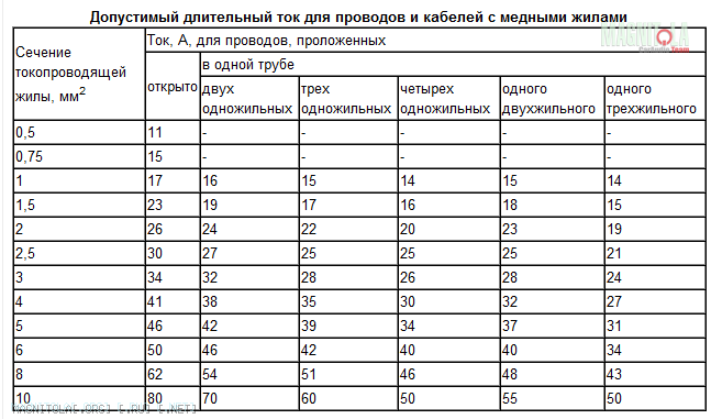 В нашем случае используем двухжильный провод с медными жилами. Подбираем сечение по таблице и оно равняется 1.5 мм2