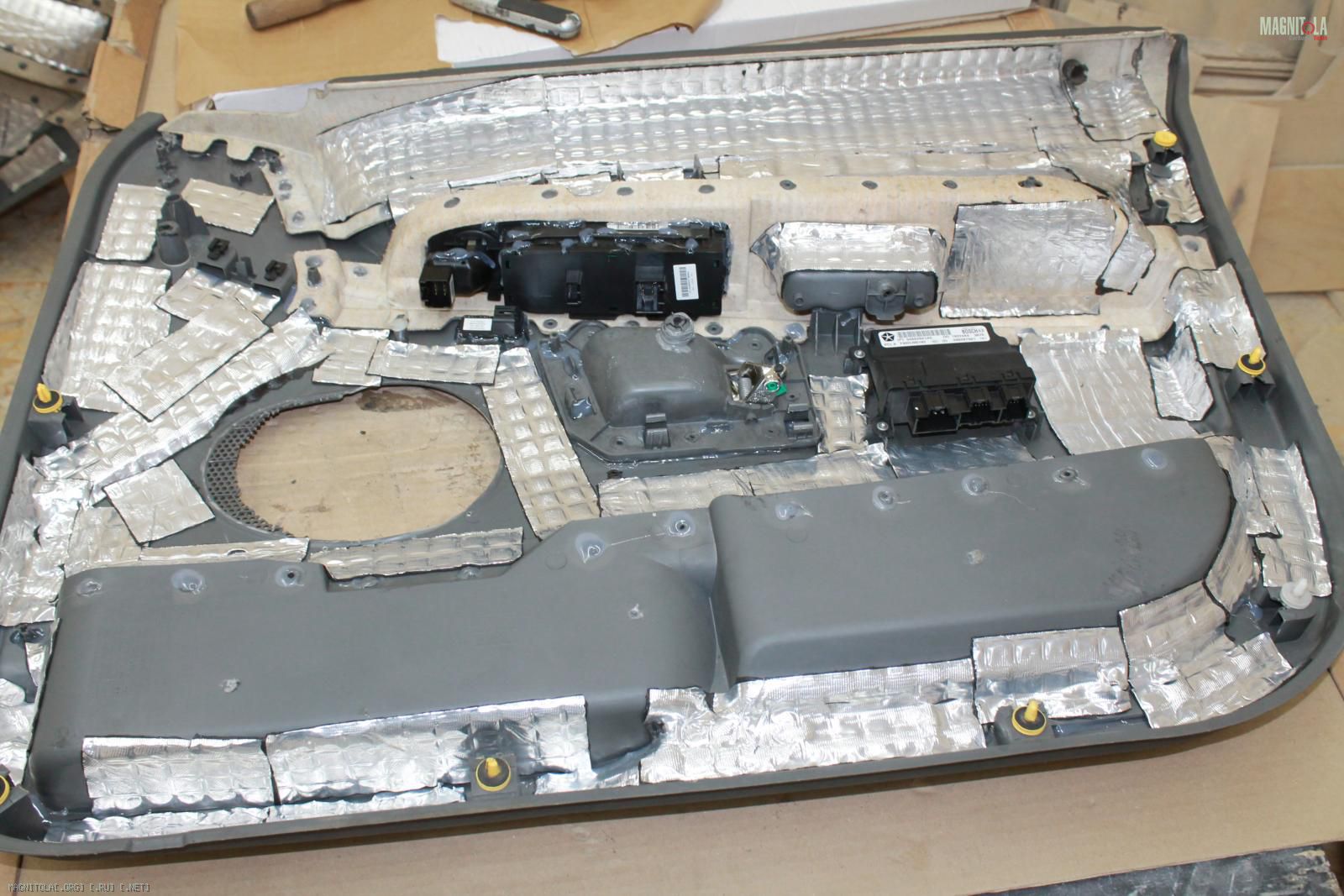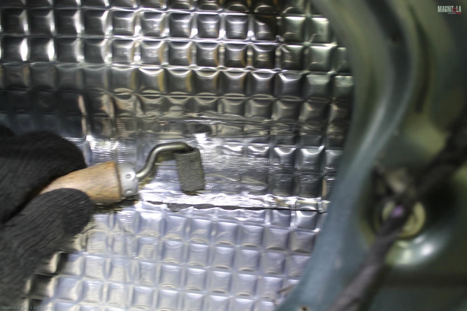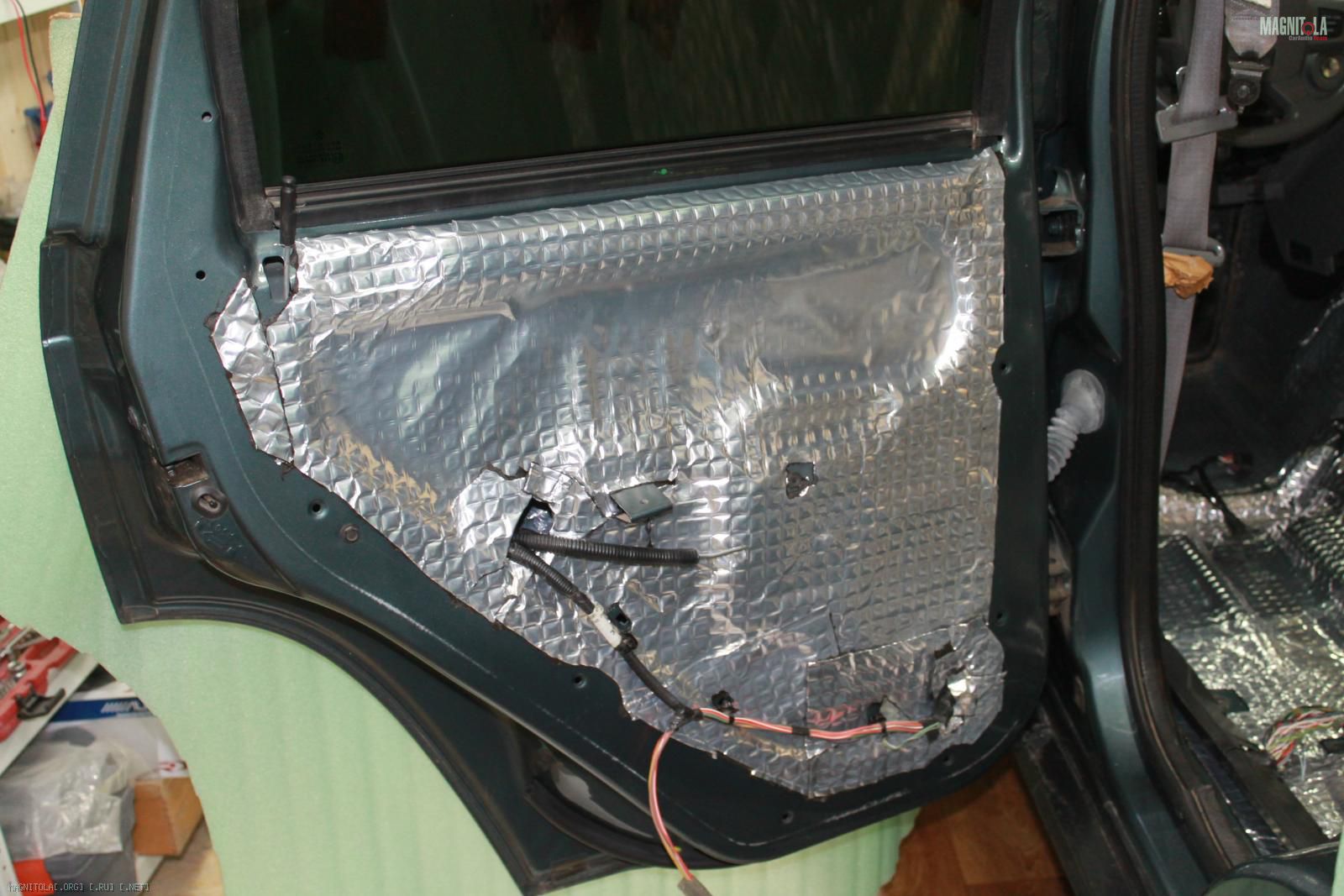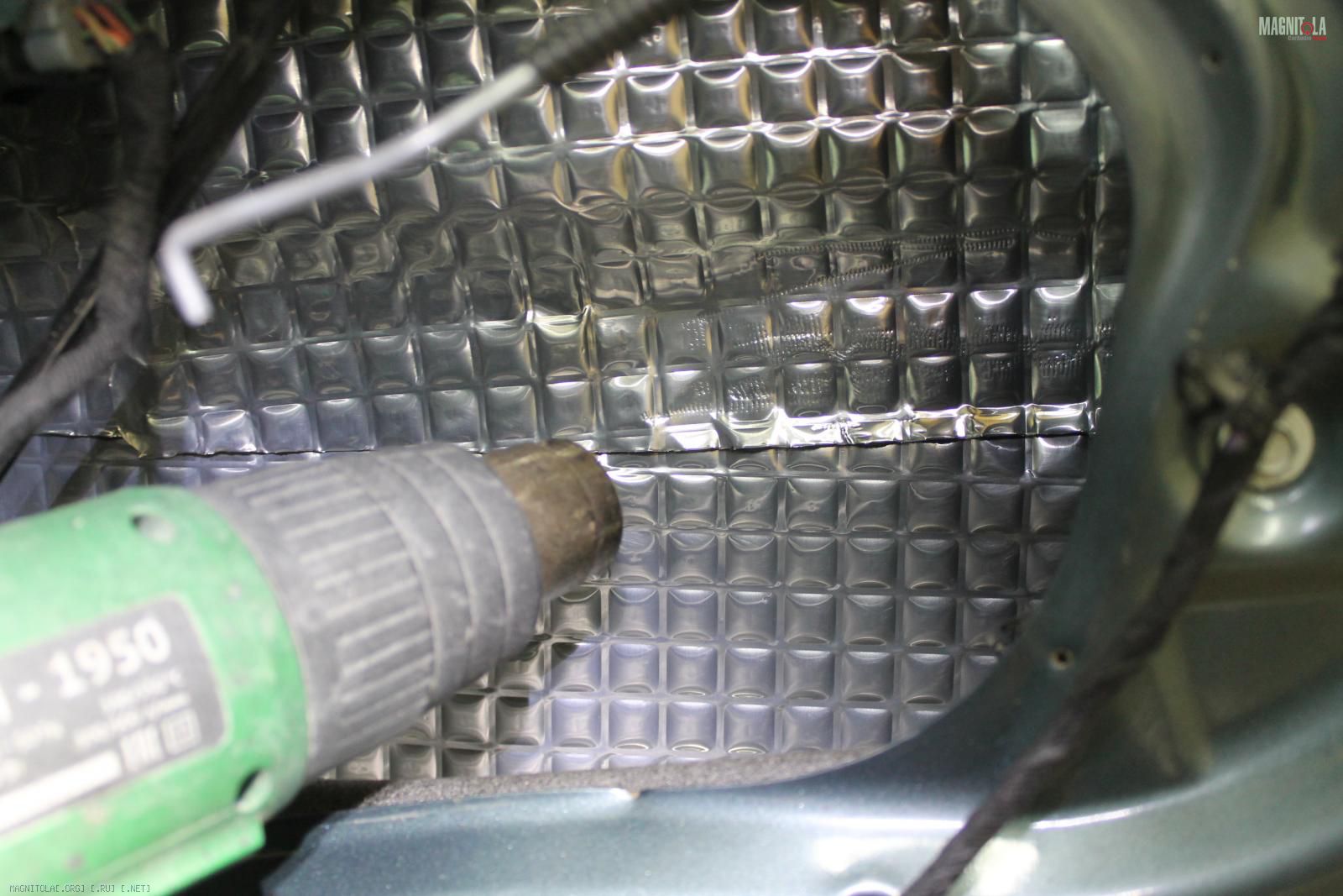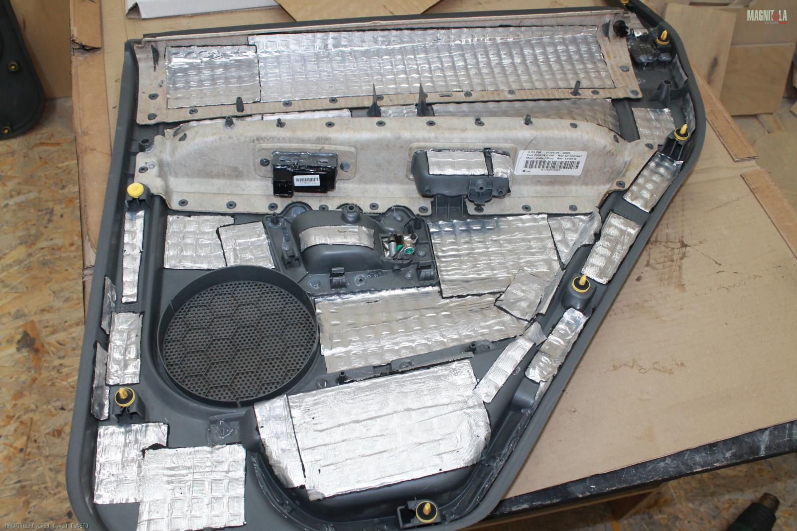 Виброизоляция дверей, греем, прикатываем, проклейка металической перегородки с тыловой стороны