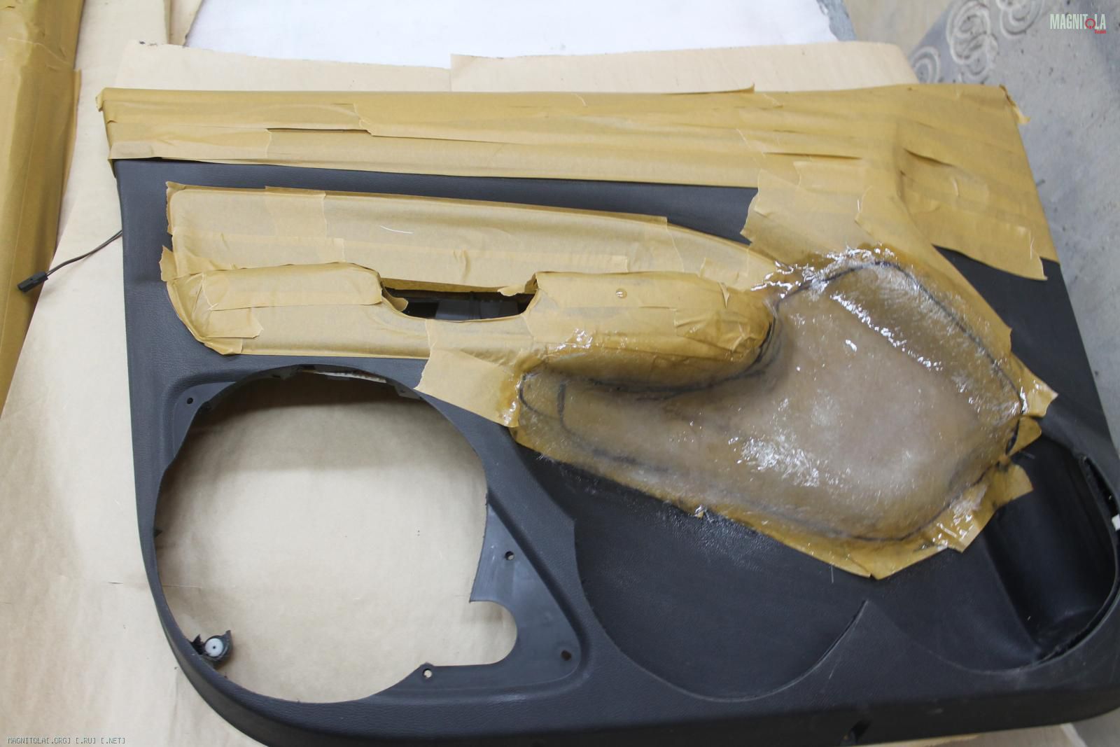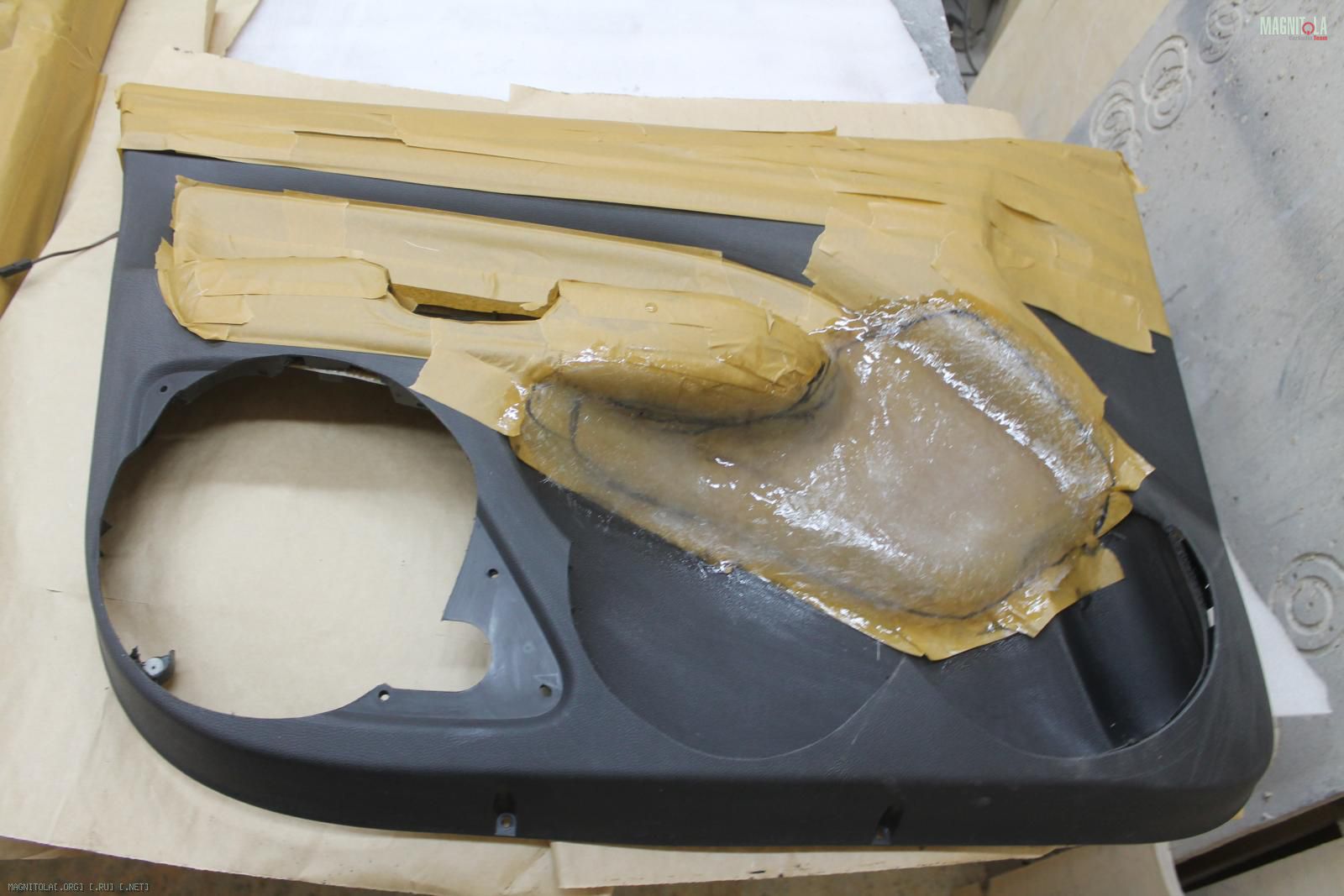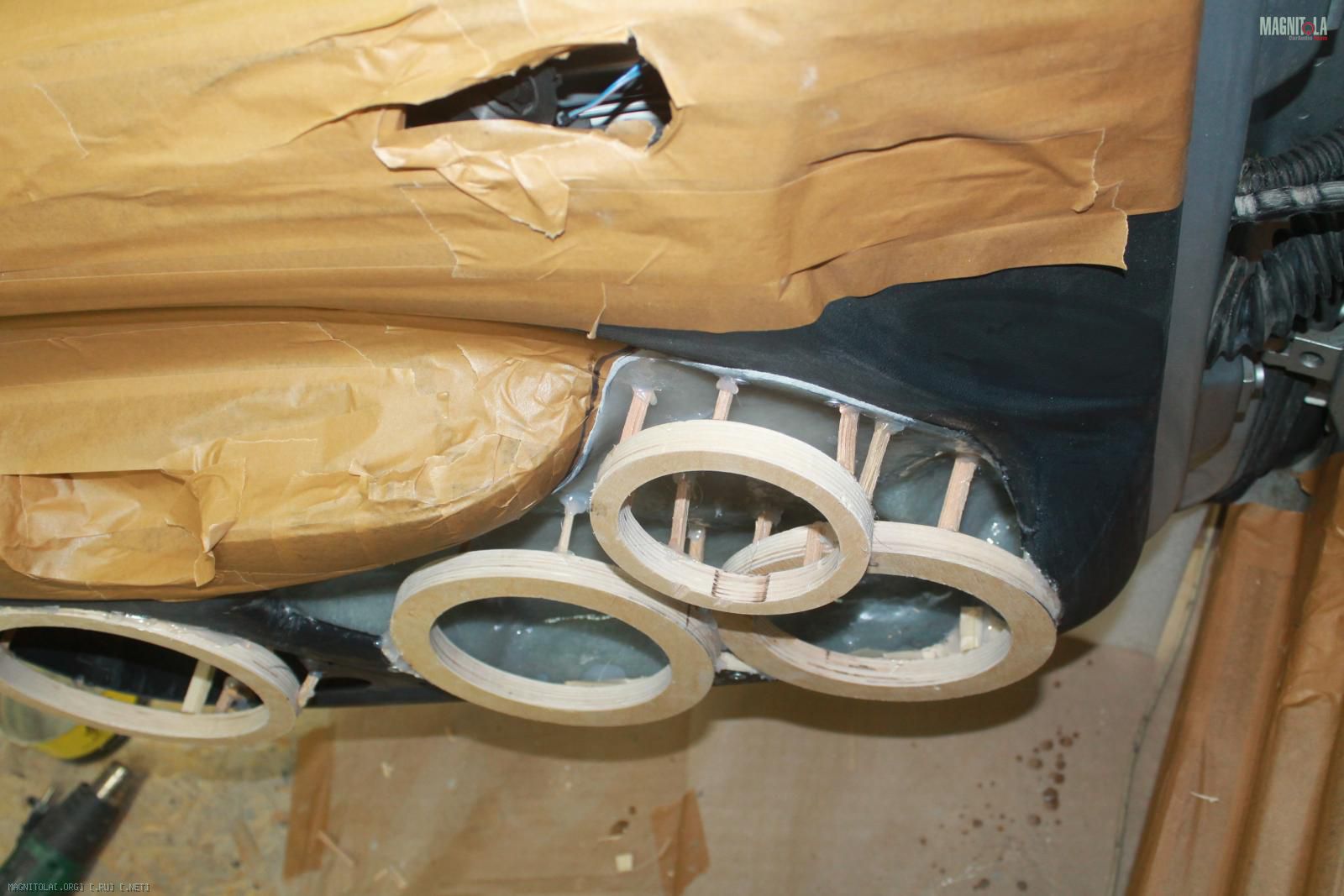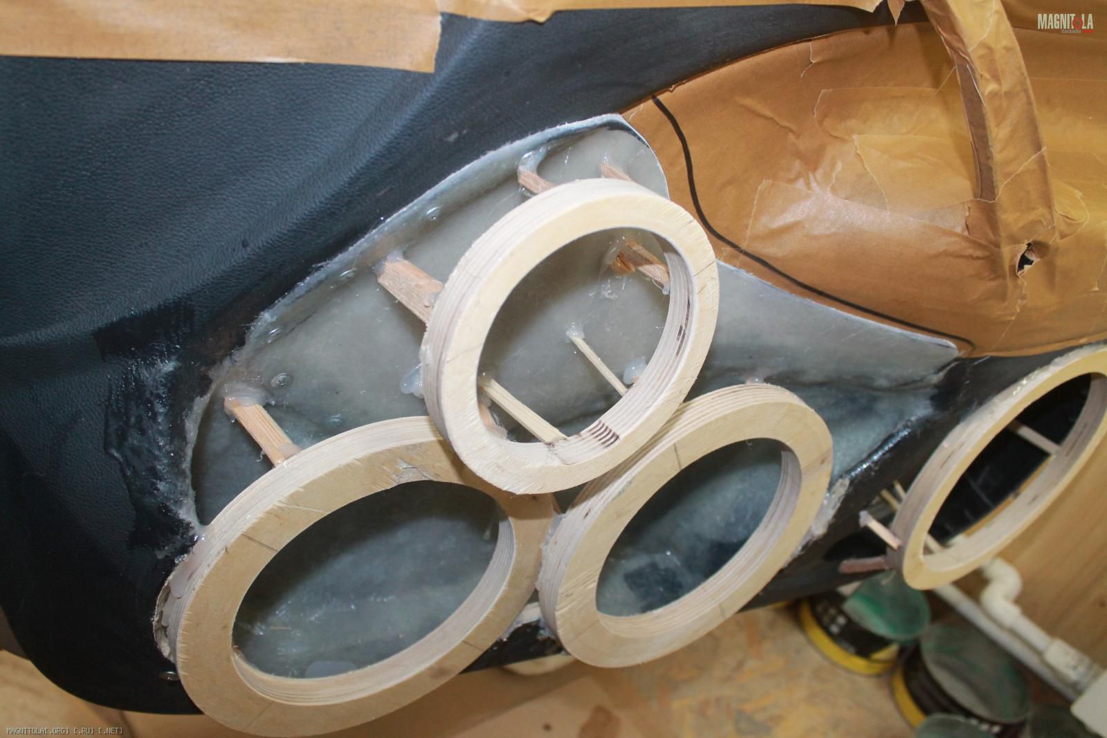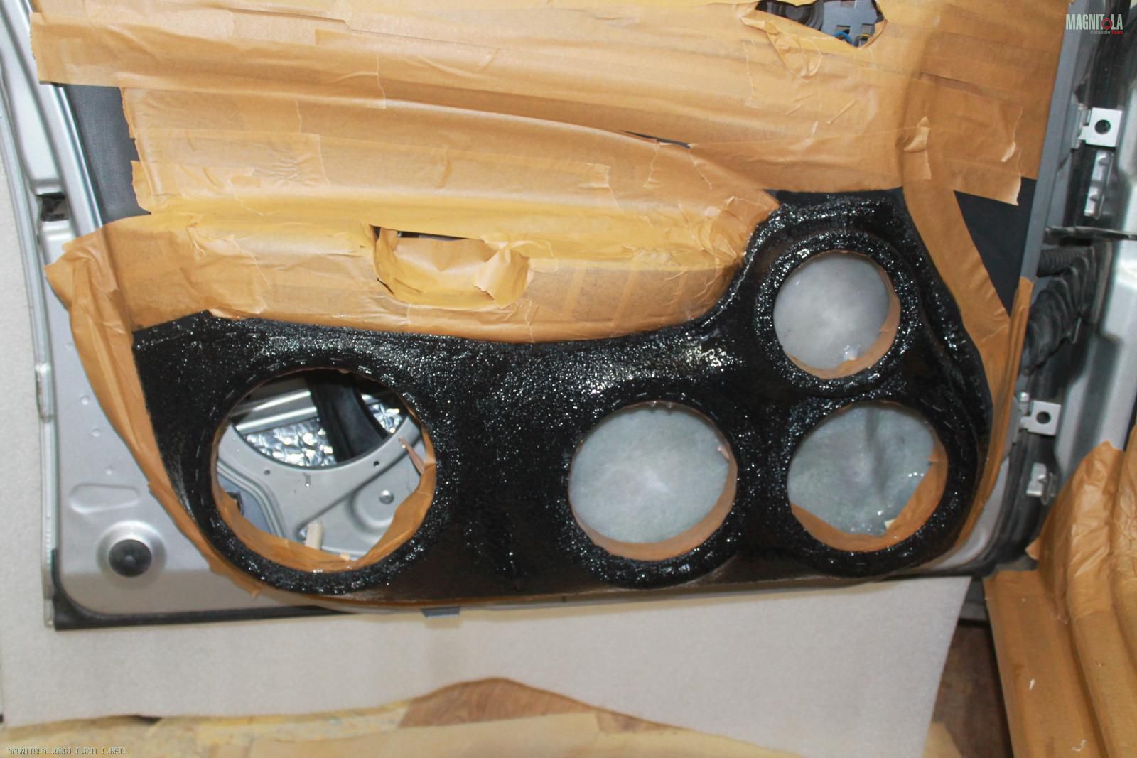 Для того, чтобы мидбас играл в двери, немного надо будет повозится, опорное кольцо не встает, т.к. упирается в магнит, пришлось лепить основу-слепок из стекловолокна.