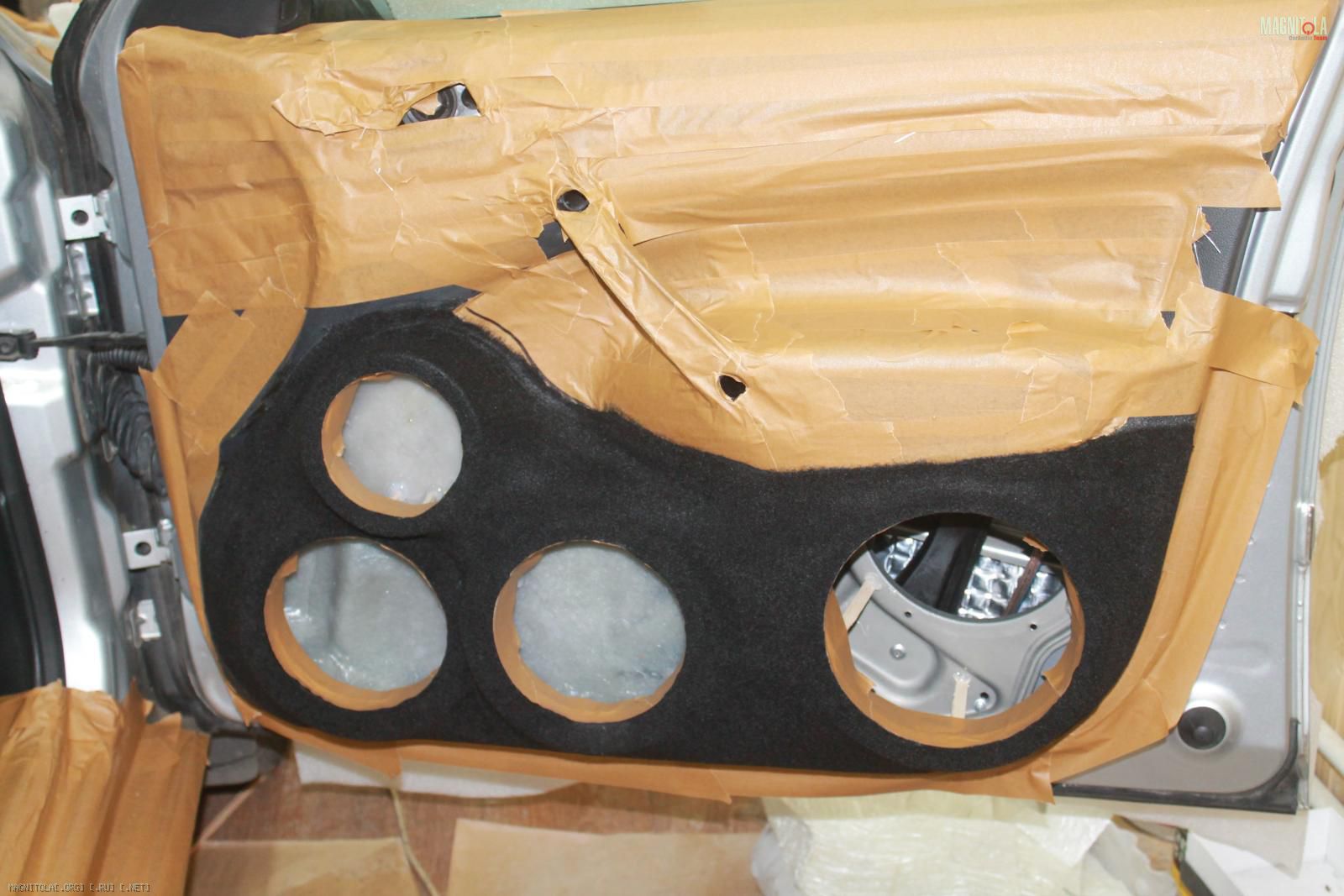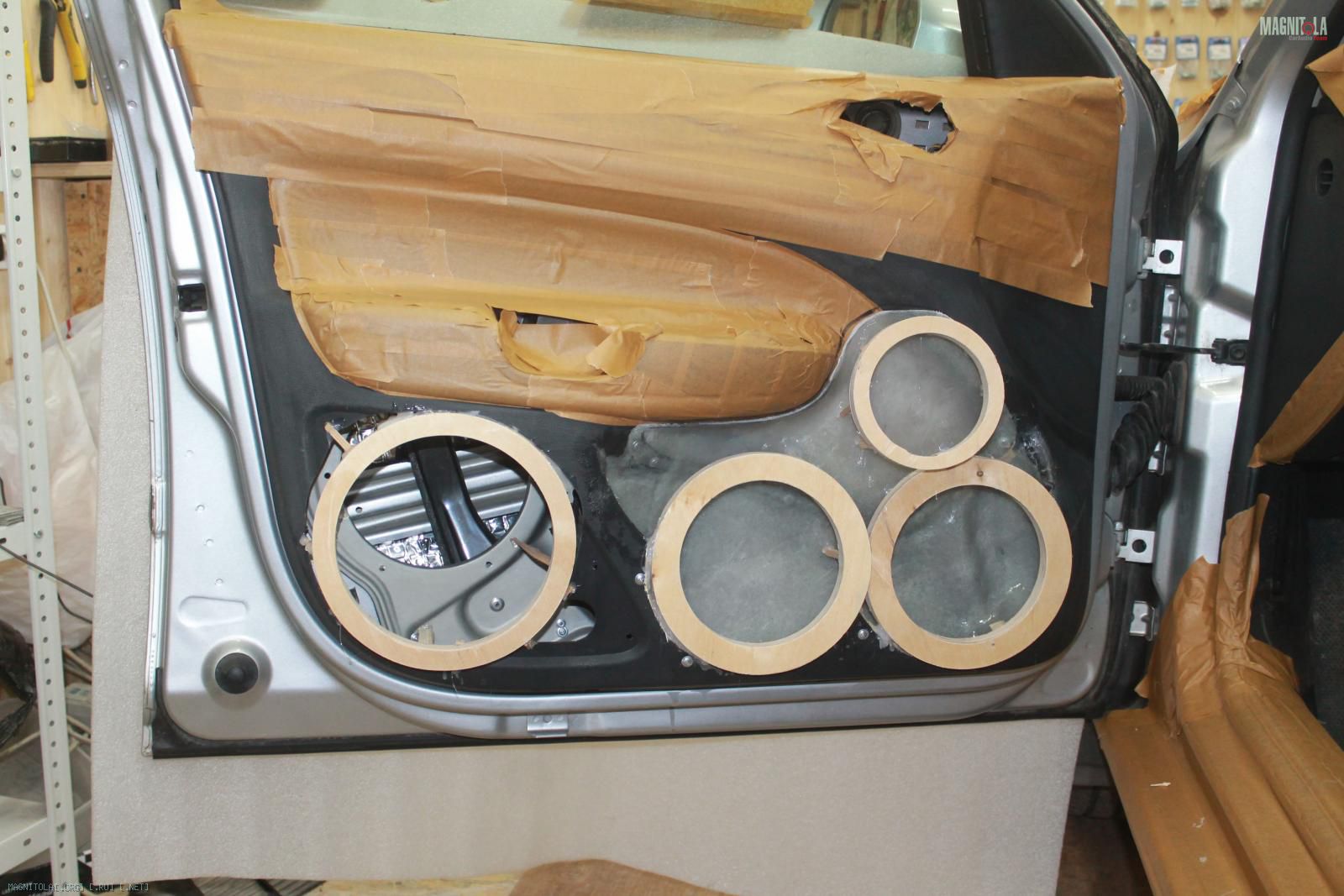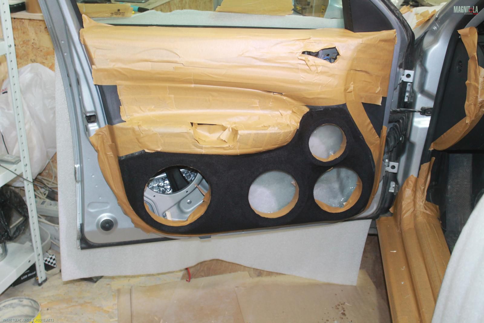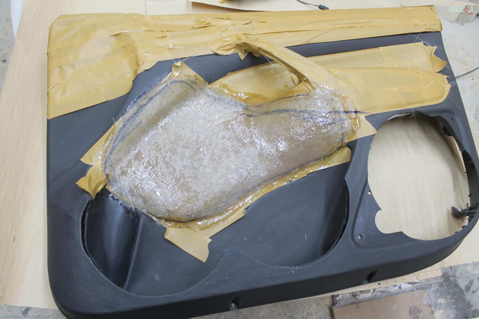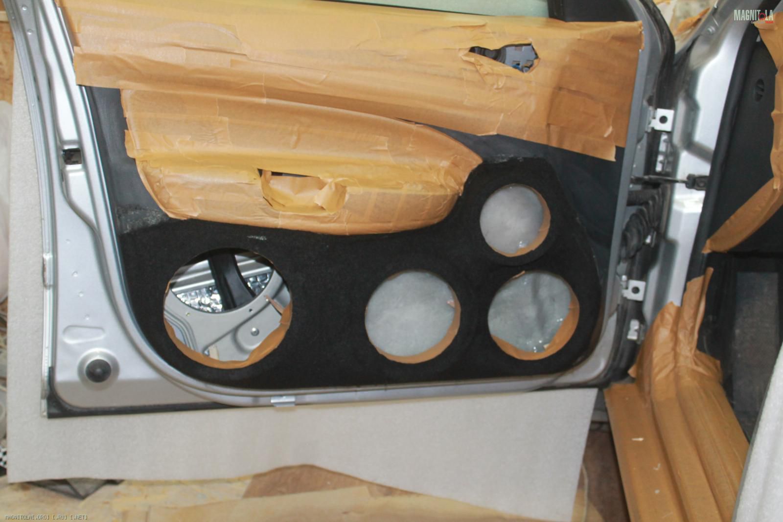 Для того, чтобы мидбас играл в двери, немного надо будет повозится, опорное кольцо не встает, т.к. упирается в магнит, пришлось лепить основу-слепок из стекловолокна.