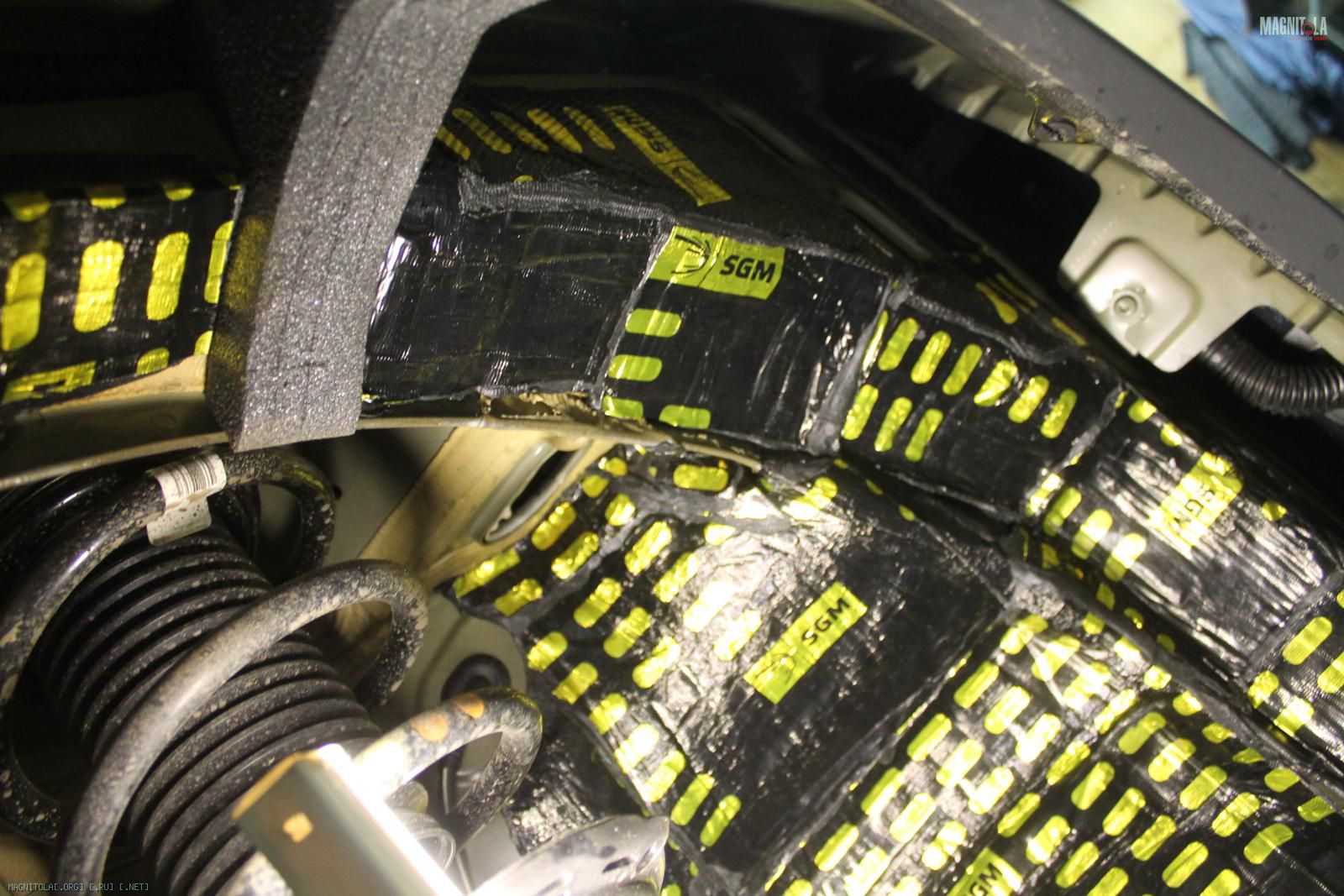 Вибрим сетки и боковые стойки, уплотняем битопластом, наносим войлок.