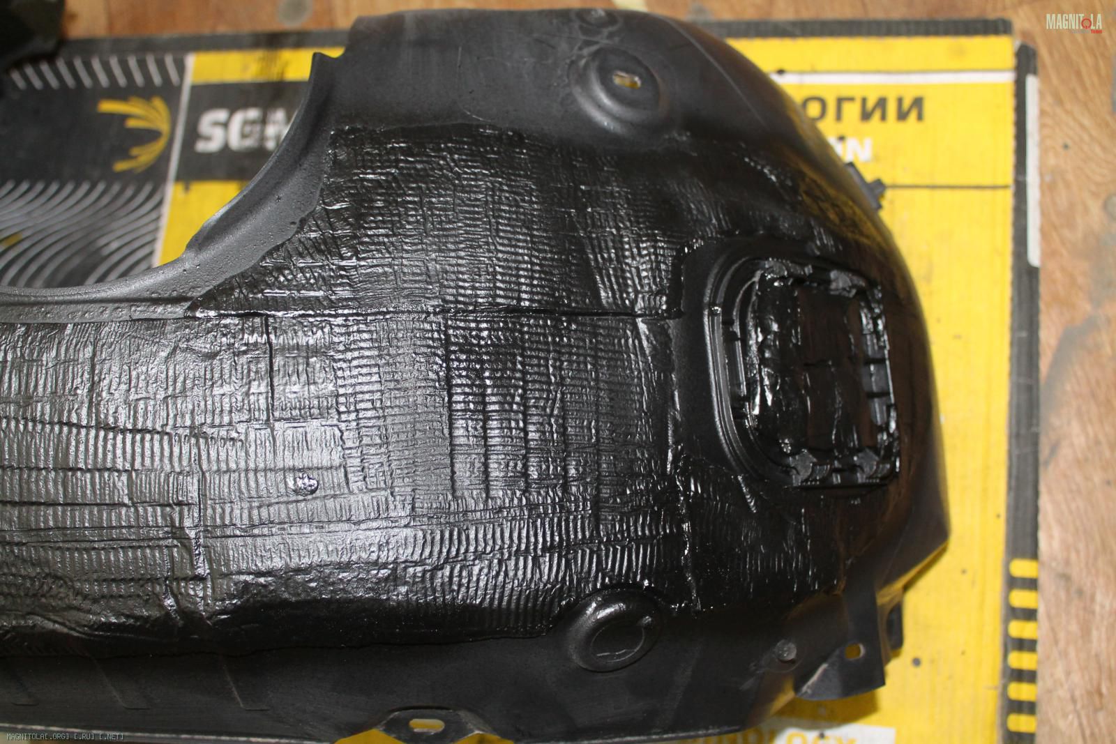 Подготавливаем место под центральный канал, вибрим, акустически демпфируем, убираем скрипы пластиковой решетки. Одновременно пропитываем подвес СЧ, красим выцветший диффузор.