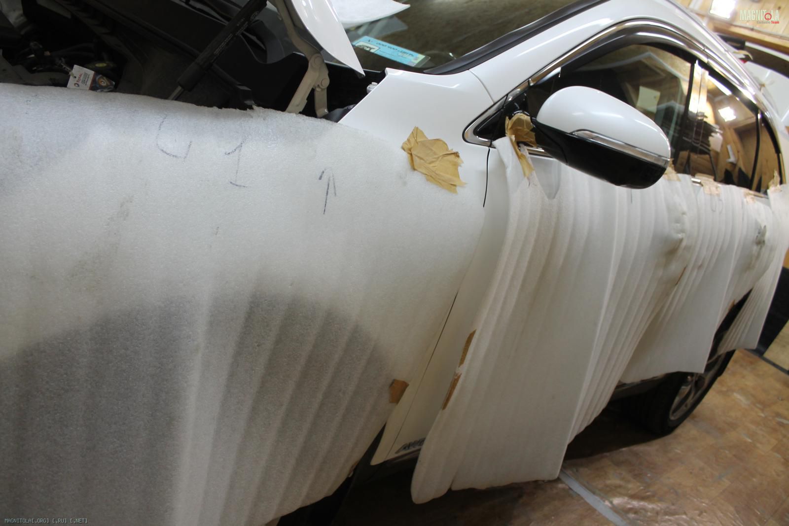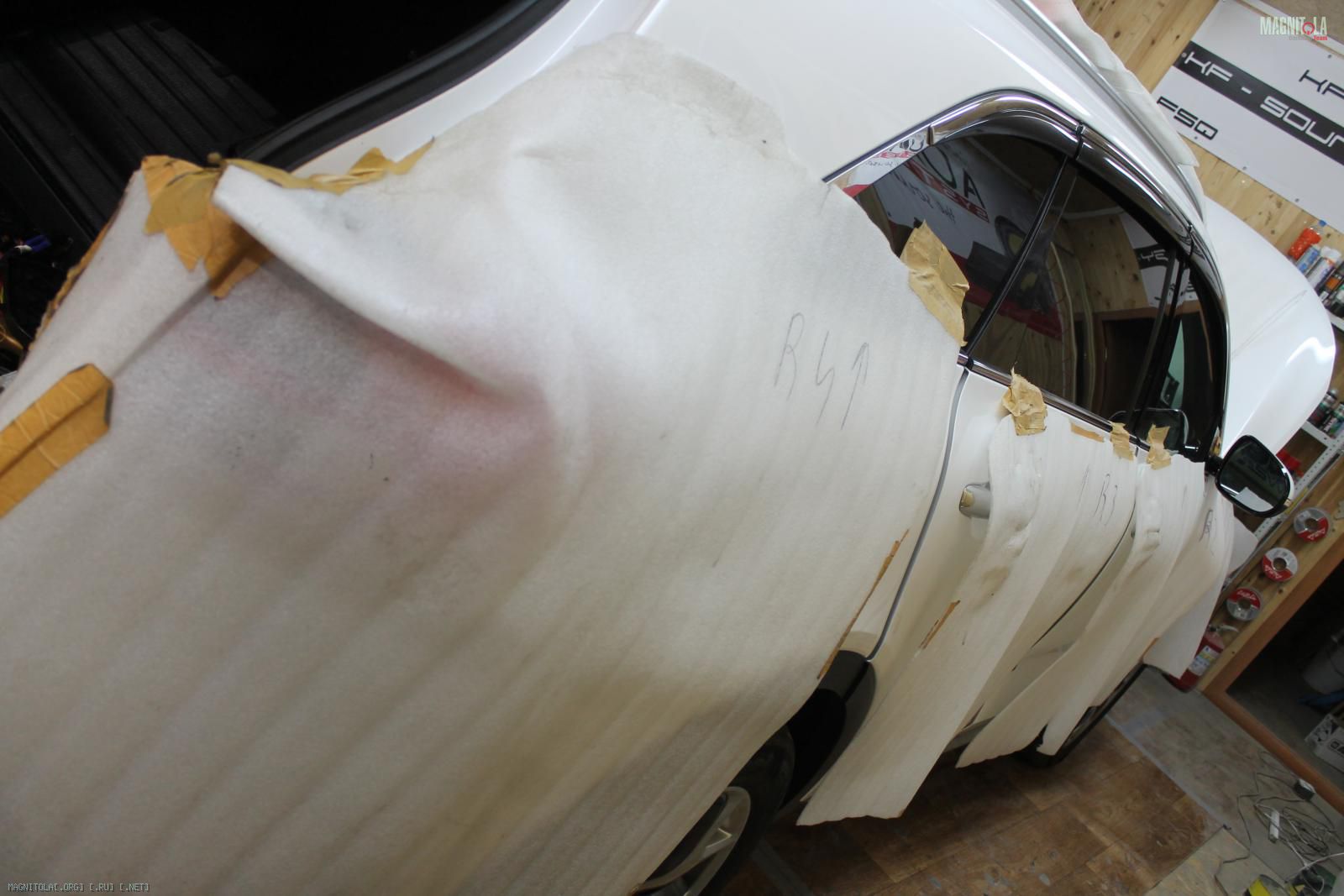 Также наносим блокатор на передние арки и моторную перегородку, вплоть до щитка приборов. Греем, прикатываем...