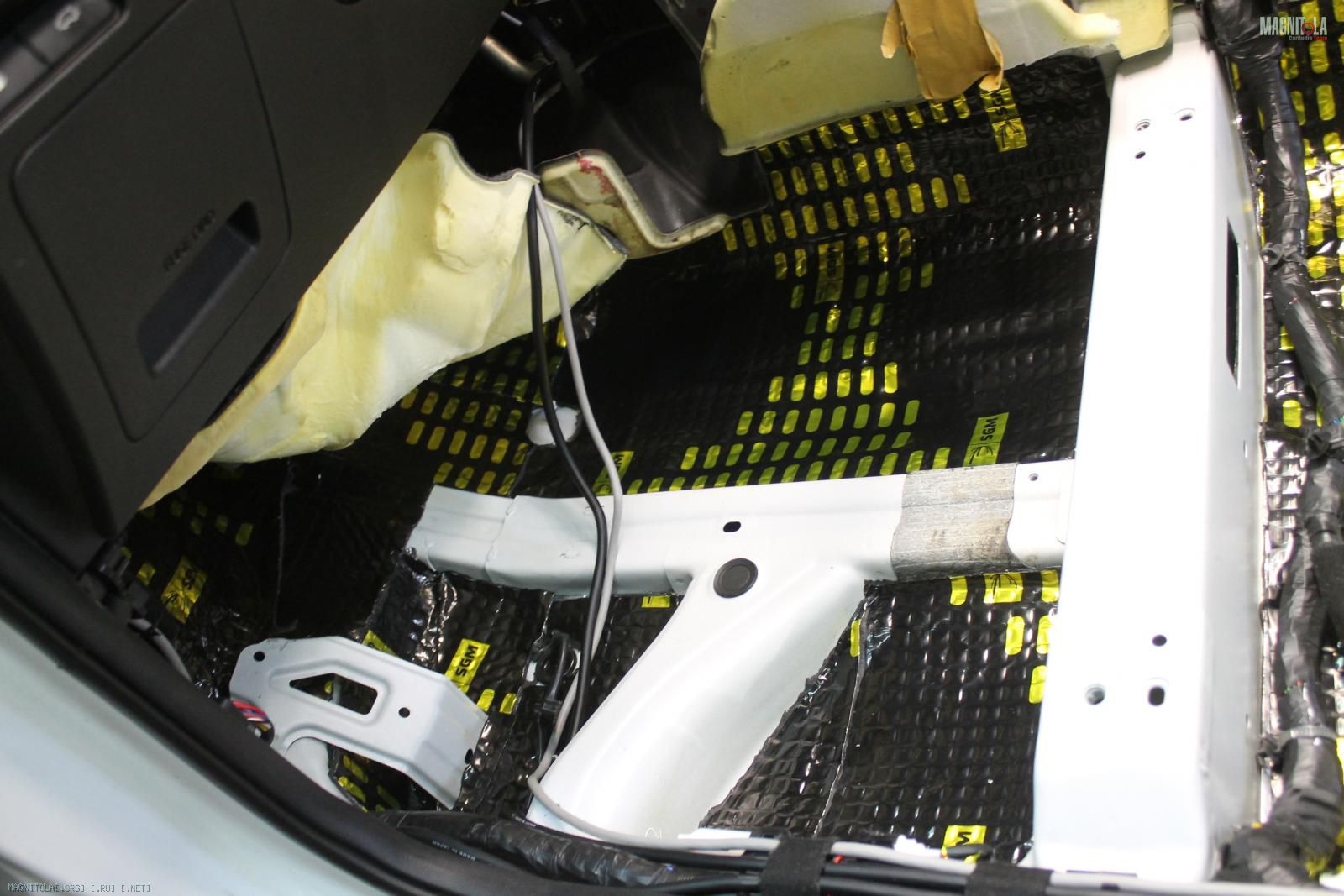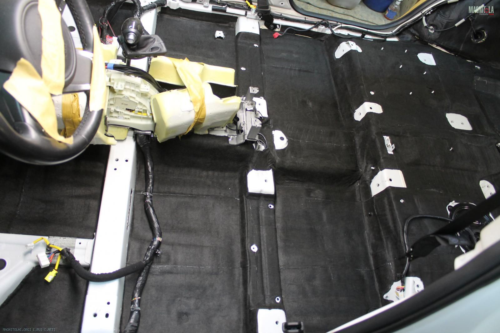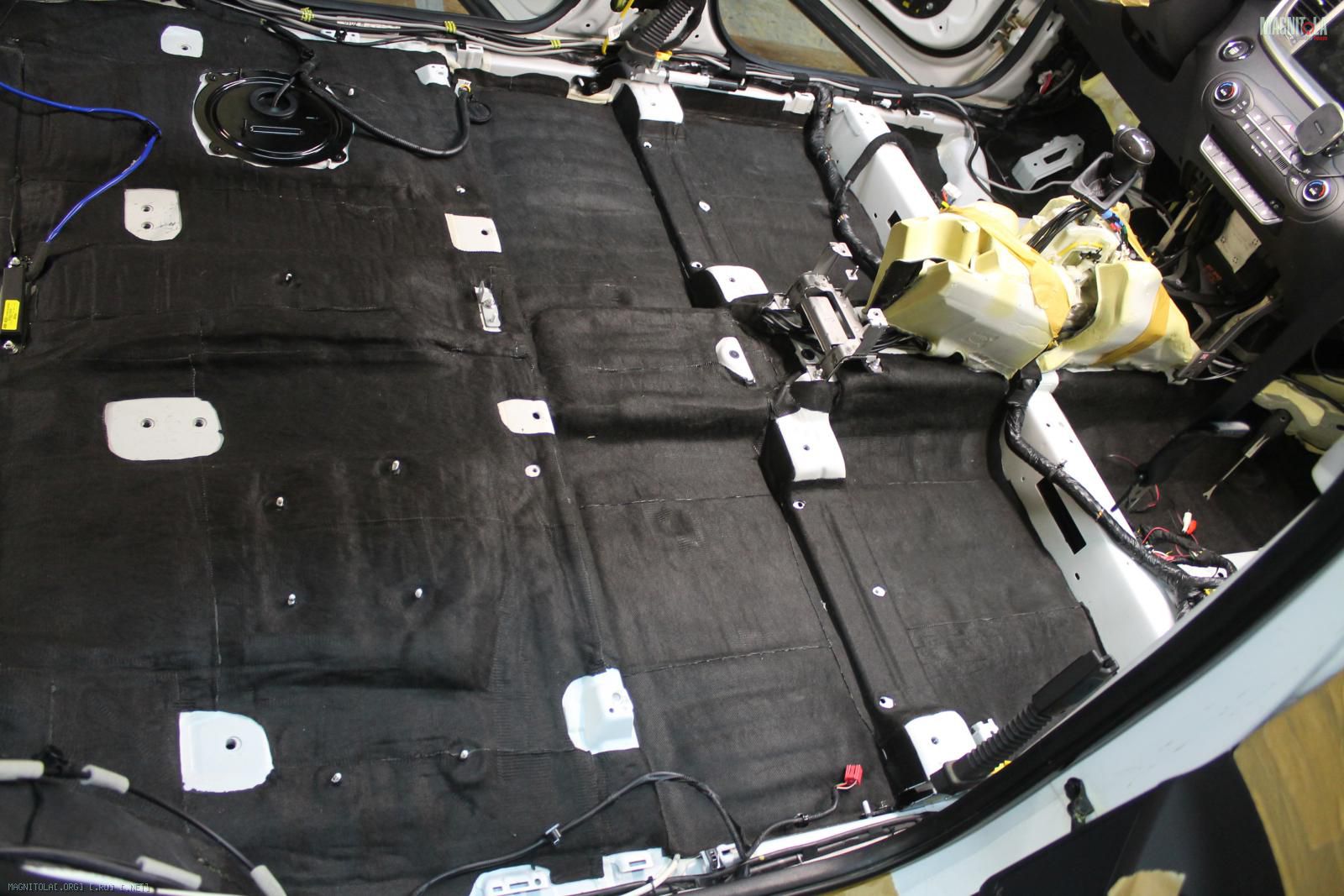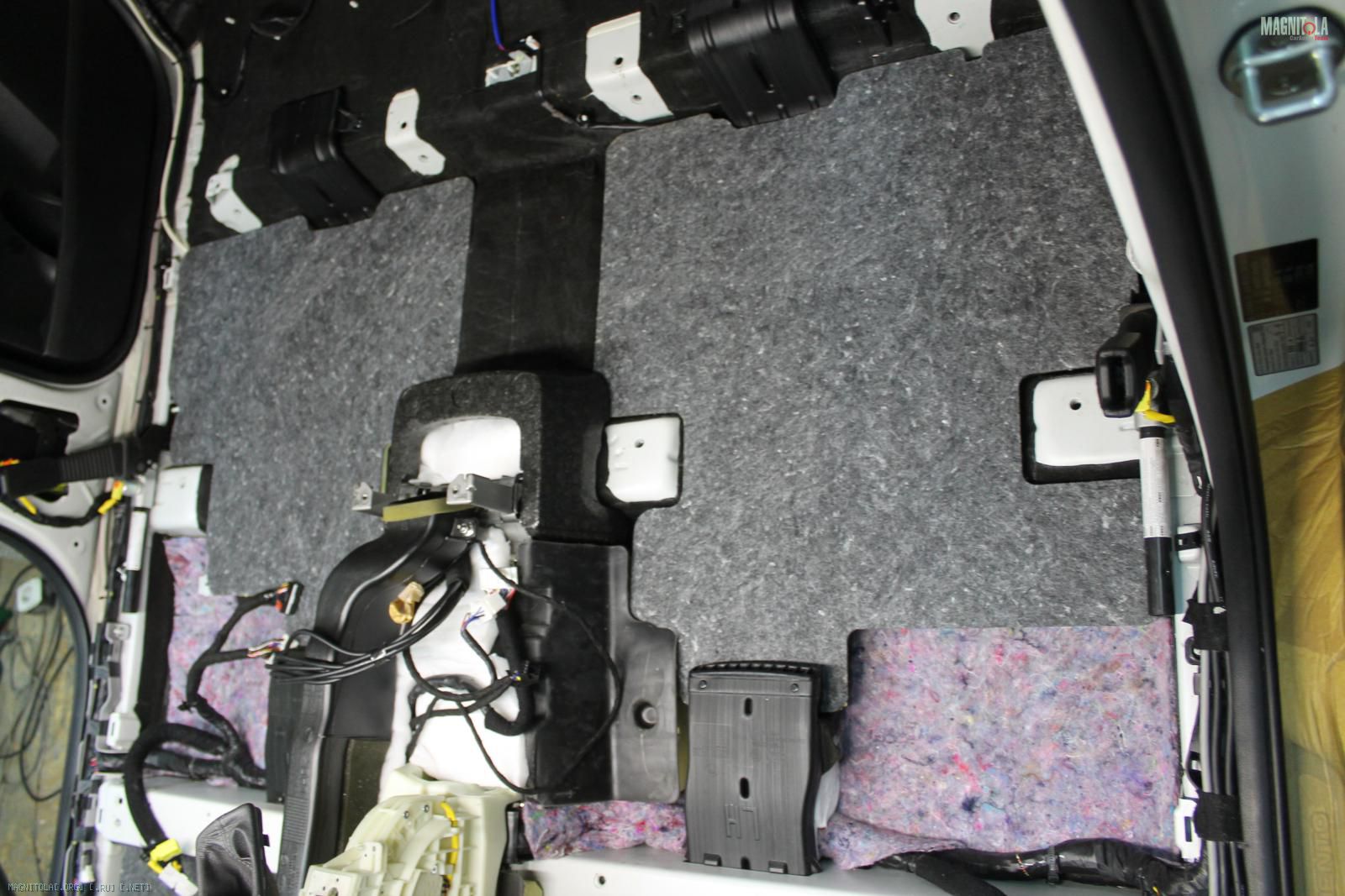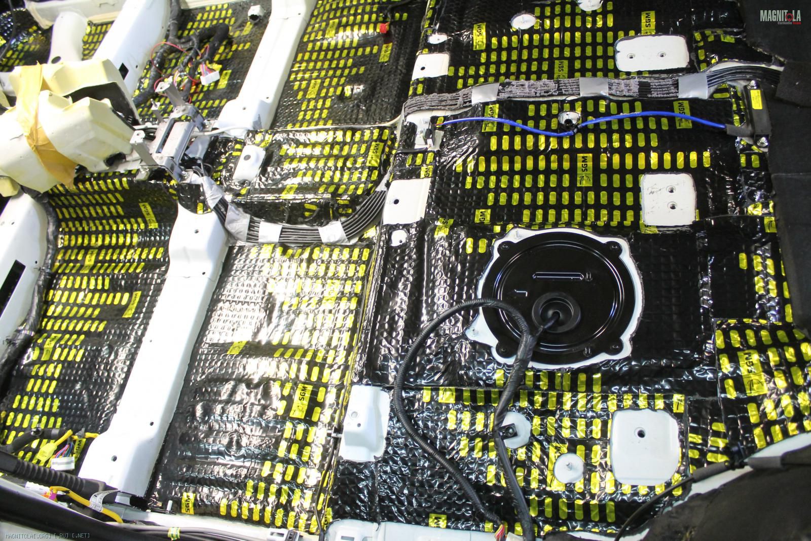 За ковром войлок высокой плотности 10-15мм, далее еще слой войлока вместе с вспененной резиной толщиной 2-8см, далее уже штатная виброизоляция...
