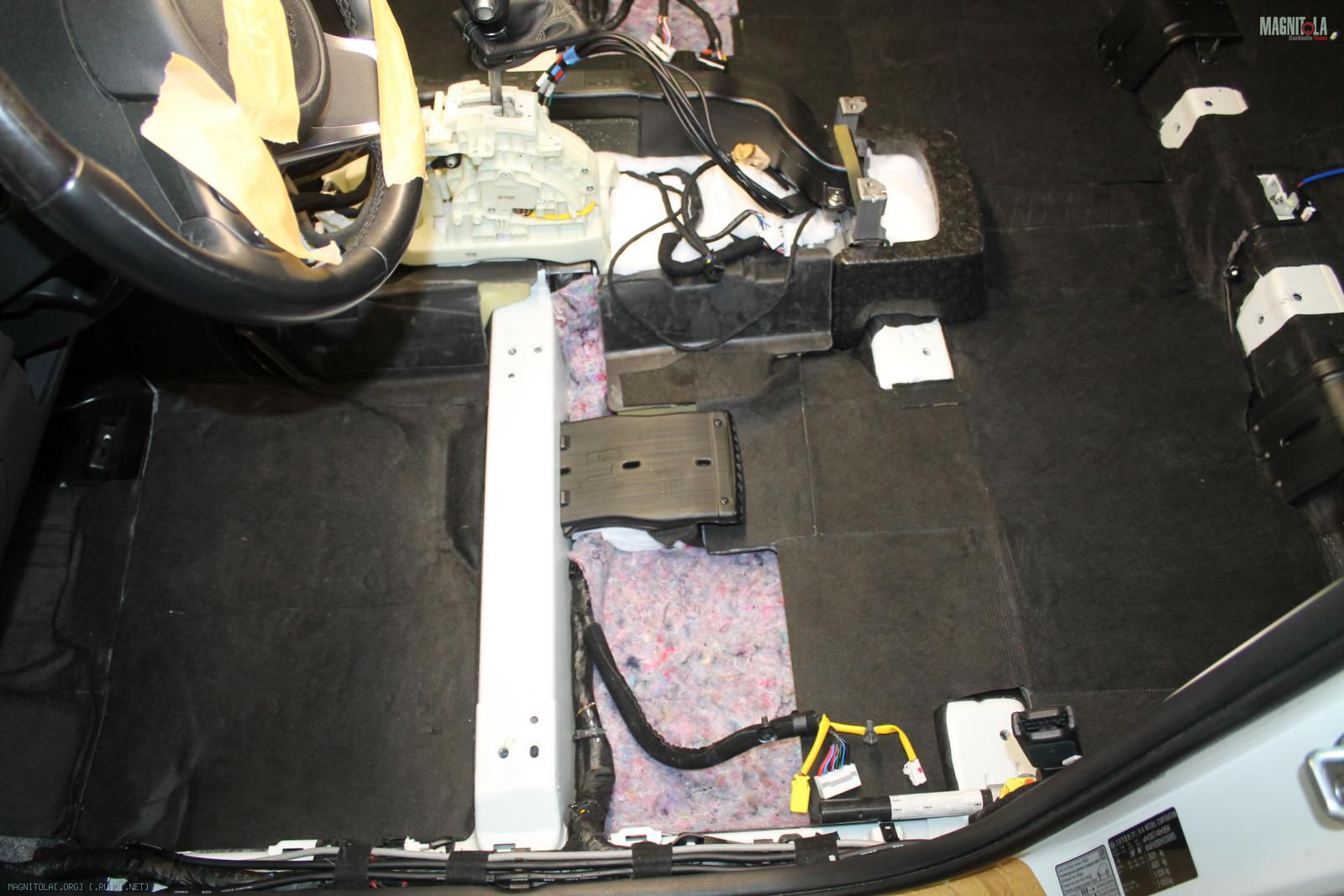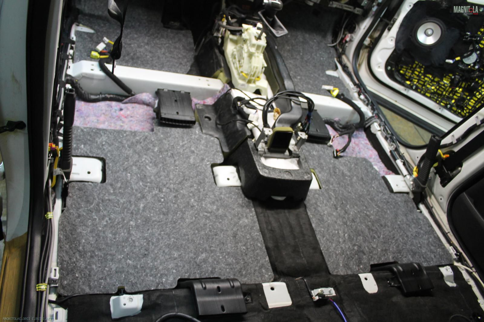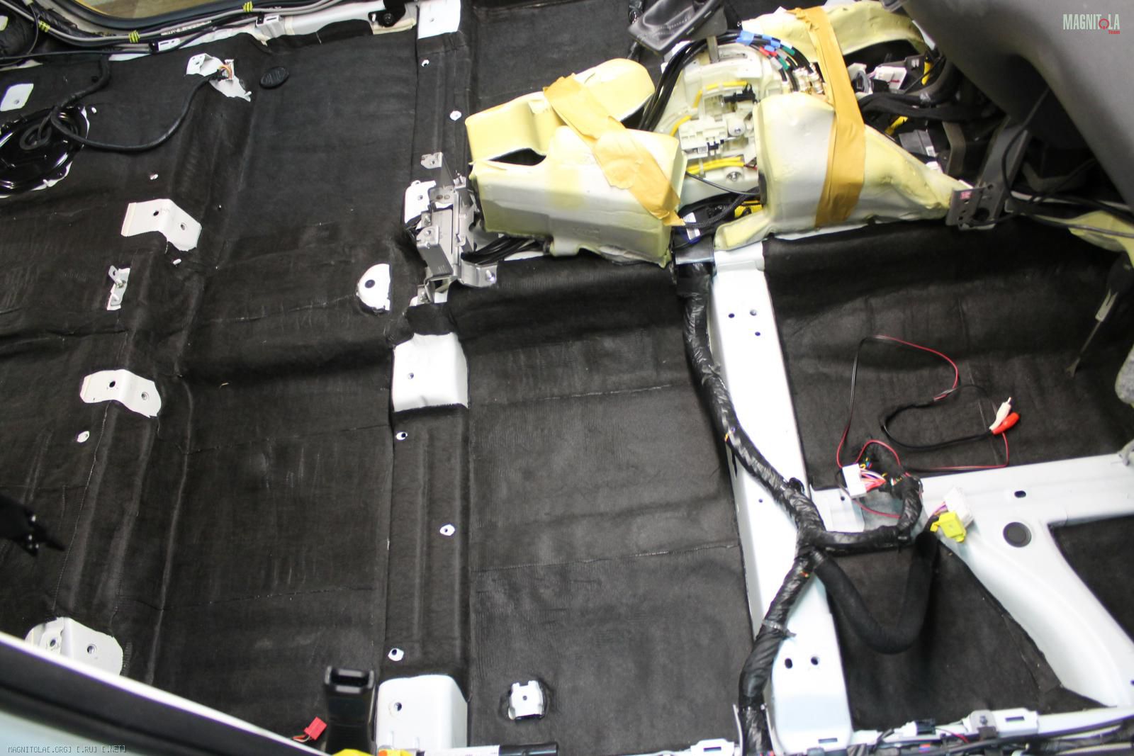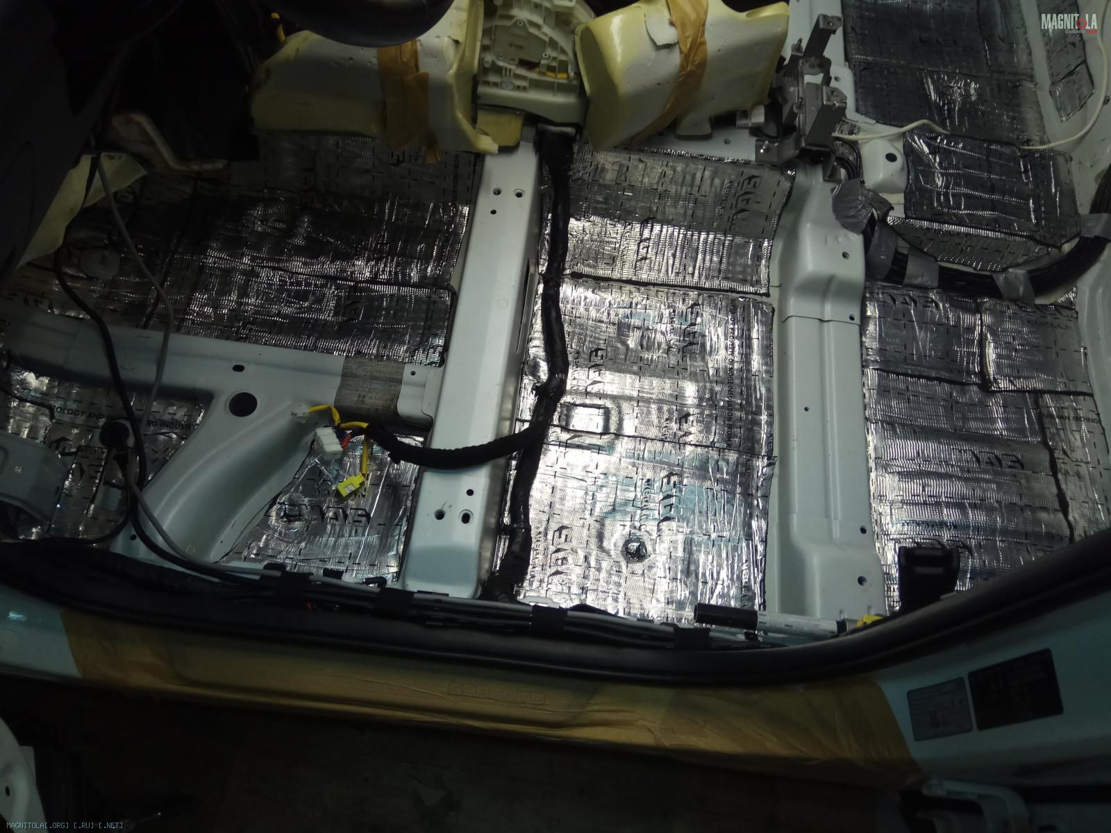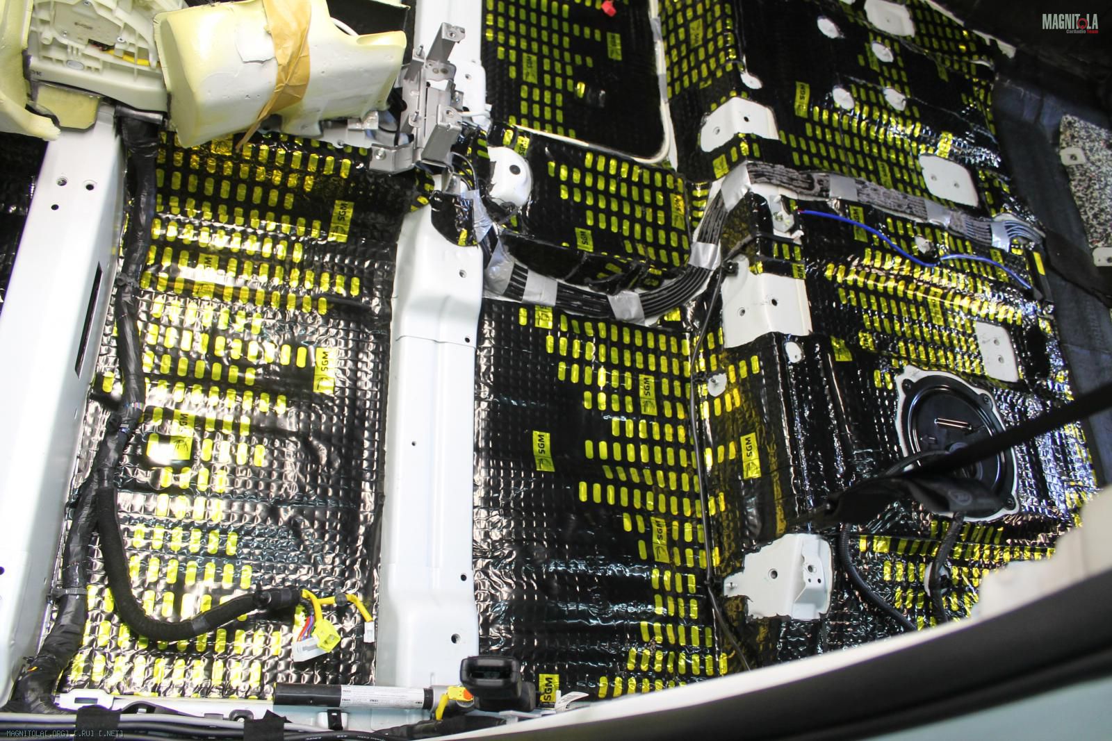 За ковром войлок высокой плотности 10-15мм, далее еще слой войлока вместе с вспененной резиной толщиной 2-8см, далее уже штатная виброизоляция...