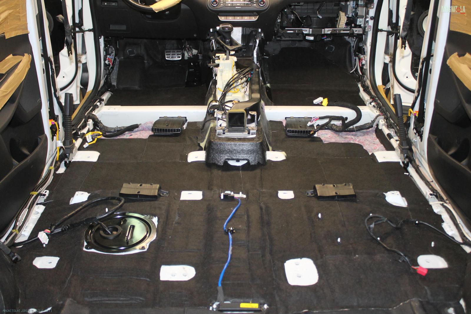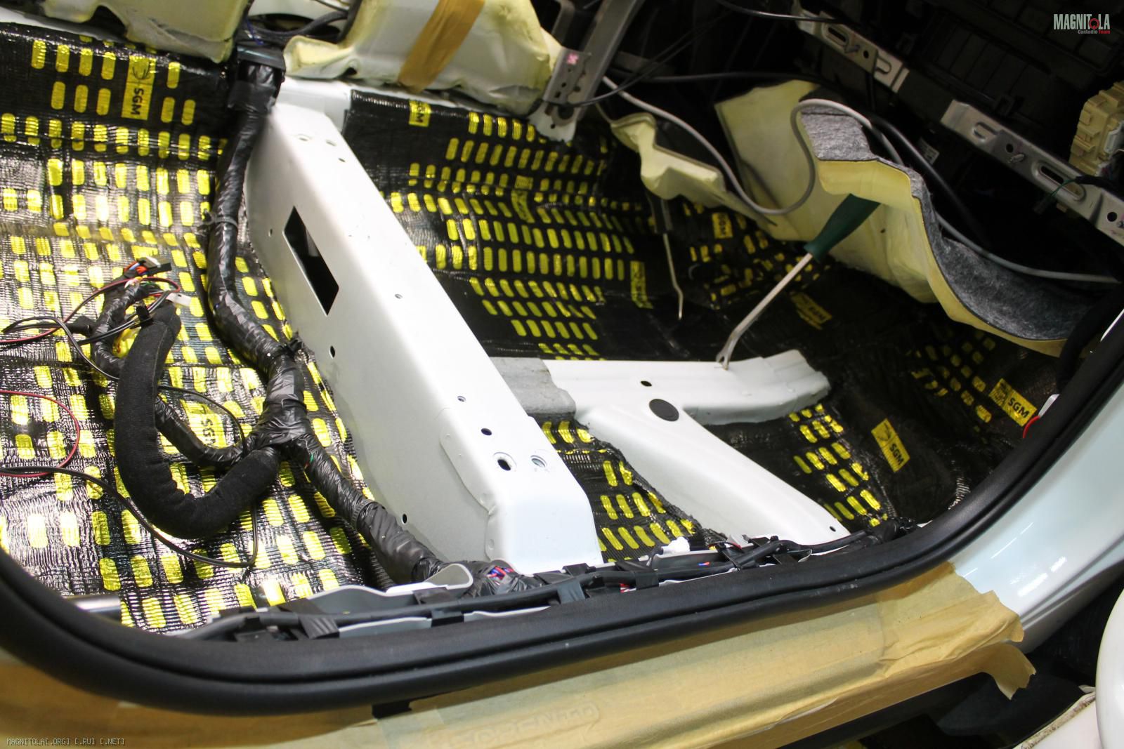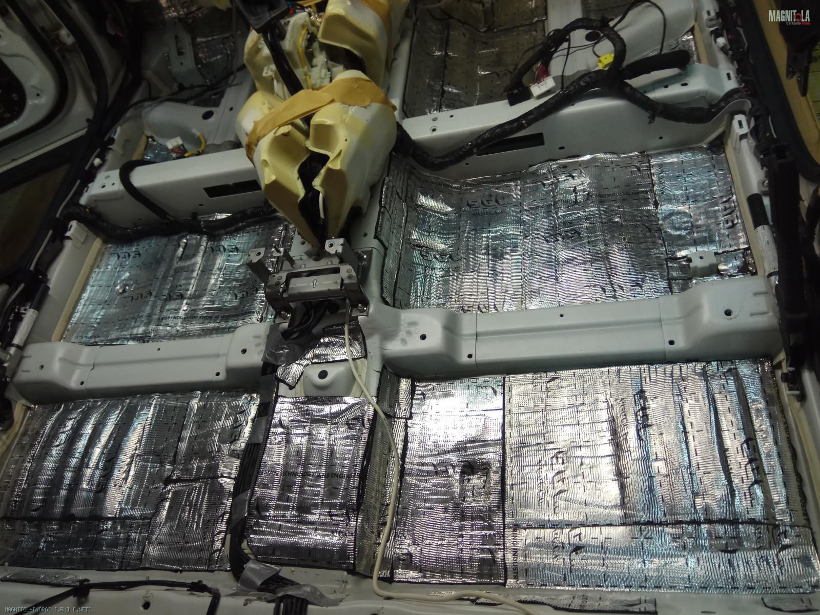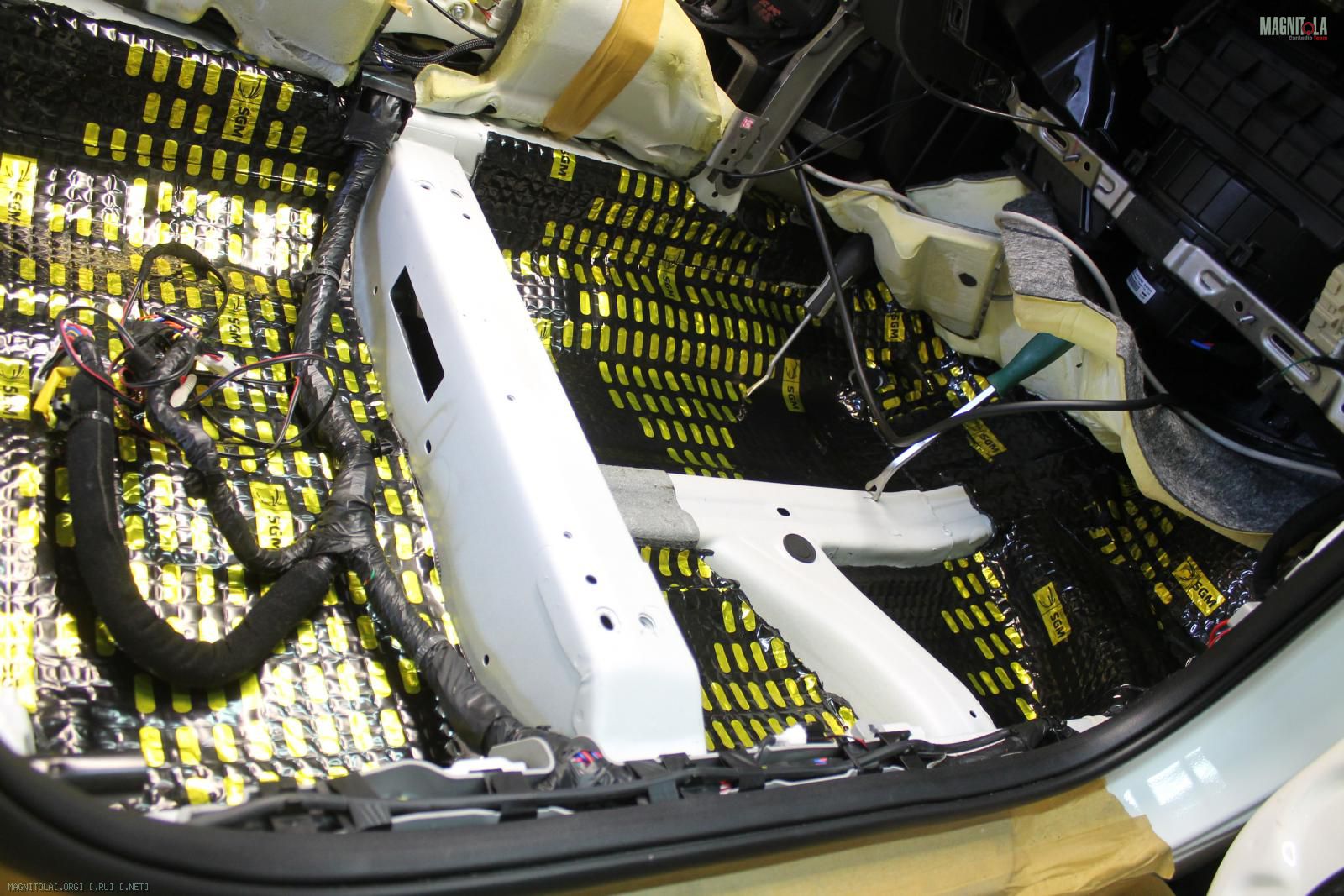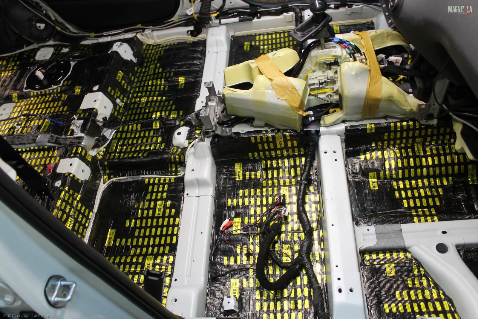 За ковром войлок высокой плотности 10-15мм, далее еще слой войлока вместе с вспененной резиной толщиной 2-8см, далее уже штатная виброизоляция...