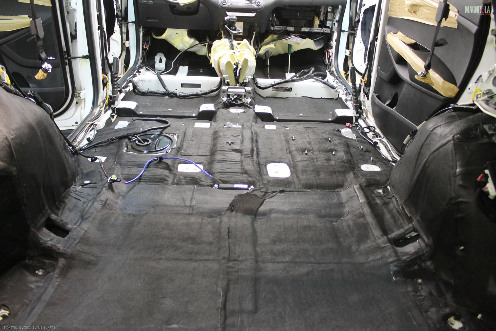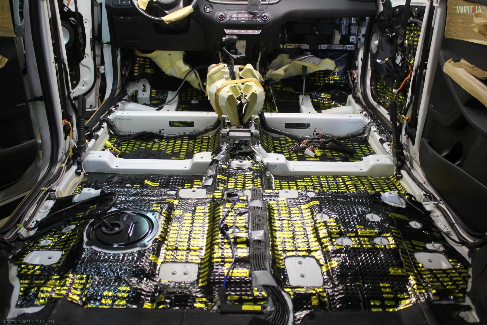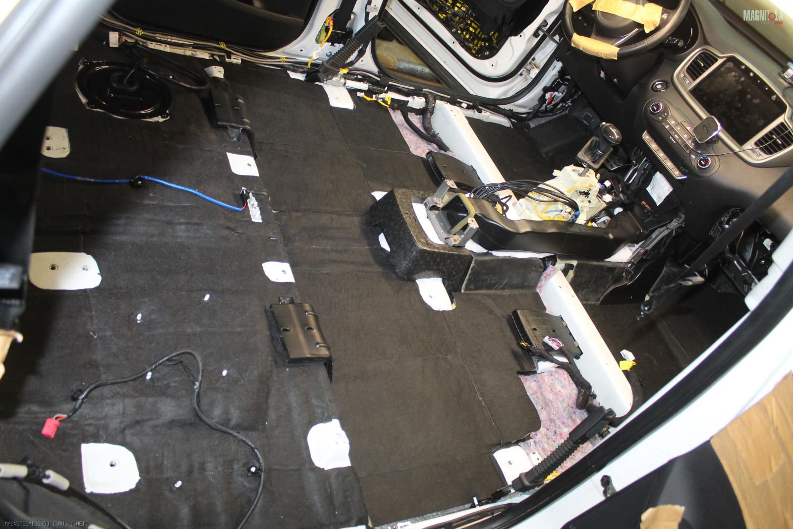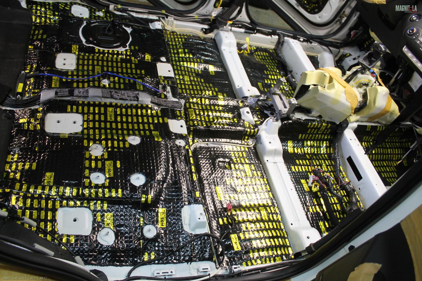 За ковром войлок высокой плотности 10-15мм, далее еще слой войлока вместе с вспененной резиной толщиной 2-8см, далее уже штатная виброизоляция...