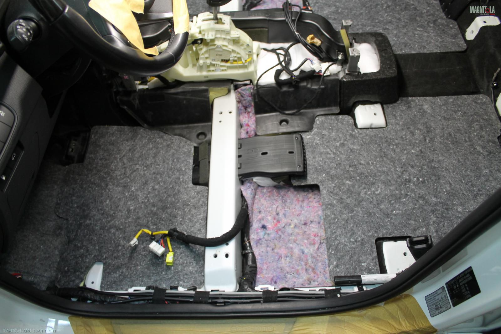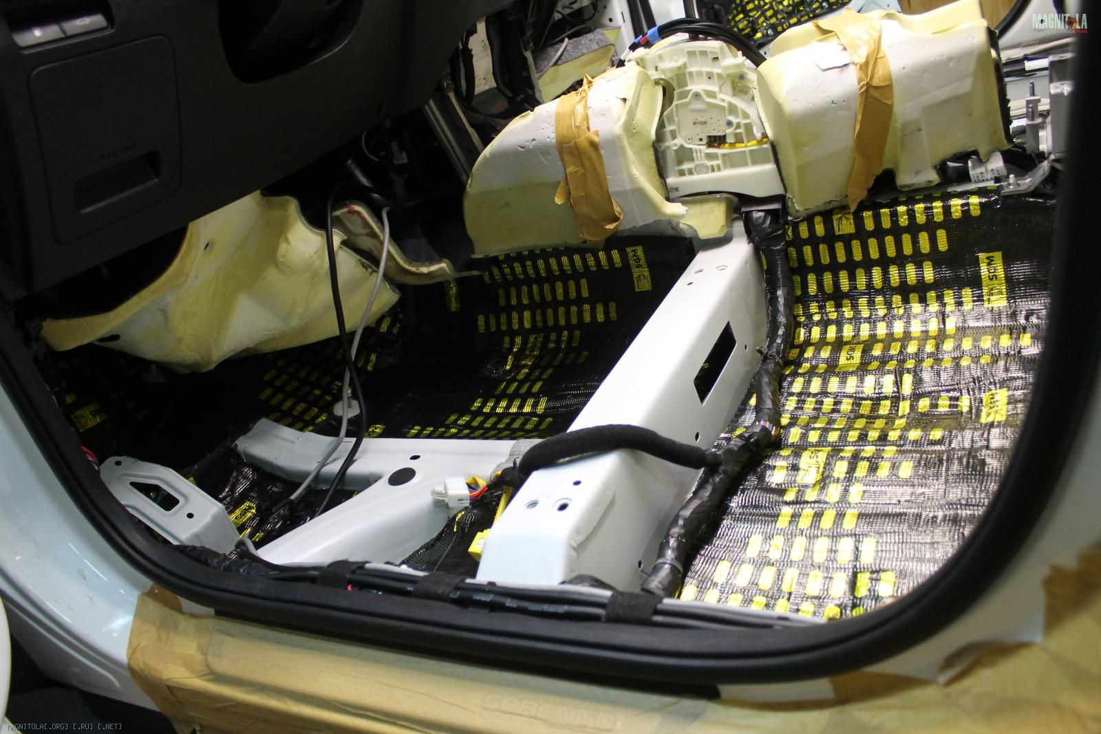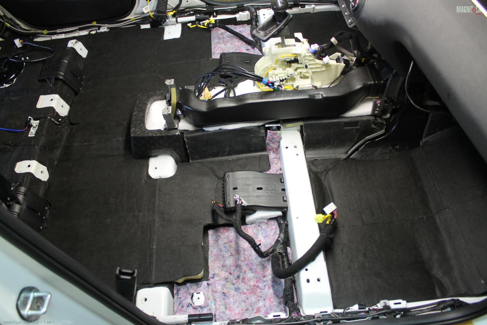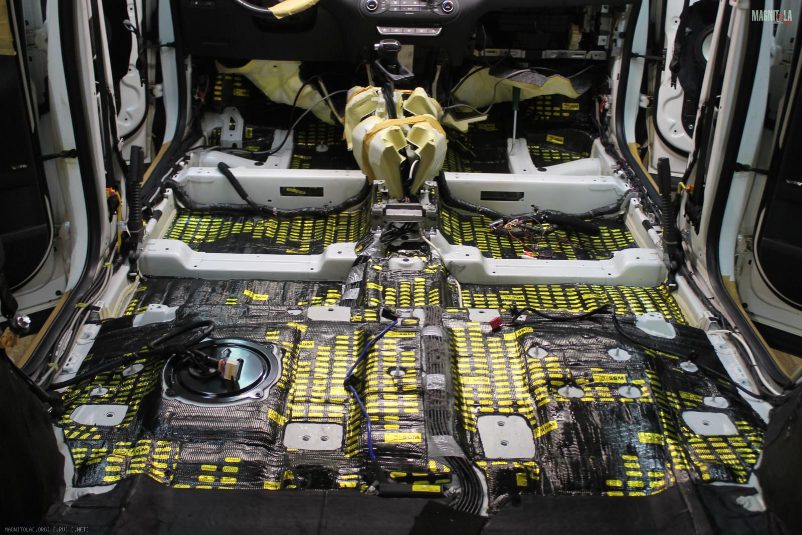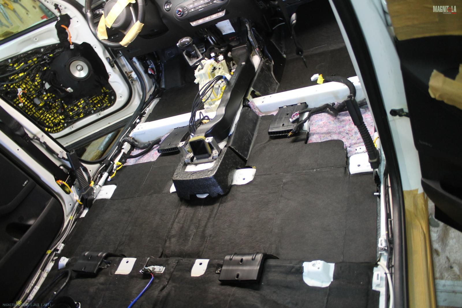 За ковром войлок высокой плотности 10-15мм, далее еще слой войлока вместе с вспененной резиной толщиной 2-8см, далее уже штатная виброизоляция...