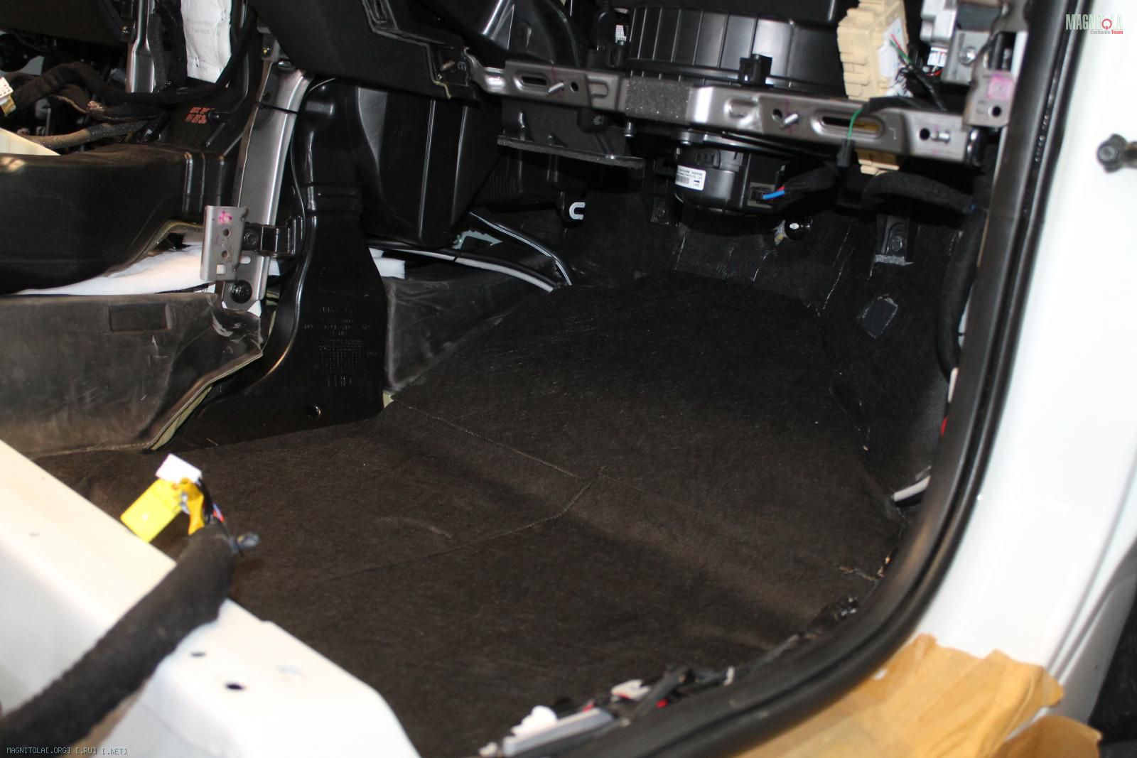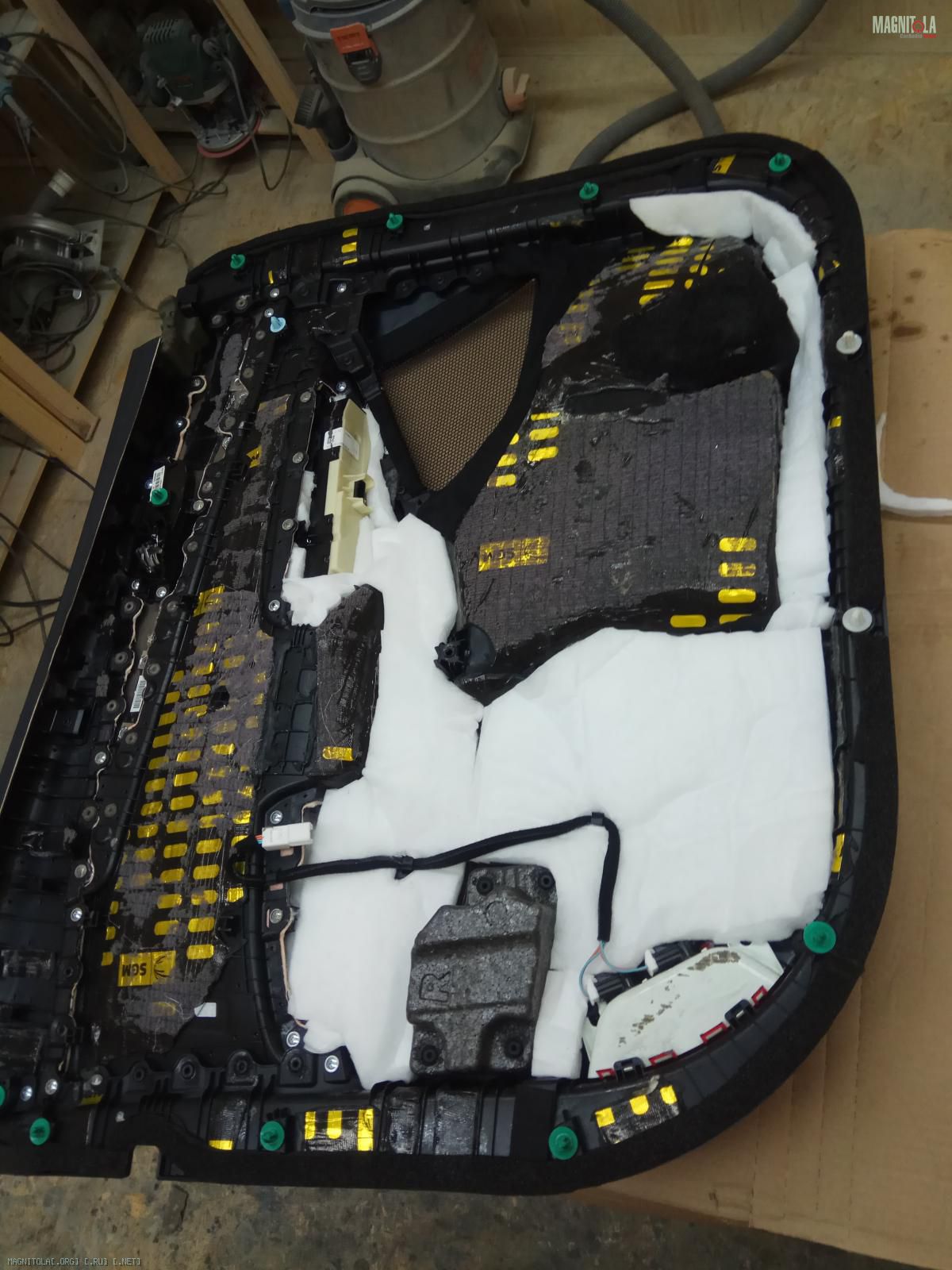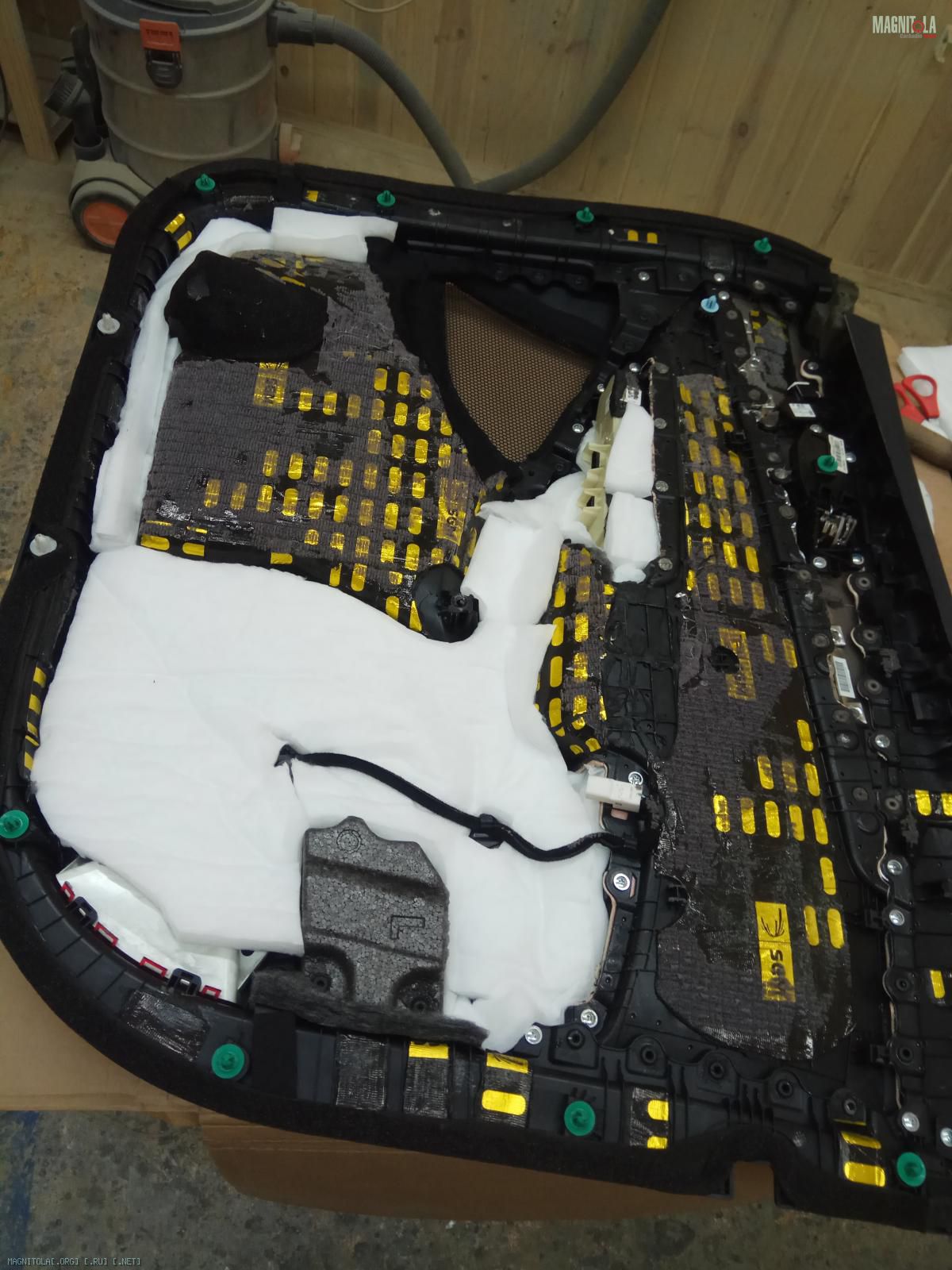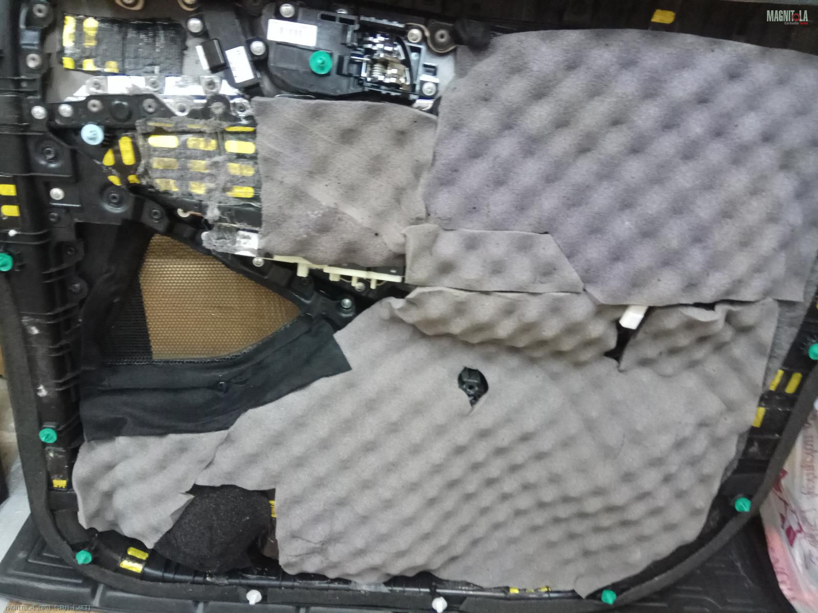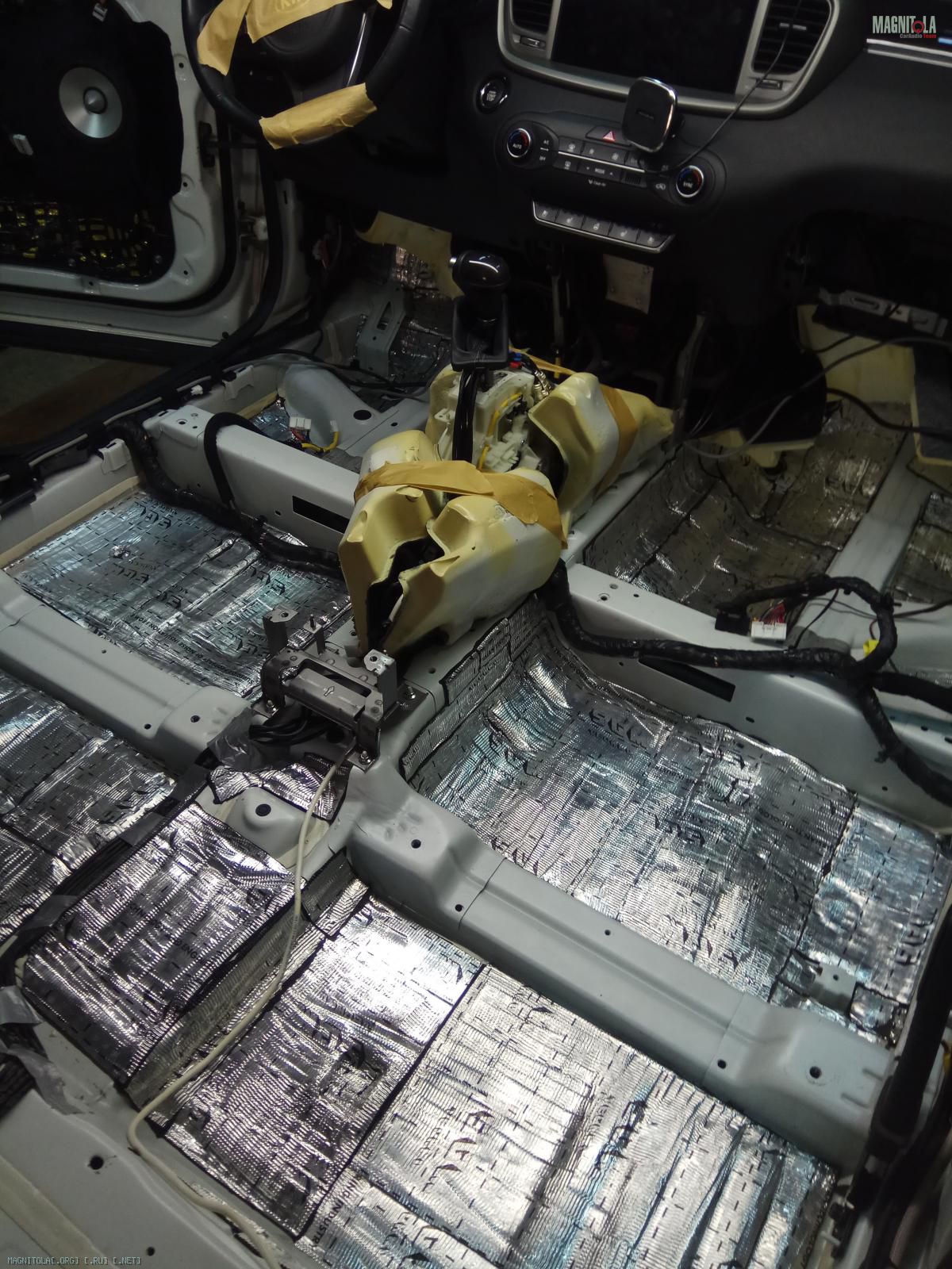 За ковром войлок высокой плотности 10-15мм, далее еще слой войлока вместе с вспененной резиной толщиной 2-8см, далее уже штатная виброизоляция...