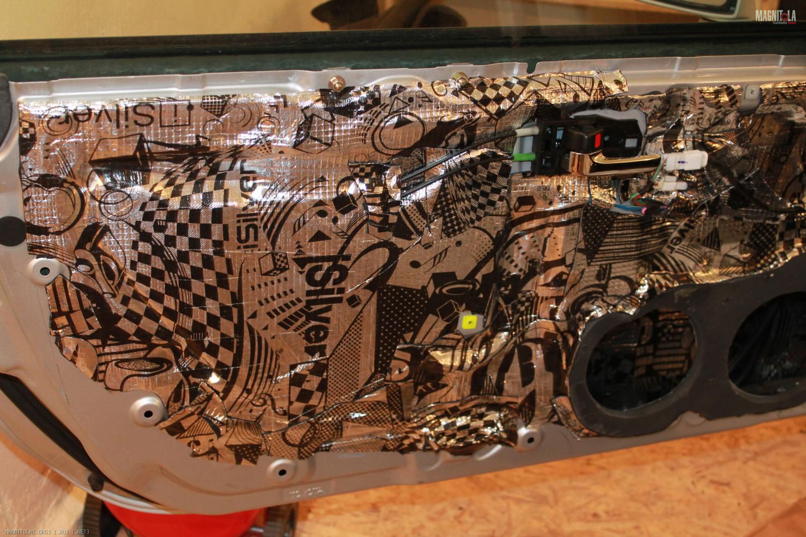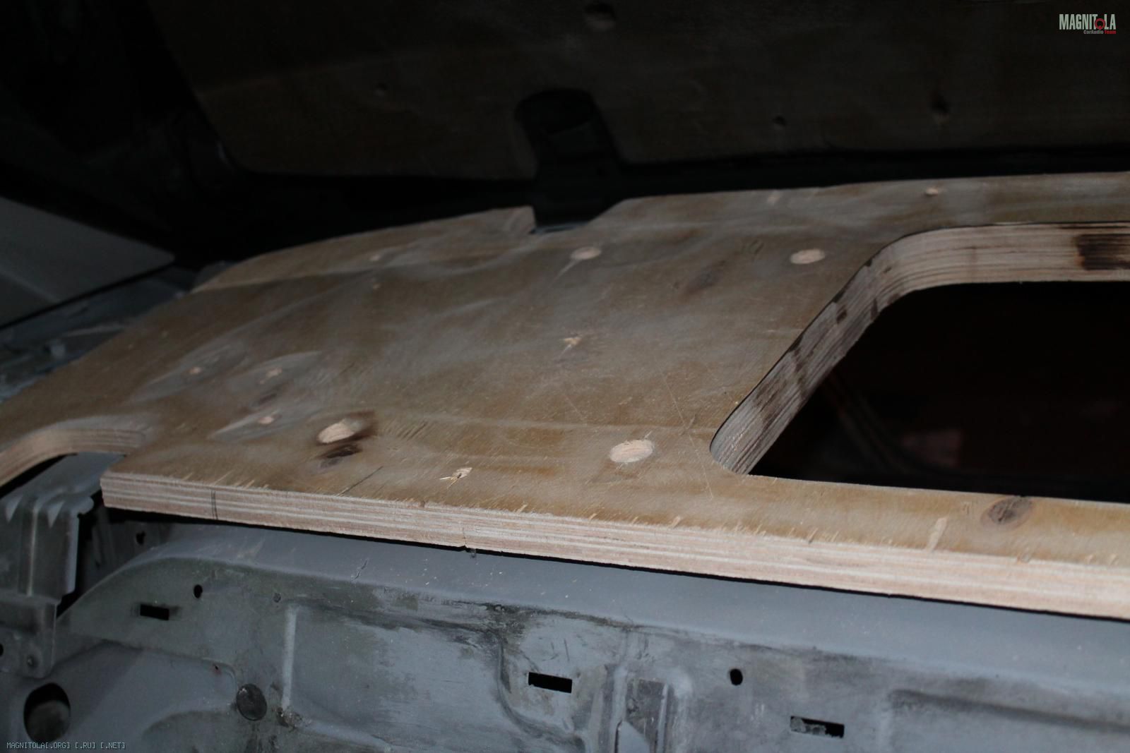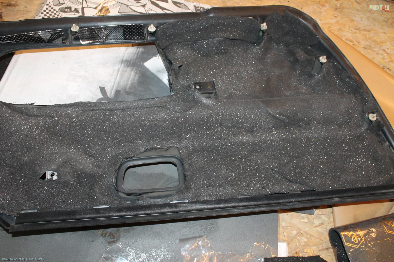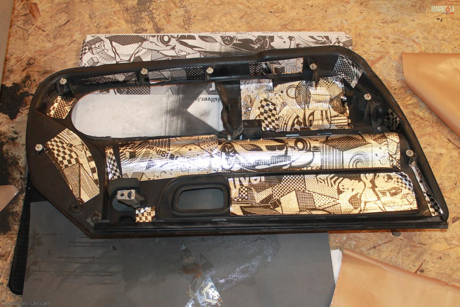 Двери, технологические отверстия закрываем фанерой, очищаем и обезжириваем от пыли для дальнейшей шумоизоляции