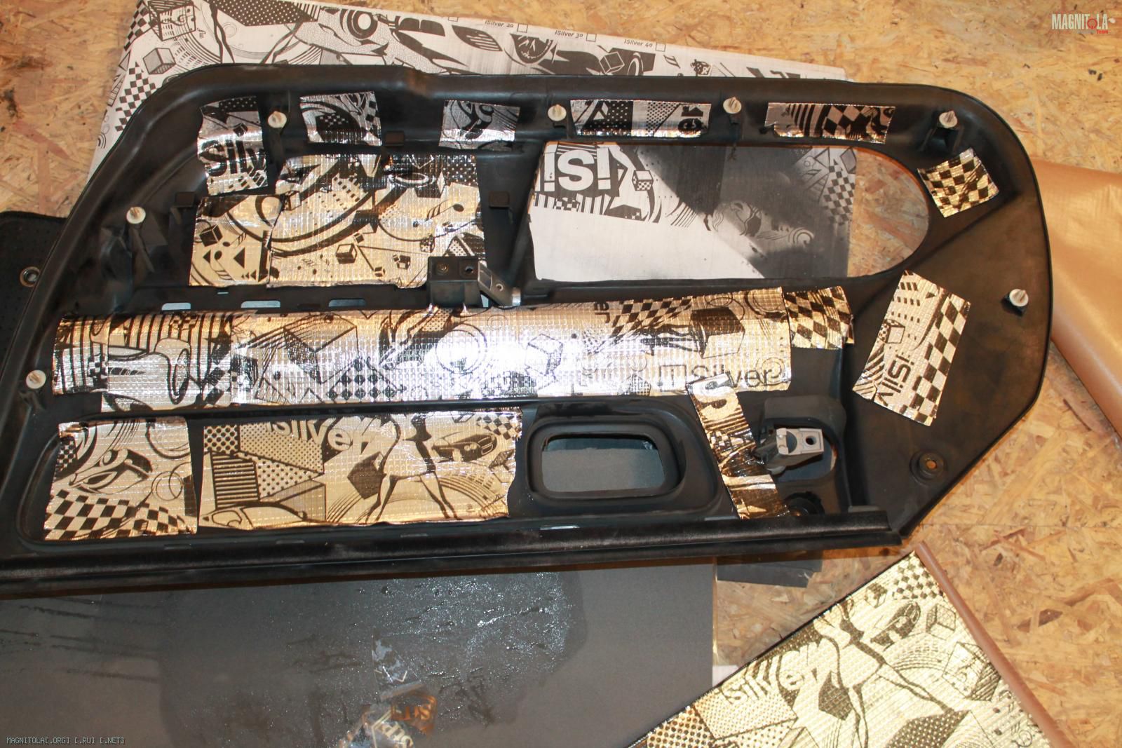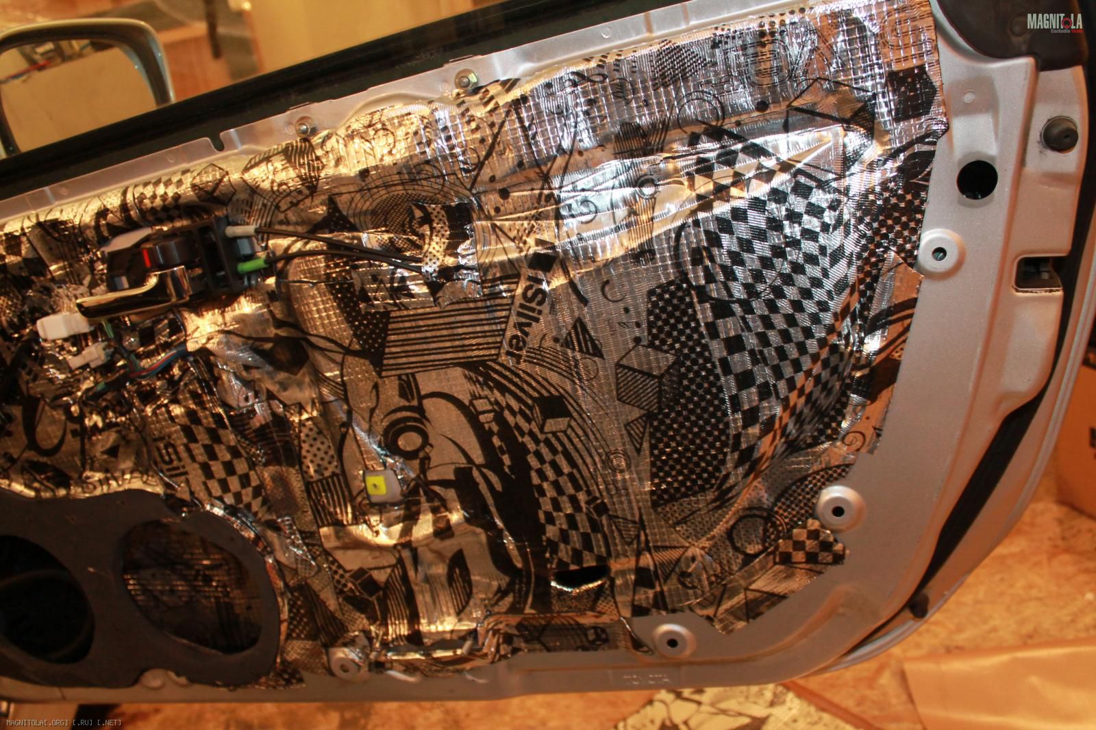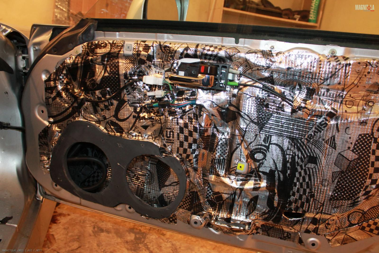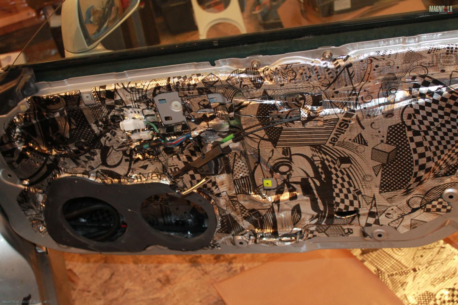 Двери, технологические отверстия закрываем фанерой, очищаем и обезжириваем от пыли для дальнейшей шумоизоляции