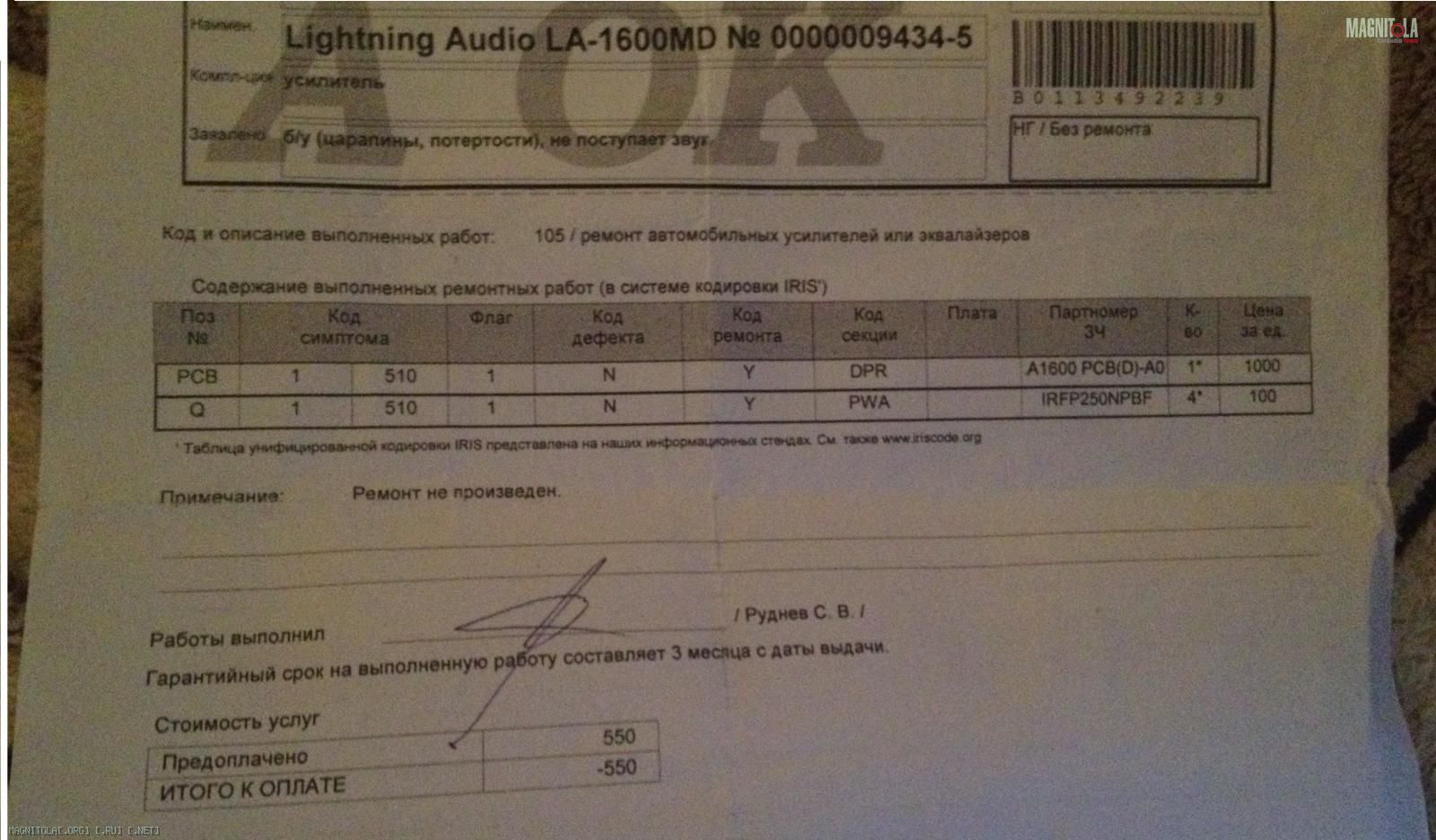 Добрый вечер. не могли бы вы мне помочь с ремонтом усилителя. Есть пара вопросов к Вам. имеется усилитель lightning audio la 1600 md в один прекрасный день он просто перестал играть, в защиту не уходит. возил в сервисный центр по пост гарантийному ремонту сказали что запчастей на него нет. есть вот такой вот листок к нему