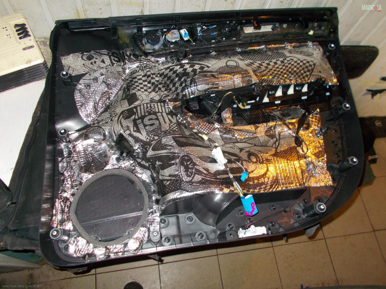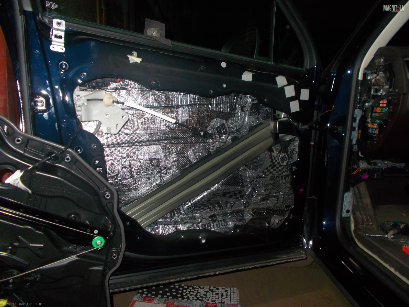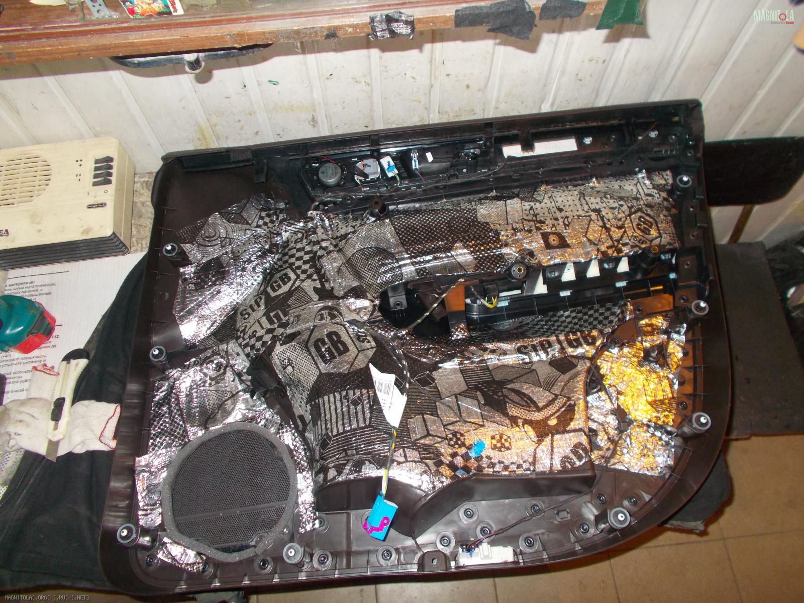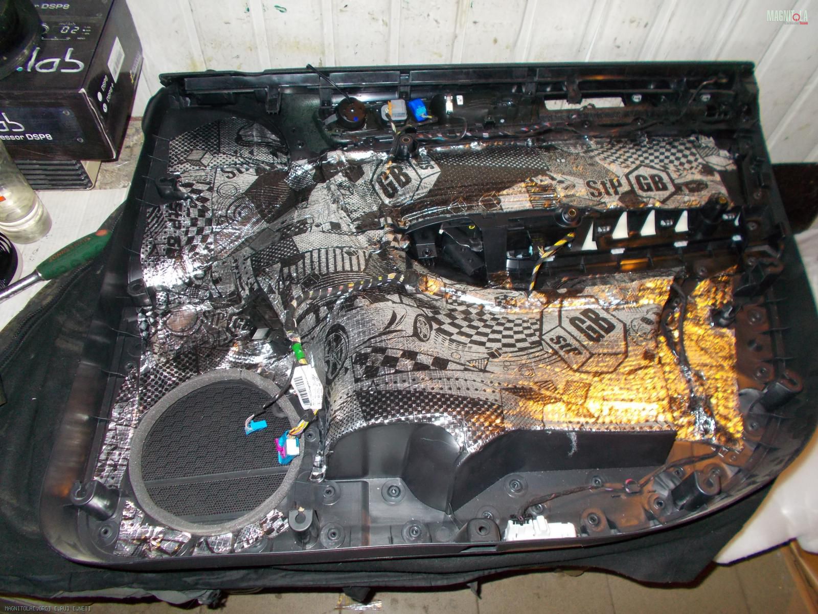 Сделана полная шумоизоляция передних дверей в 4 слоя каждая. Через штатные фишки протаскиваем две пары проводов: 2,5 кв на НЧ и 1,5 квадрата на ВЧ. В собранном виде все полный сток! Задние двери проклеены частично. Внешний щит и карты дверей проклеены подарком.