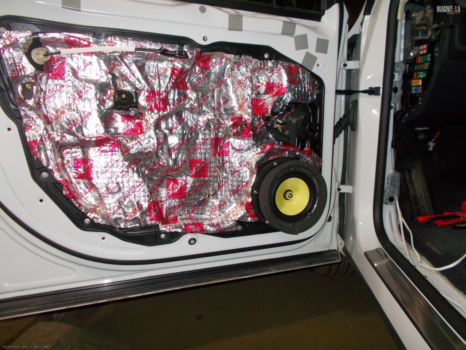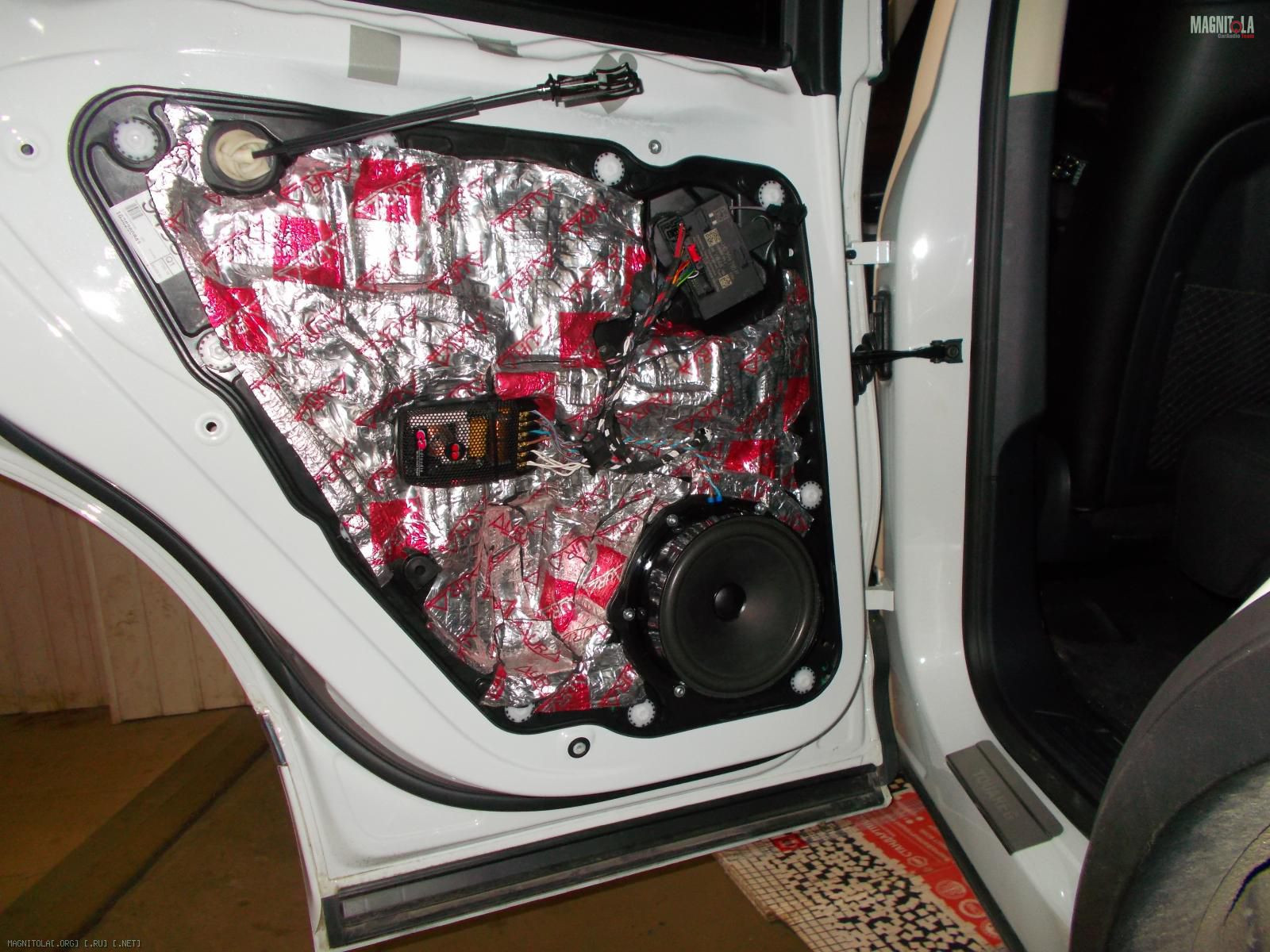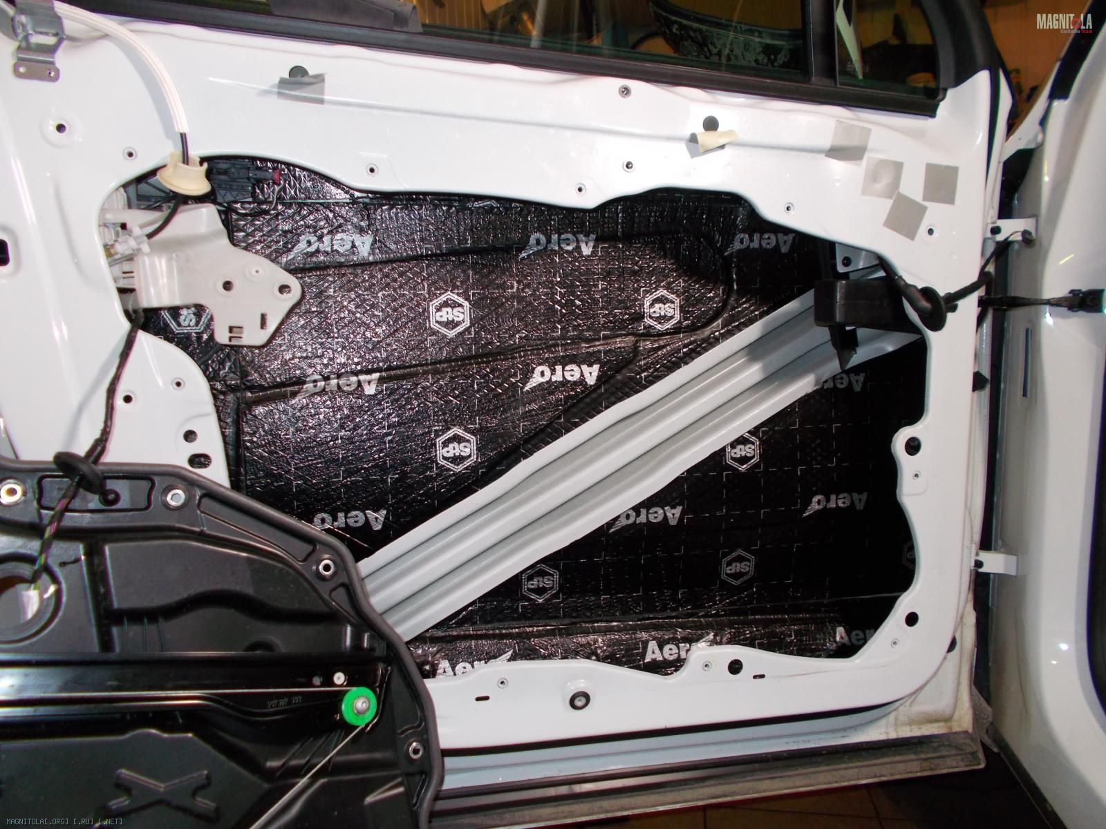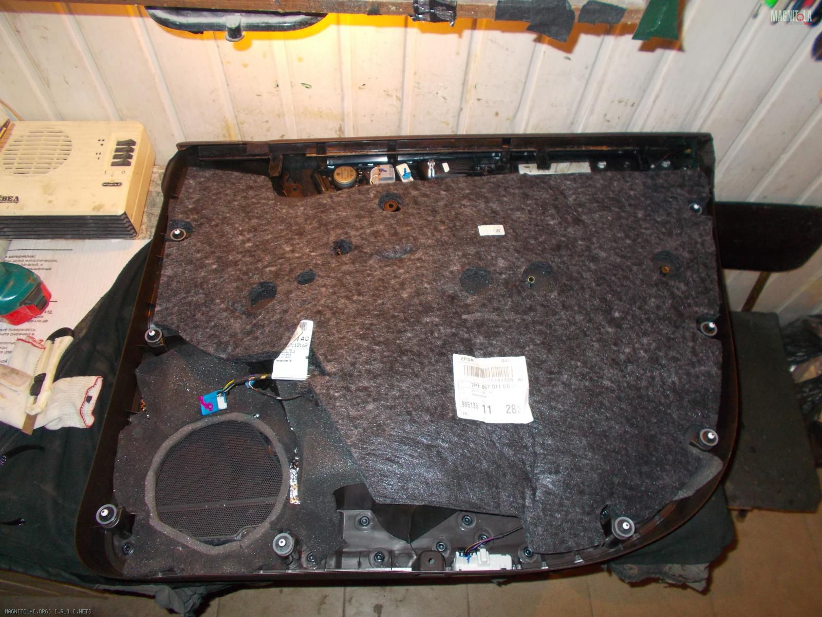 Сделана полная шумоизоляция передних дверей в 4 слоя каждая. Через штатные фишки протаскиваем две пары проводов: 2,5 кв на НЧ и 1,5 квадрата на ВЧ. В собранном виде все полный сток! Задние двери проклеены частично. Внешний щит и карты дверей проклеены подарком.