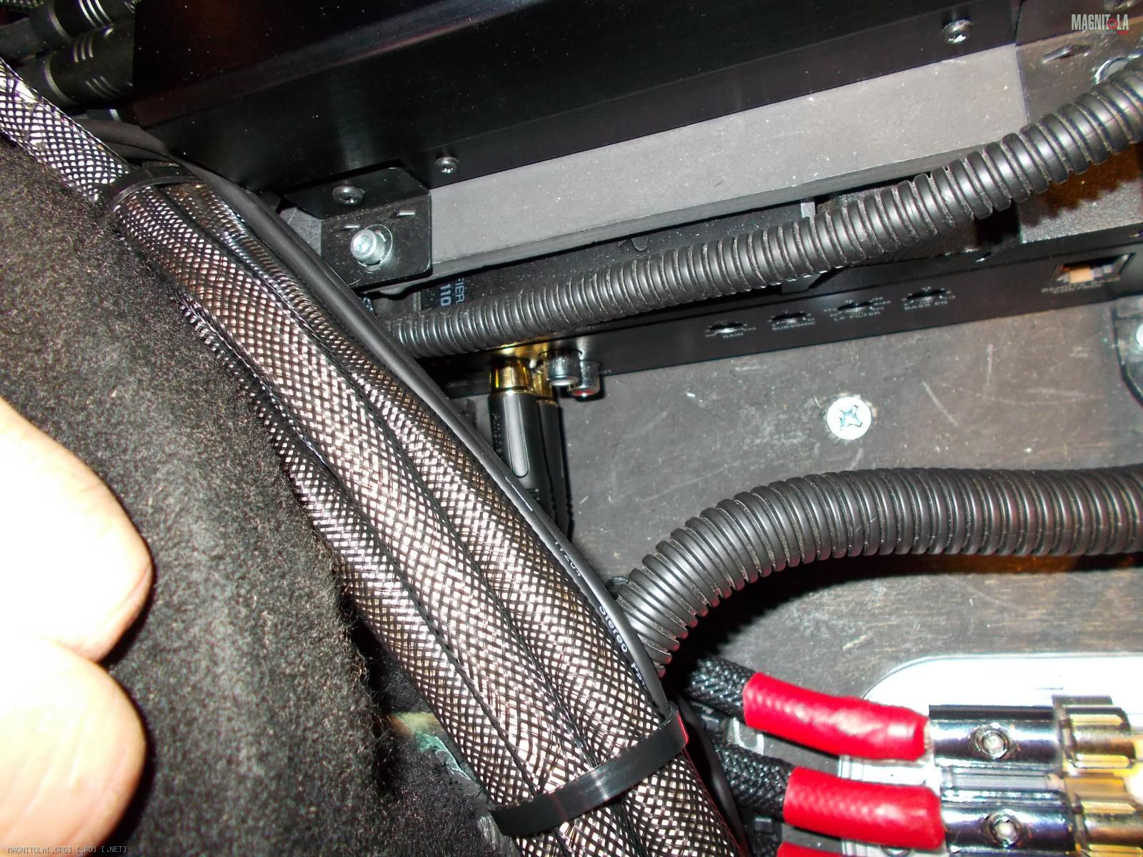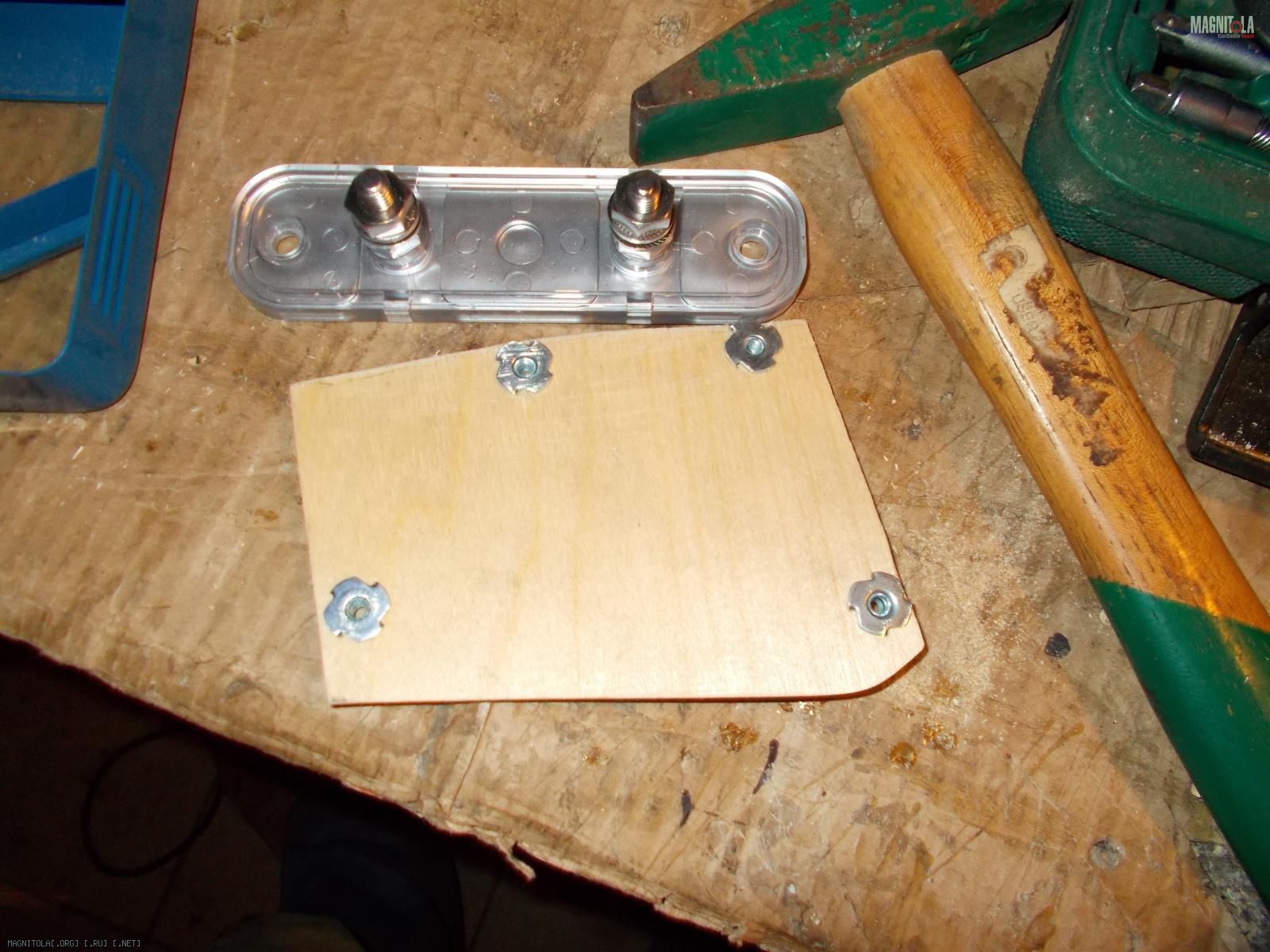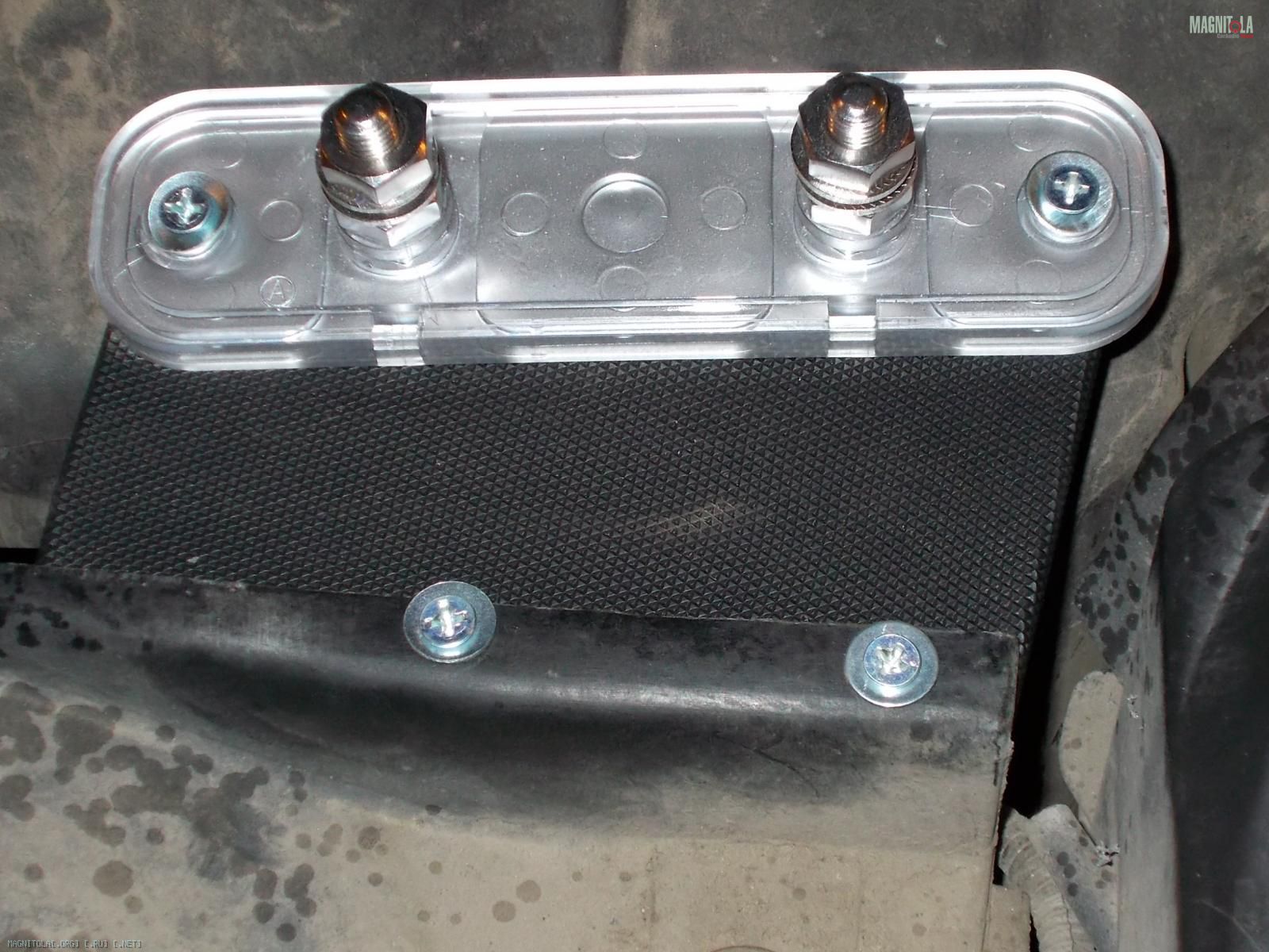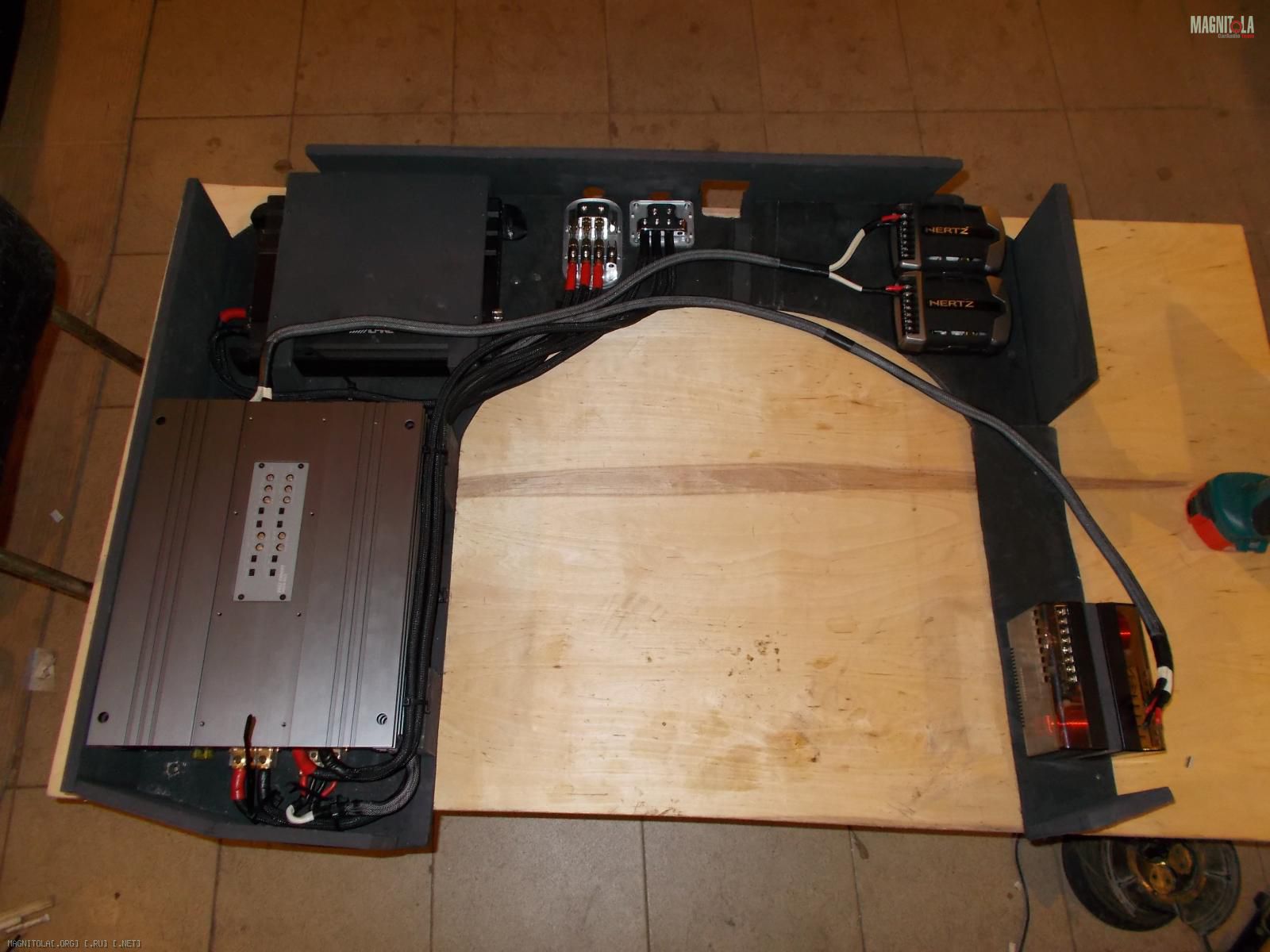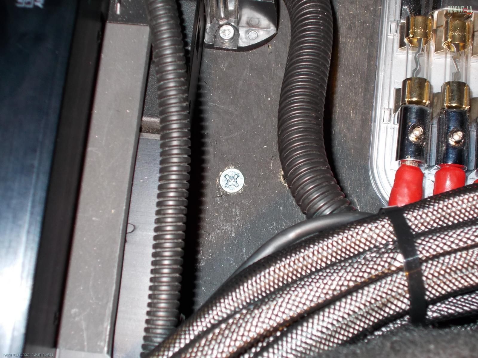 Вся проводка была заменена на новую и уложена под полом в штатном пластиковом кабель-канале. Все концы проводки залужены , к акустике припаяны. Усилитель расположил под штатным полом с левой стороны и закрепил на фальш-панельке, а ее закрепил на болты м6 вкрученные в заранее заклепанные в железо резьбовые заклепки.