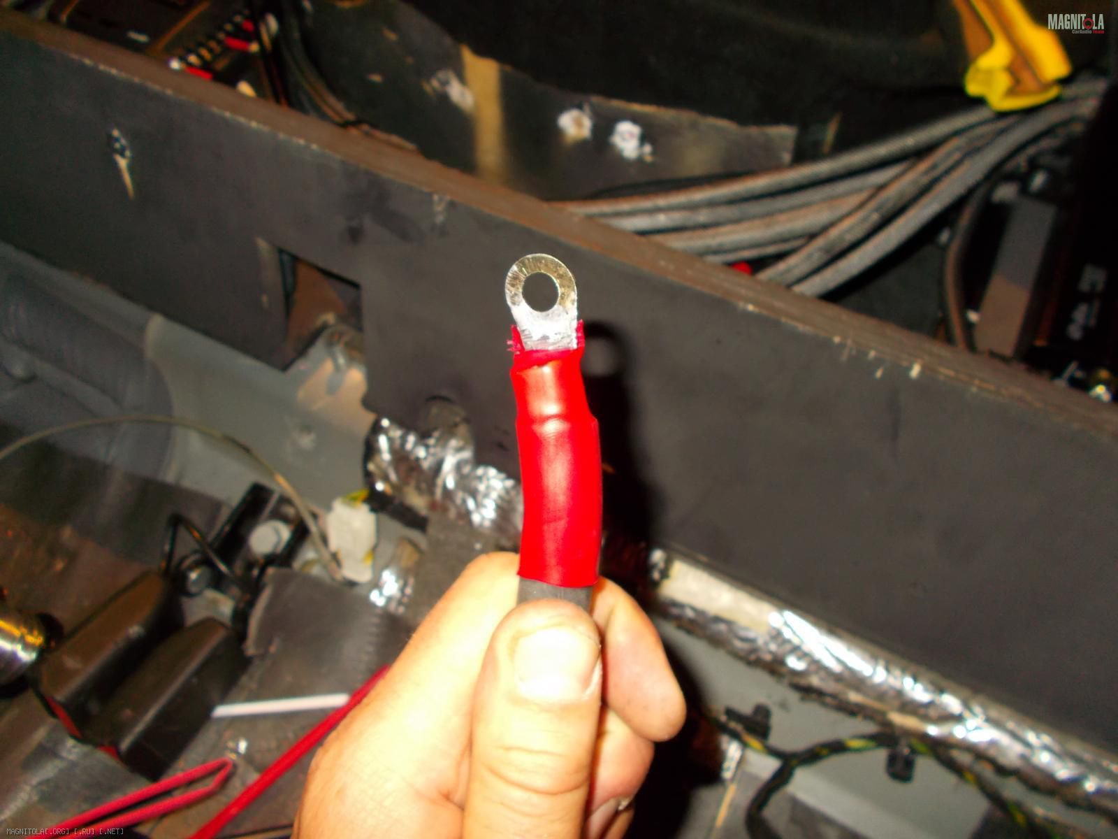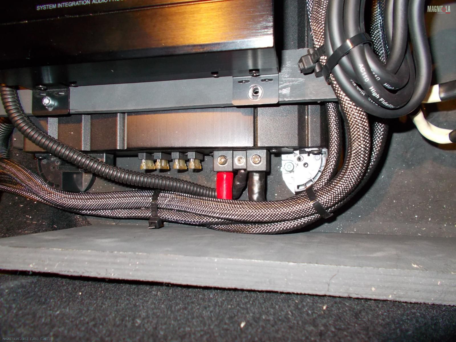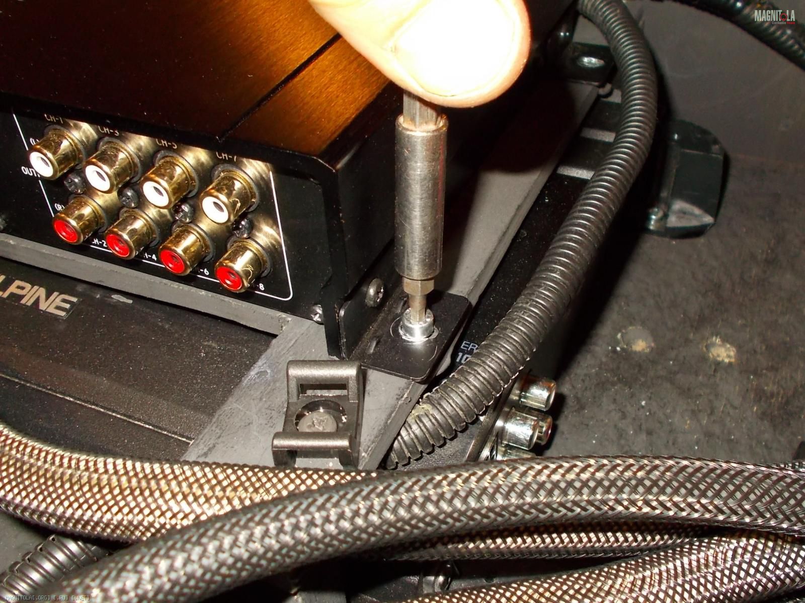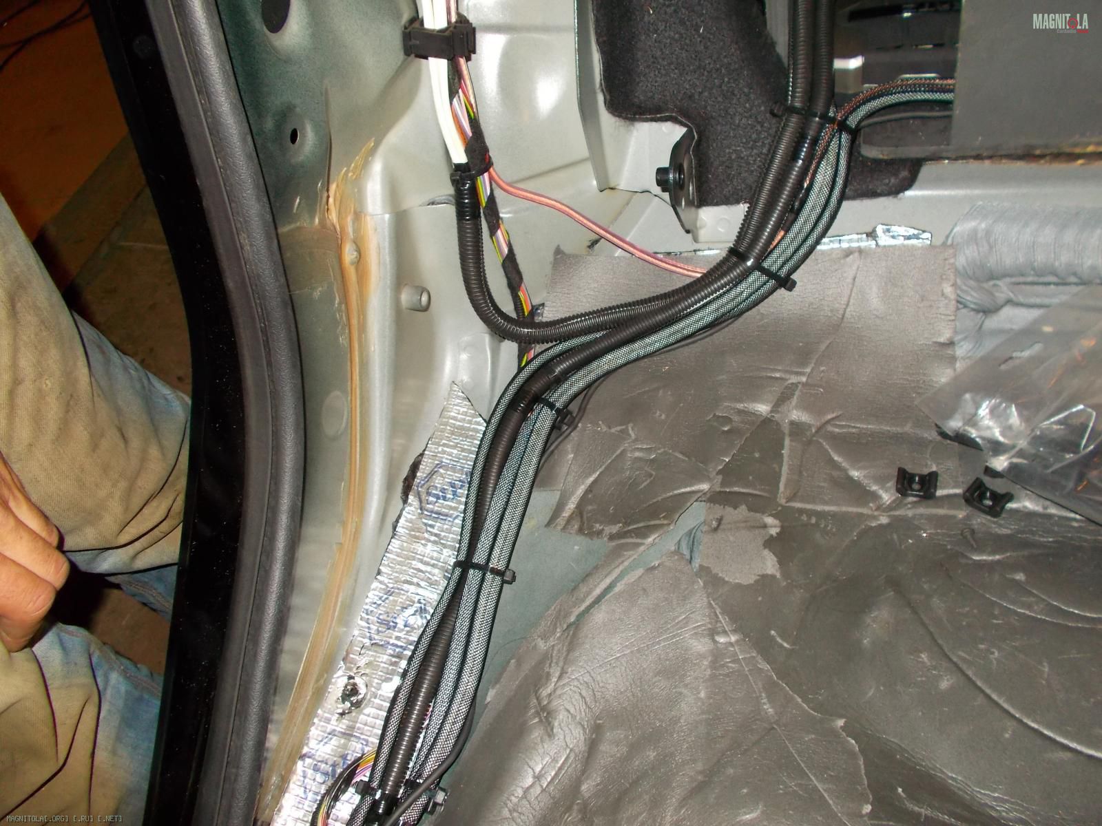 Вся проводка была заменена на новую и уложена под полом в штатном пластиковом кабель-канале. Все концы проводки залужены , к акустике припаяны. Усилитель расположил под штатным полом с левой стороны и закрепил на фальш-панельке, а ее закрепил на болты м6 вкрученные в заранее заклепанные в железо резьбовые заклепки.