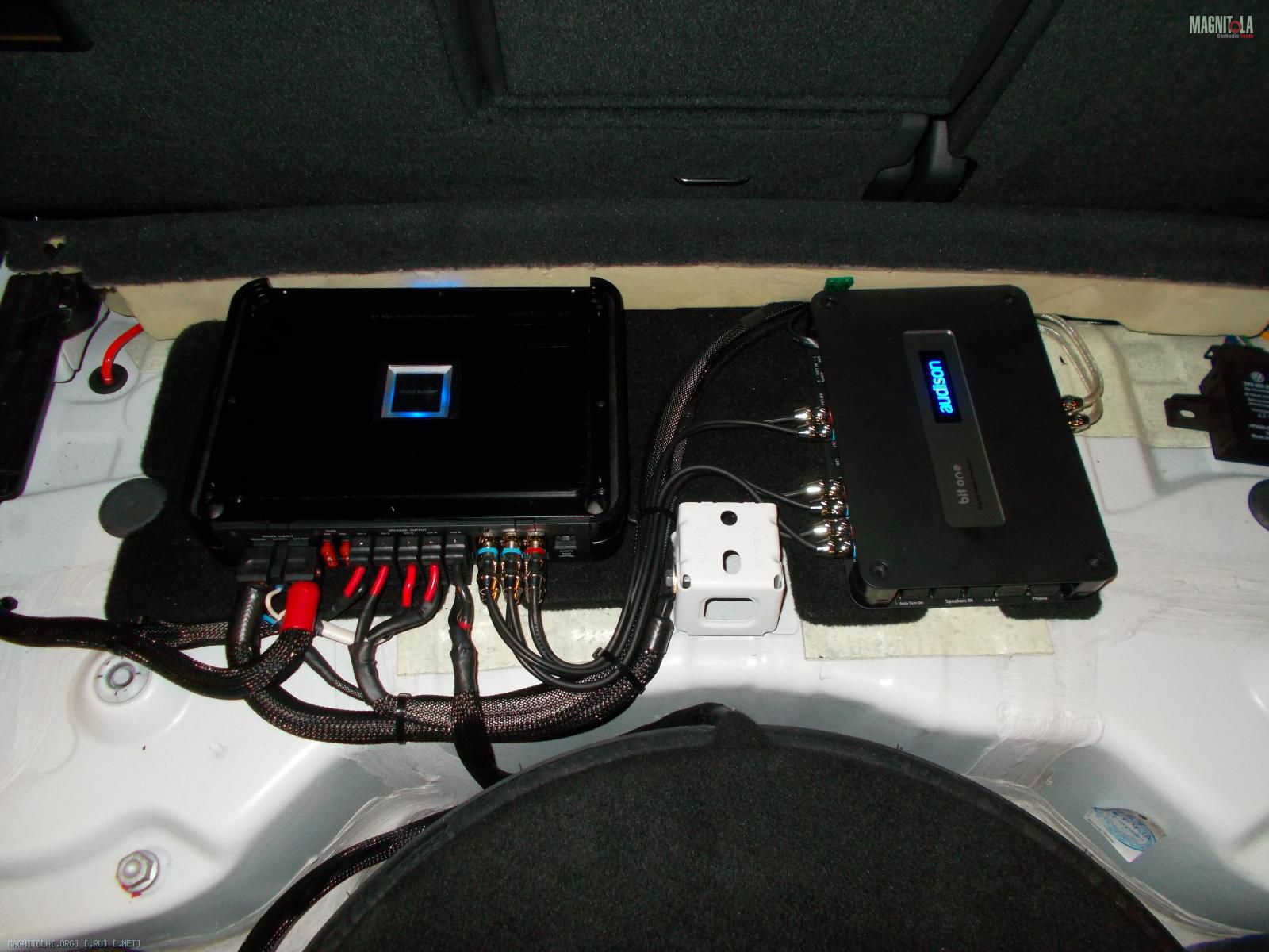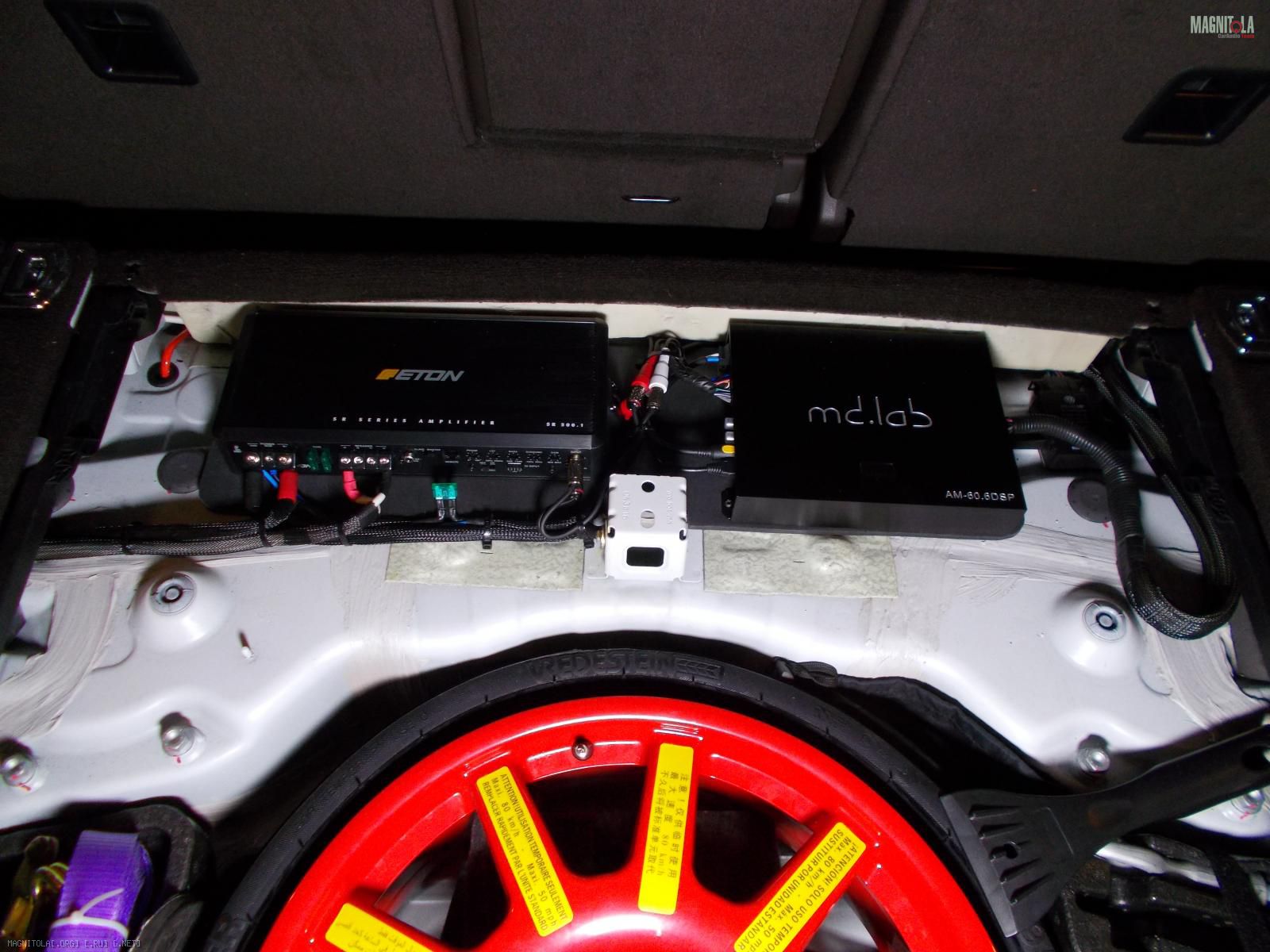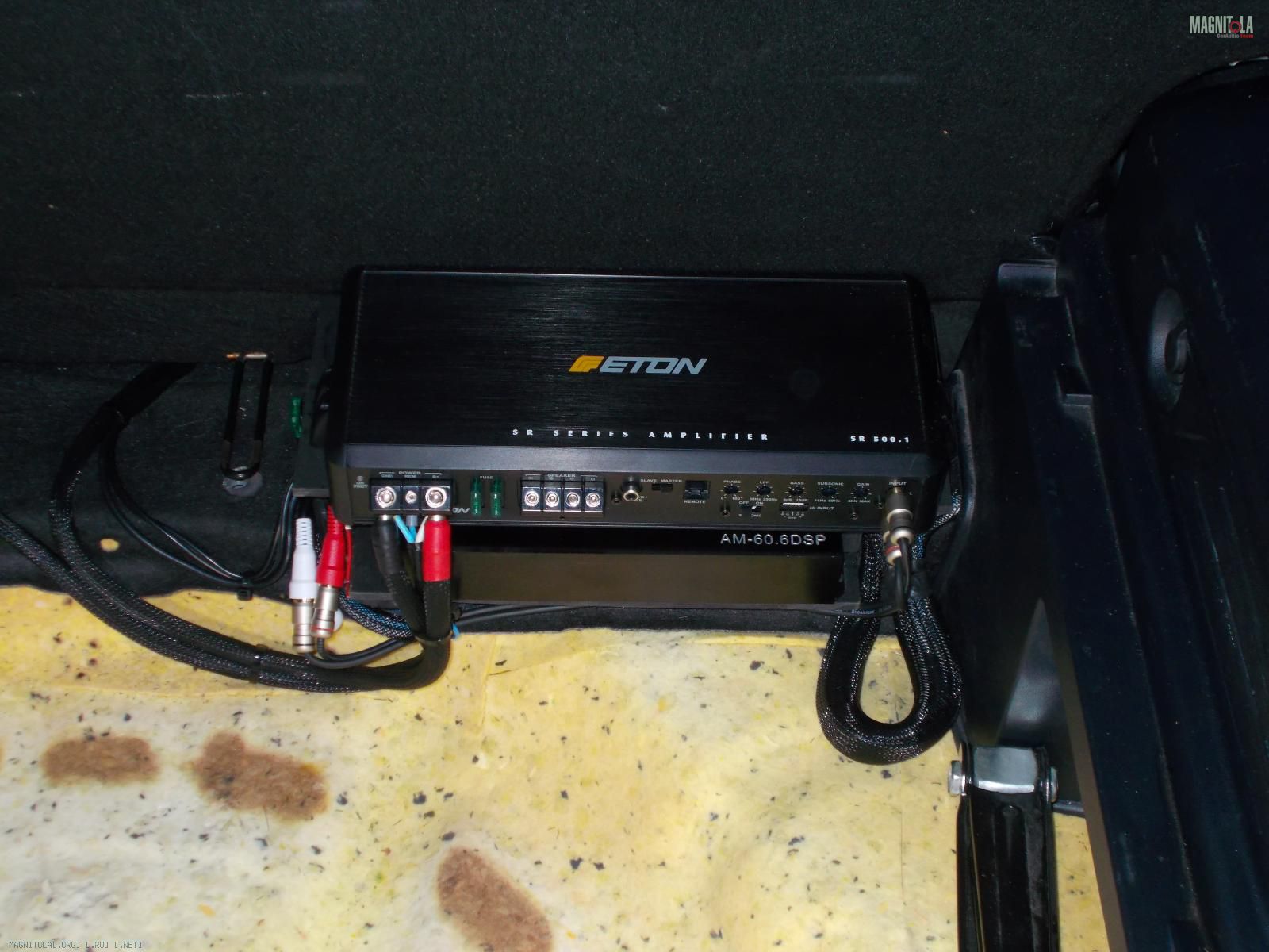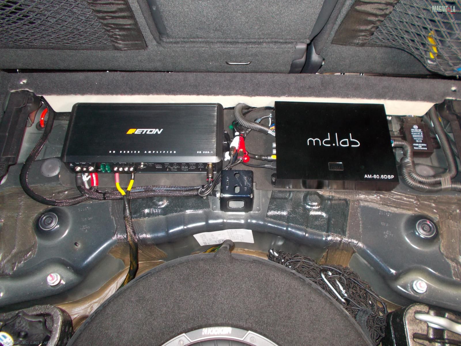 В багажнике, по правую сторону, друг над другом, компактно расположились два усилителя.