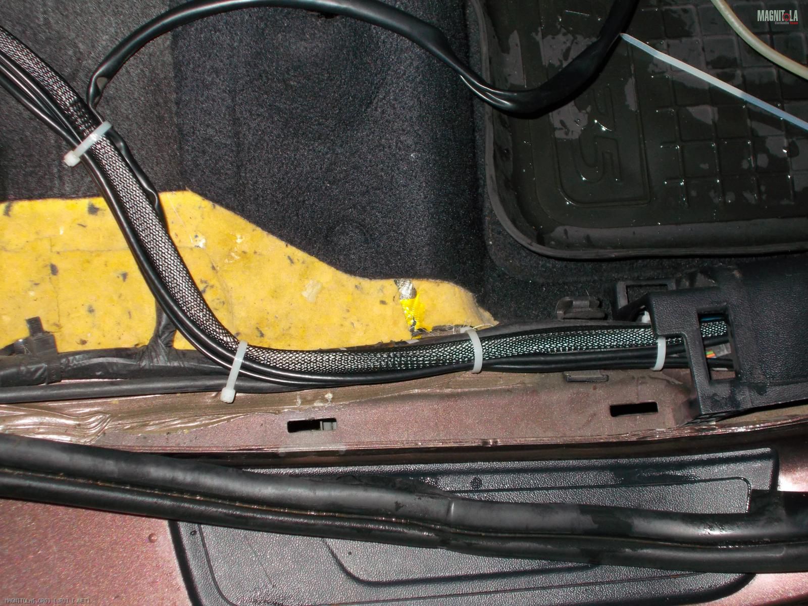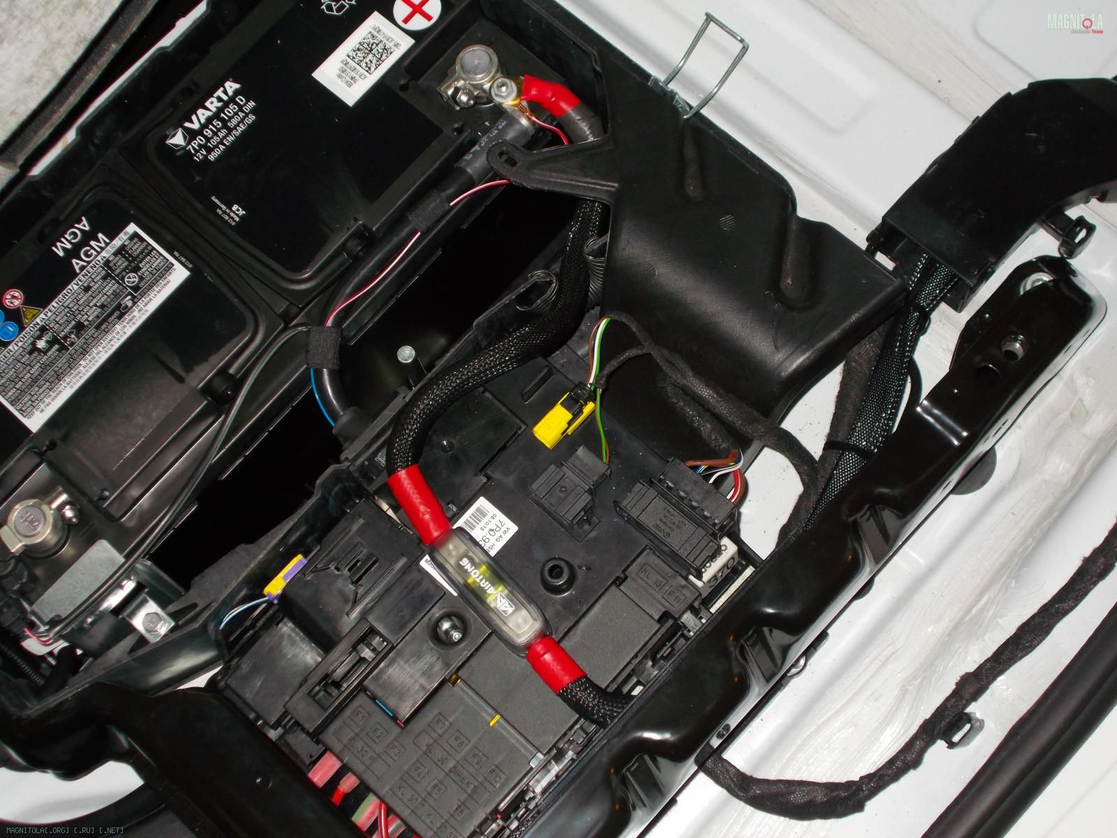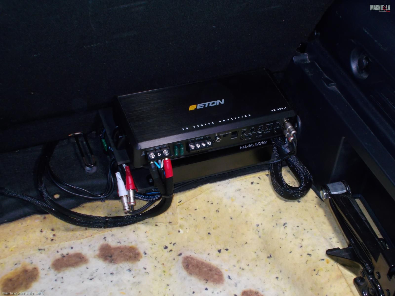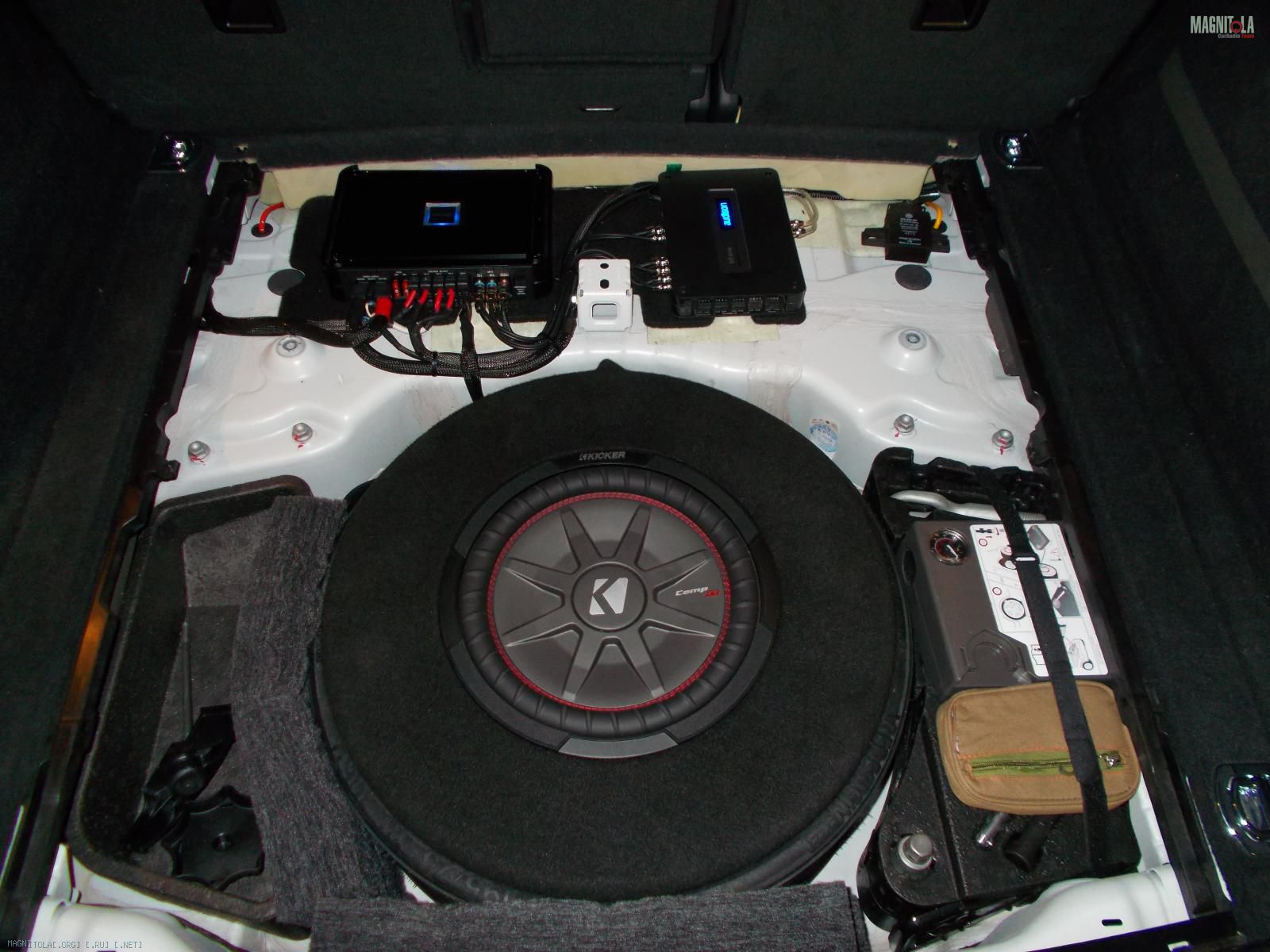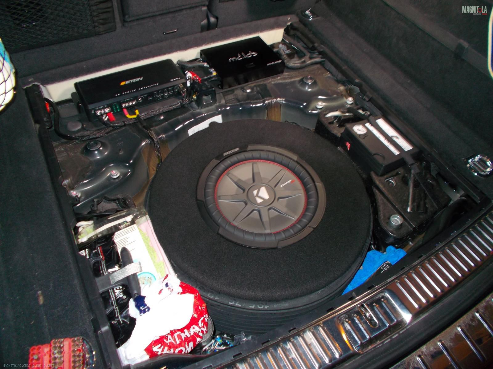 В багажнике, по правую сторону, друг над другом, компактно расположились два усилителя.
