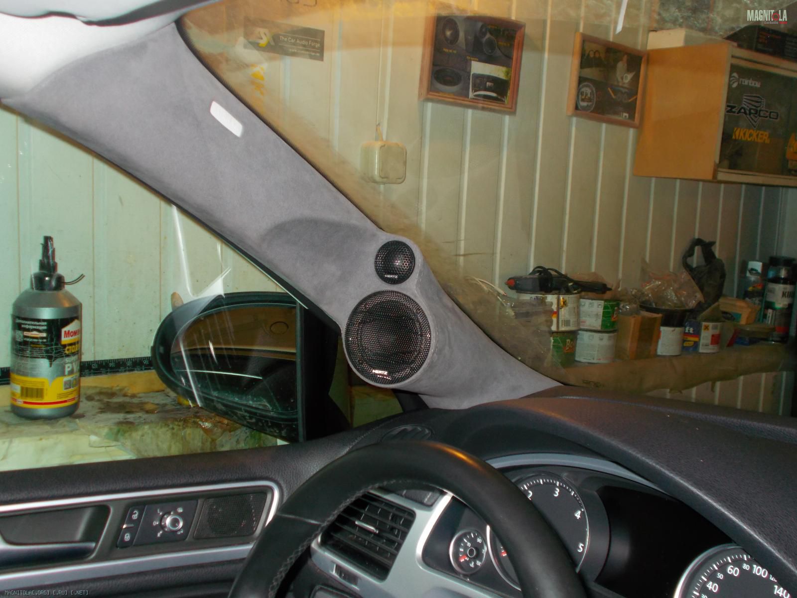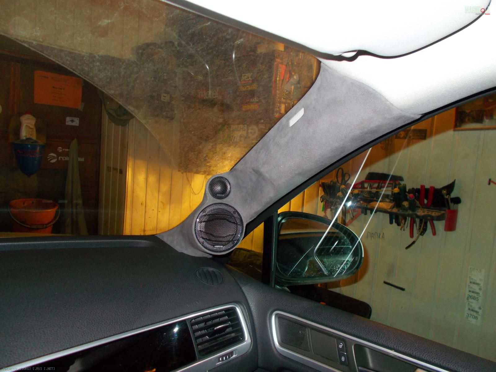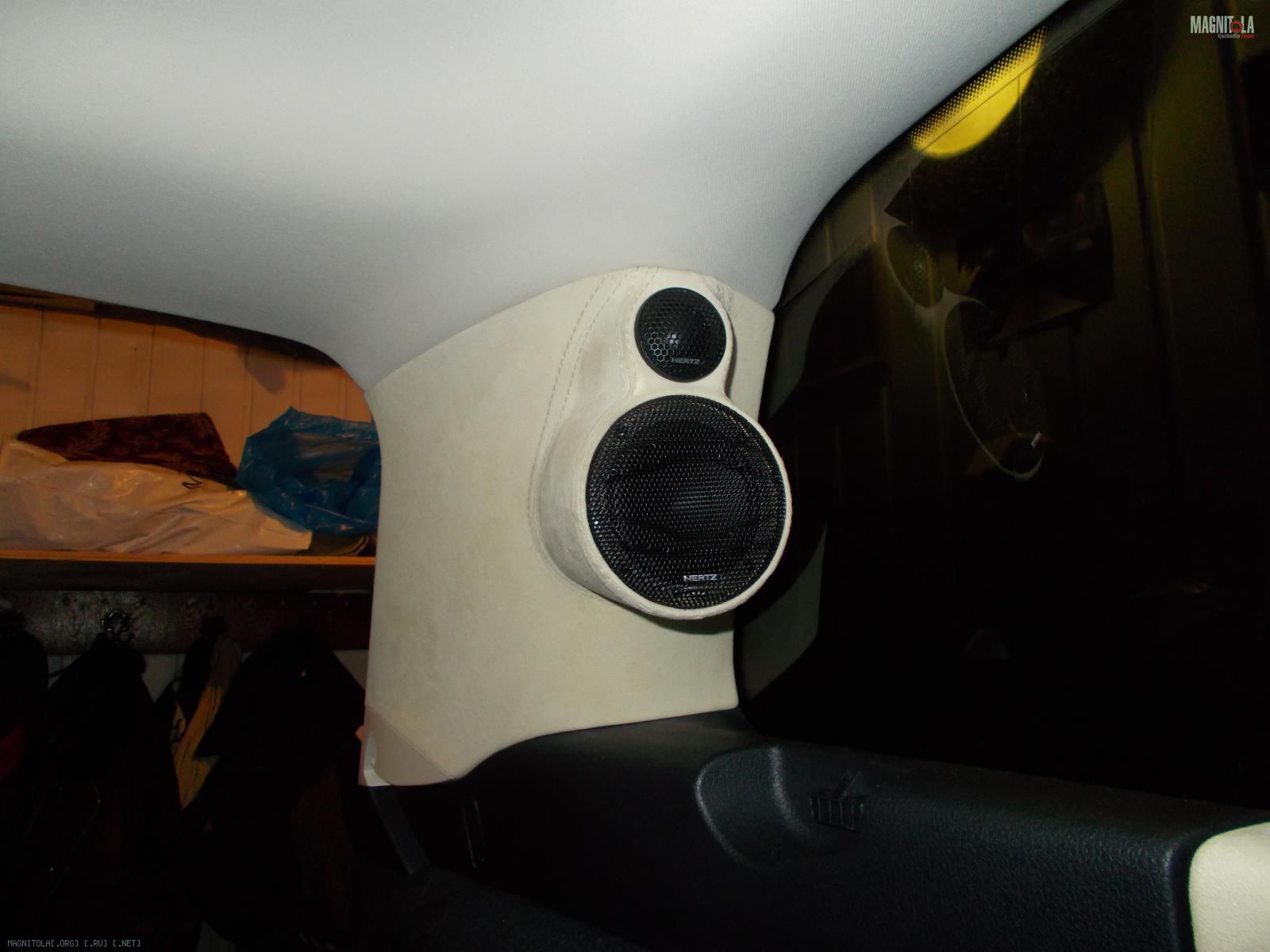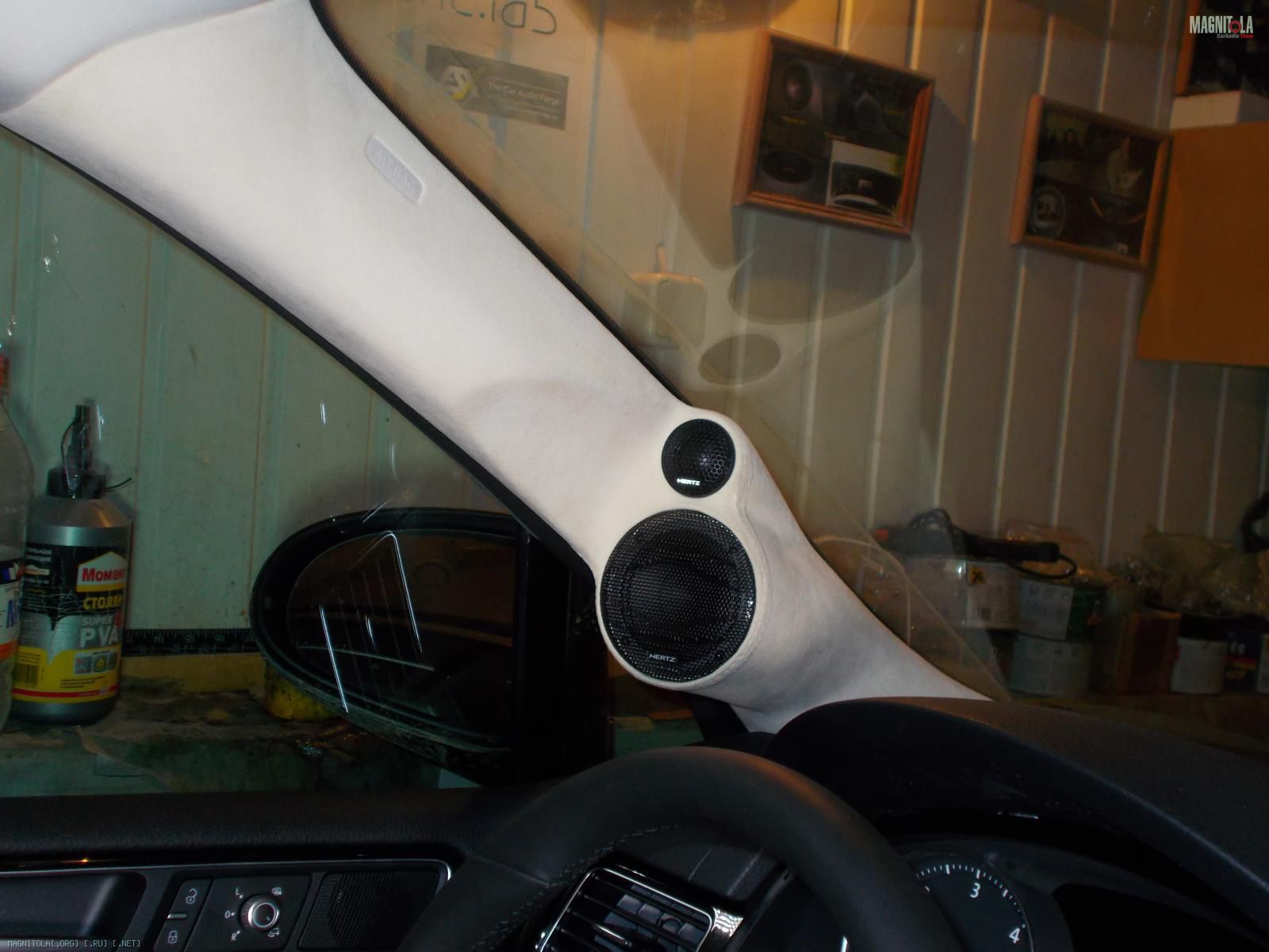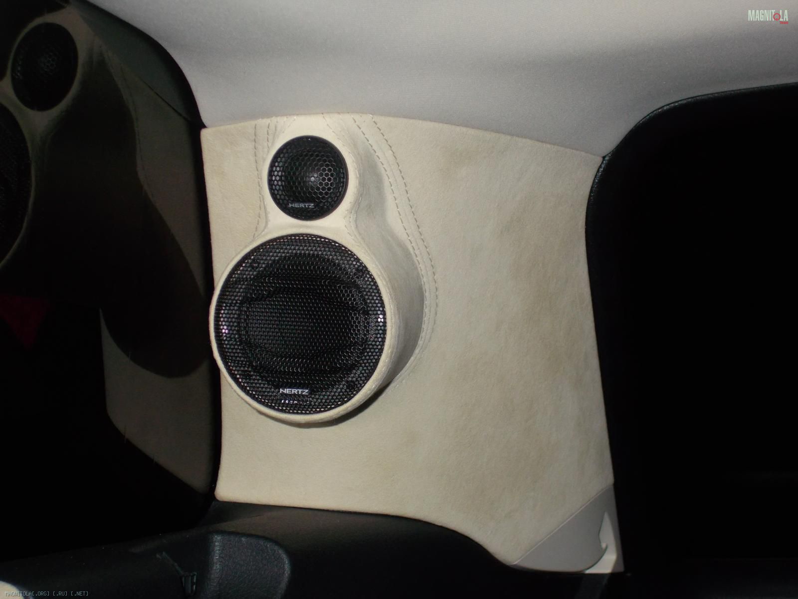 Фронт и тыл трехкомпонентный, на компонентах Hertz mpk 163.3 pro, с выносом сч/вч на передние и задние стойки + перетянуты остальные стойки в один цвет алькантары