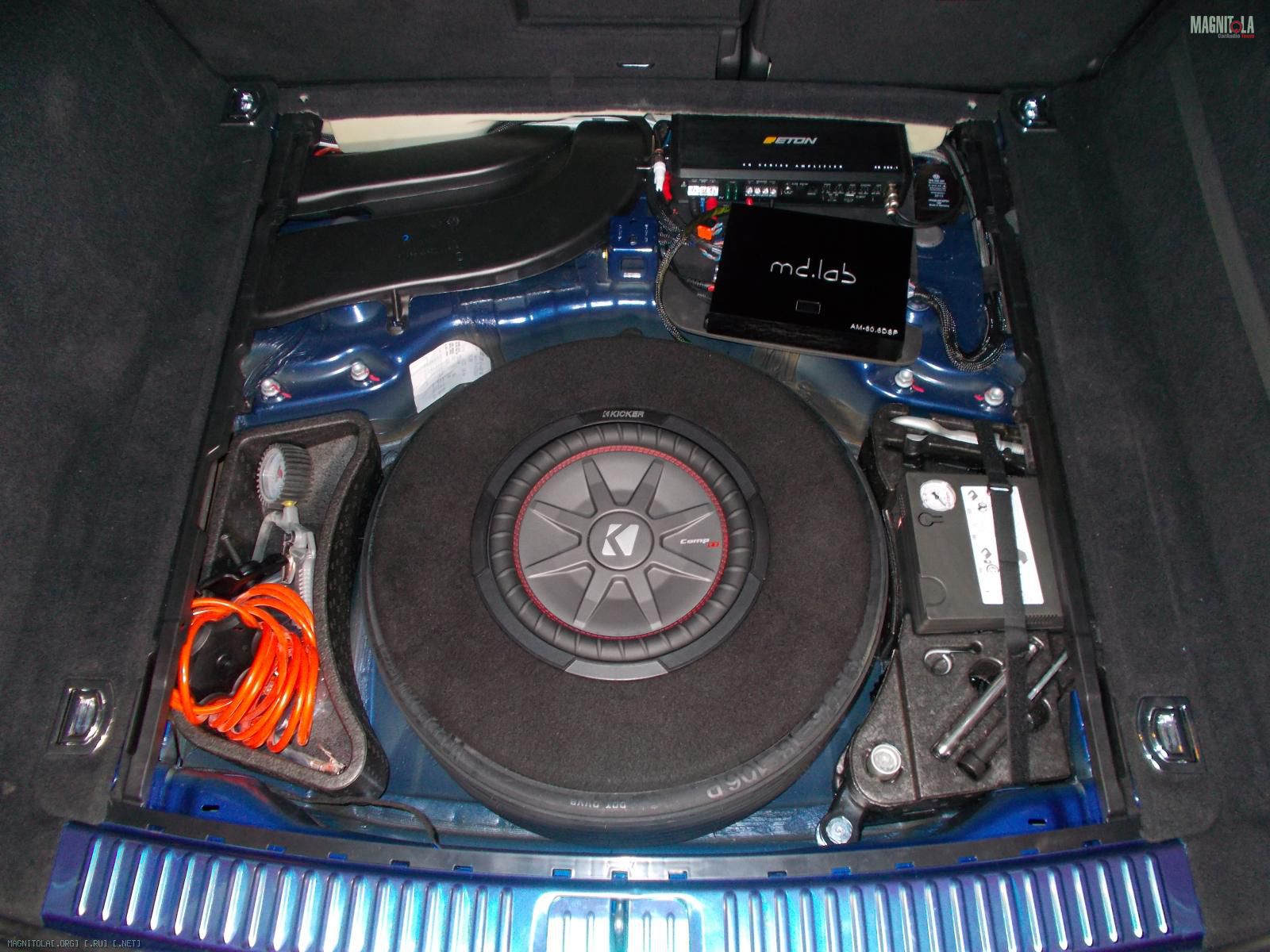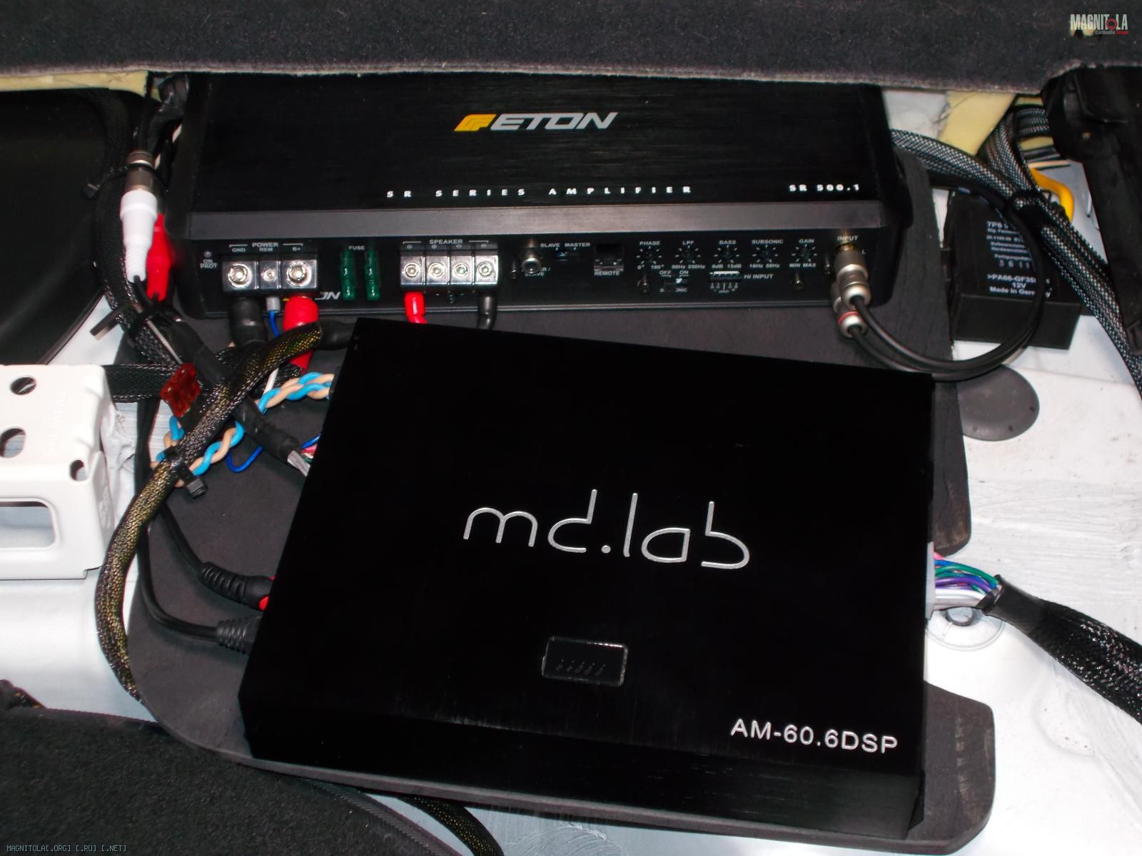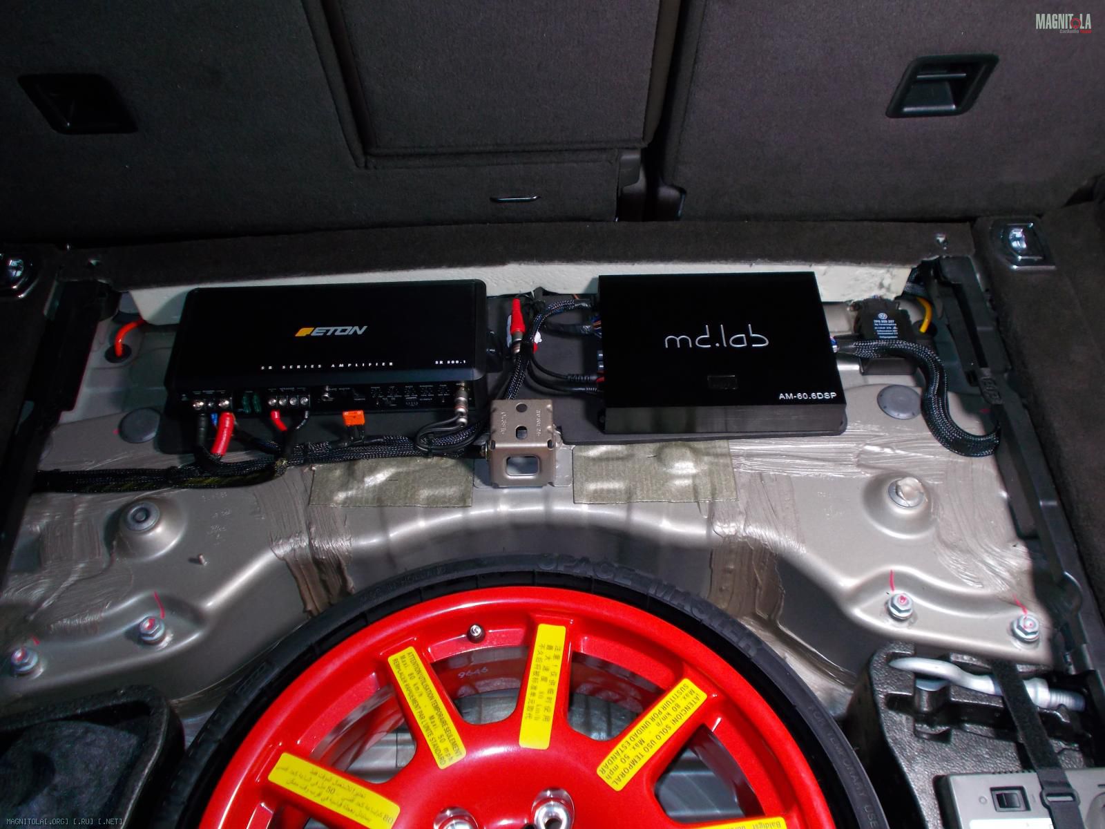 Усилитель мд лаб с процессором по триоме тослинк, 4 канала на фронт по схеме 2.5 канала ( СЧ ВЧ от кроссовера + 2 канала на НЧ ) и 2 канала через кроссовер на трешку заднюю + монобок Eton sr 500.1 на саб подключенный в 1 ом, в стелсе в запаске.