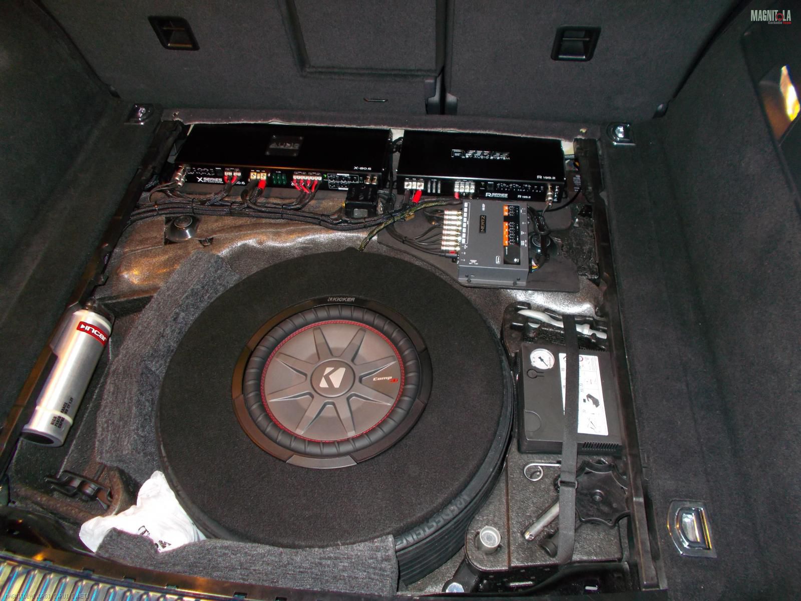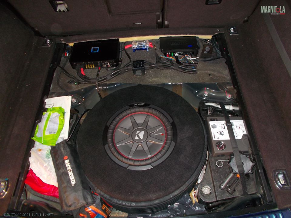 Автомобиль с 4-х зонным климатом и все оборудование компактно разместилось по правой стороне пола багажника. Сабвуфер сделан в докатку. Заранее ее необходимо перевернуть и прикрутить, потом уже вставляем готовый саб.
