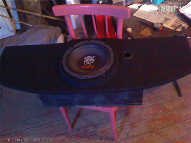 Итак, на днях решил поменять порт фазоинвертора на более больший по диаметру. Сразу оговорюсь, данных по динамику Mystery я не нашел, поэтому игрался с длиной/диаметром фазика так сказать на практике. Собственно заменил порт, собрал, подключил свою ящик-полку сначала в багажнике для проверки. Баса на слух стало побольше. Обрадовался, поставил на место, жестко закрепил к перекладине (т.е. кузову). Включаю — баса стало вроде как поменьше, появились искажения, я подумал что катушка застучала. Почесал репу и решил что то что стало меньше баса мне показалось.