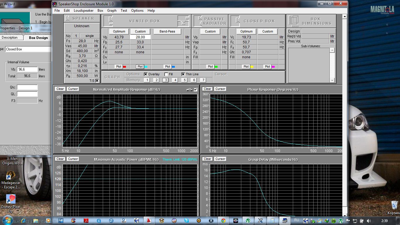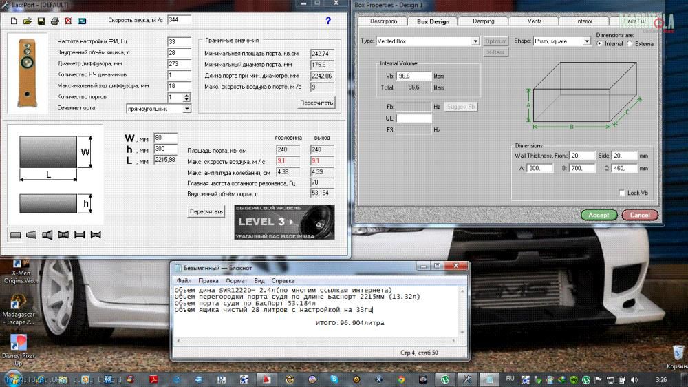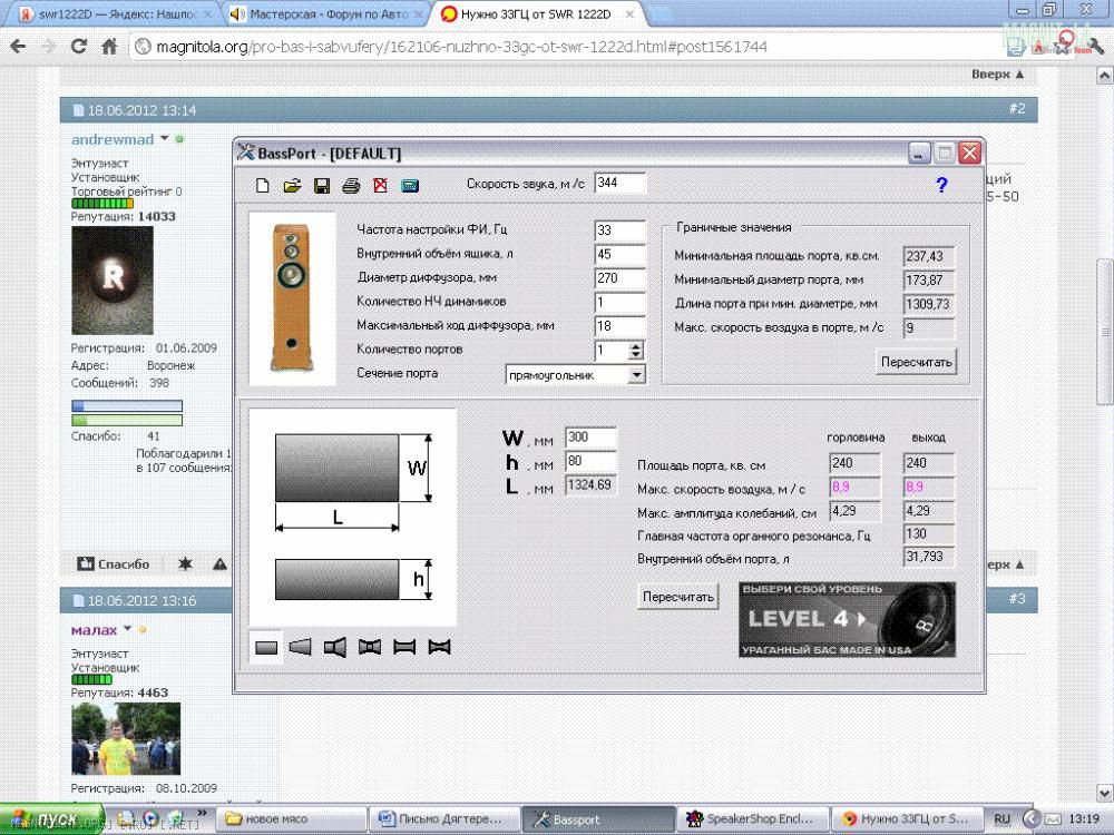 Думаю в объеме 28 литров и частоте настройки 33Гц,Р-ка долго не проживет,мало того общий объем огромный получается из-за длины порта(два с лишним мерта это куда столько!!!)...45-50 литров чистого,на 33Гц и общий объем будет примерно такой же и динамику комфортнее)
