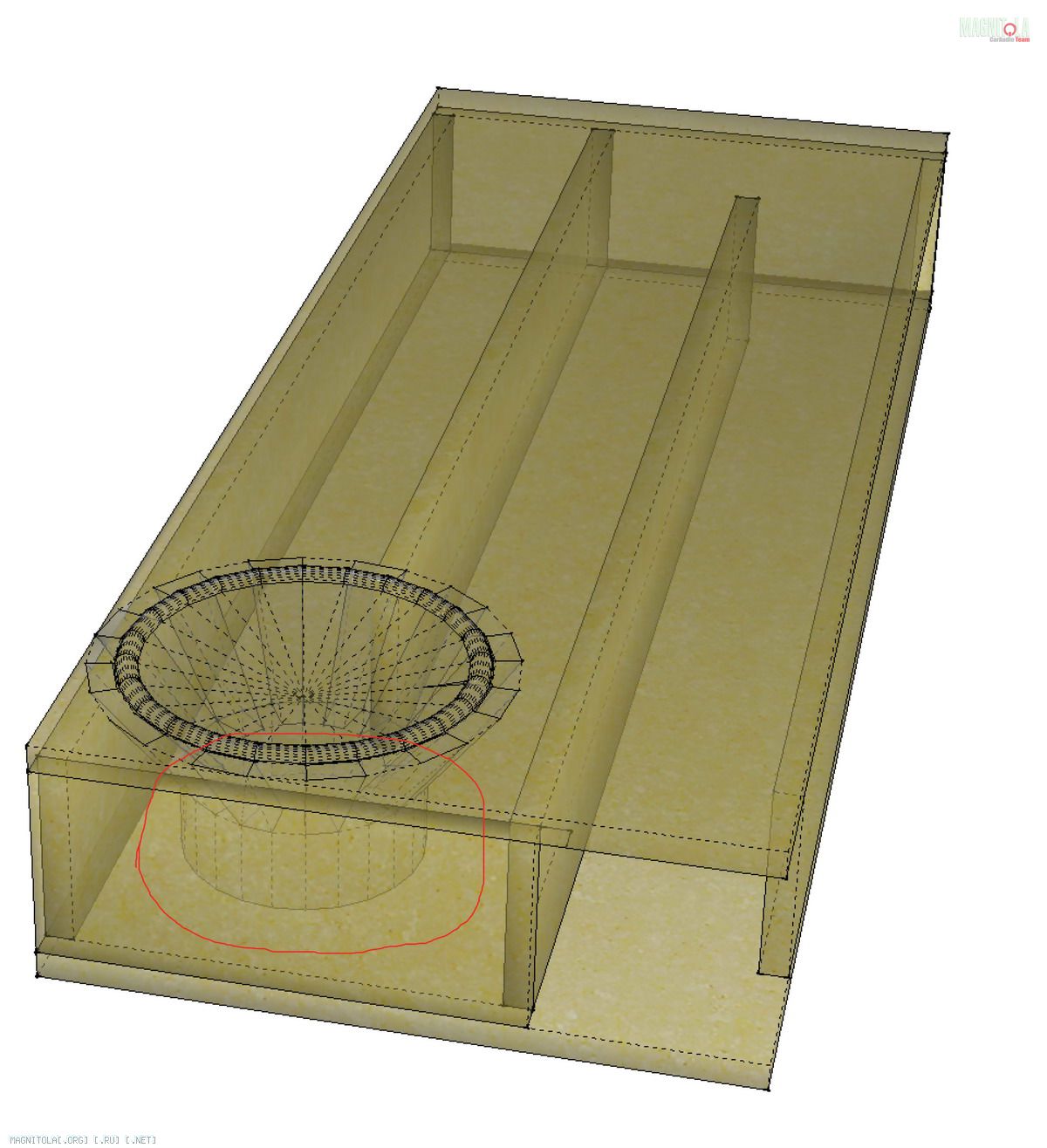 Меня вот смущает пространство за динамиком, там надо конечно четко канал закруглить и сечение учитывать, но как смоделировать канал с учетом магнита, вот блин я хз тут))))