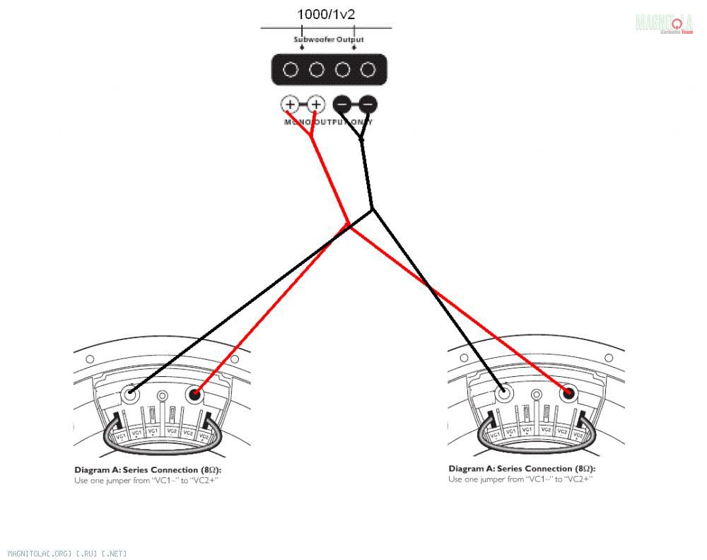 Подключаю 2x10w6 к 1000-ку. прикинул, если 2 саба по 8 ом соединить таким образом как на картинке, то общее сопротивление будет 4 ома (Я прав).