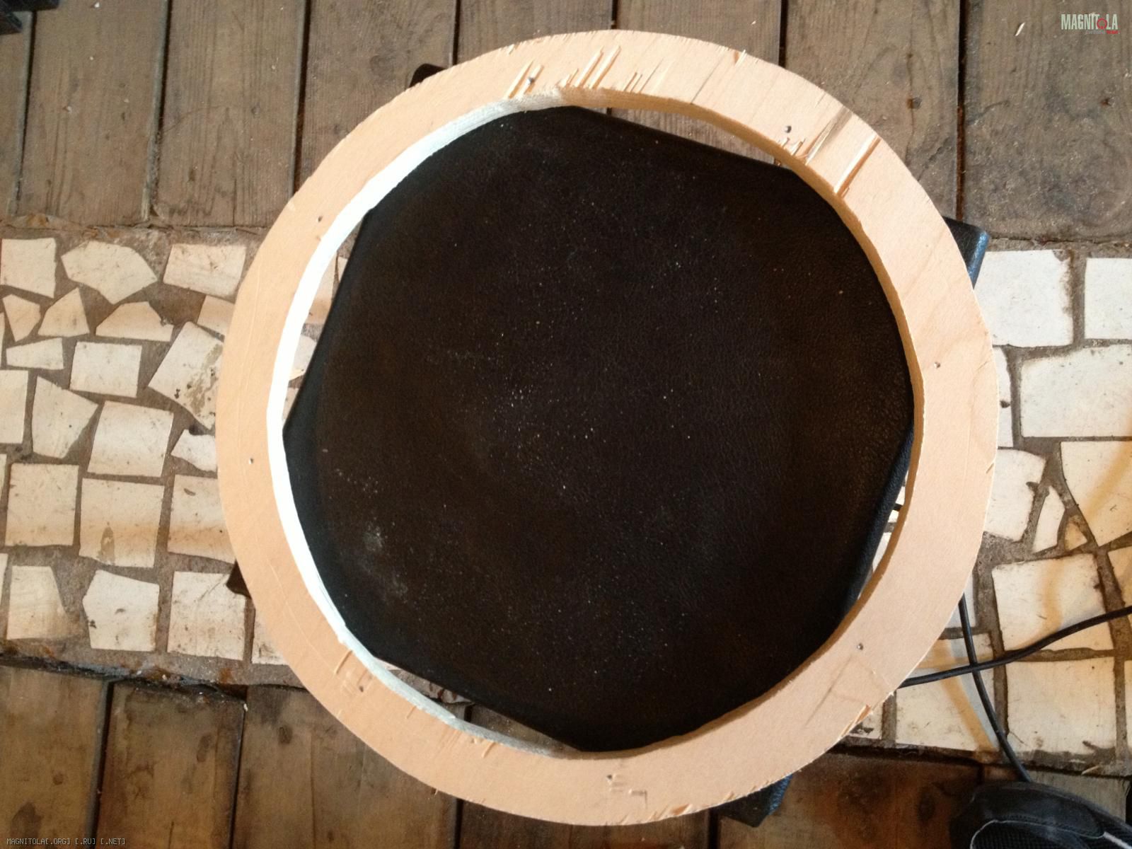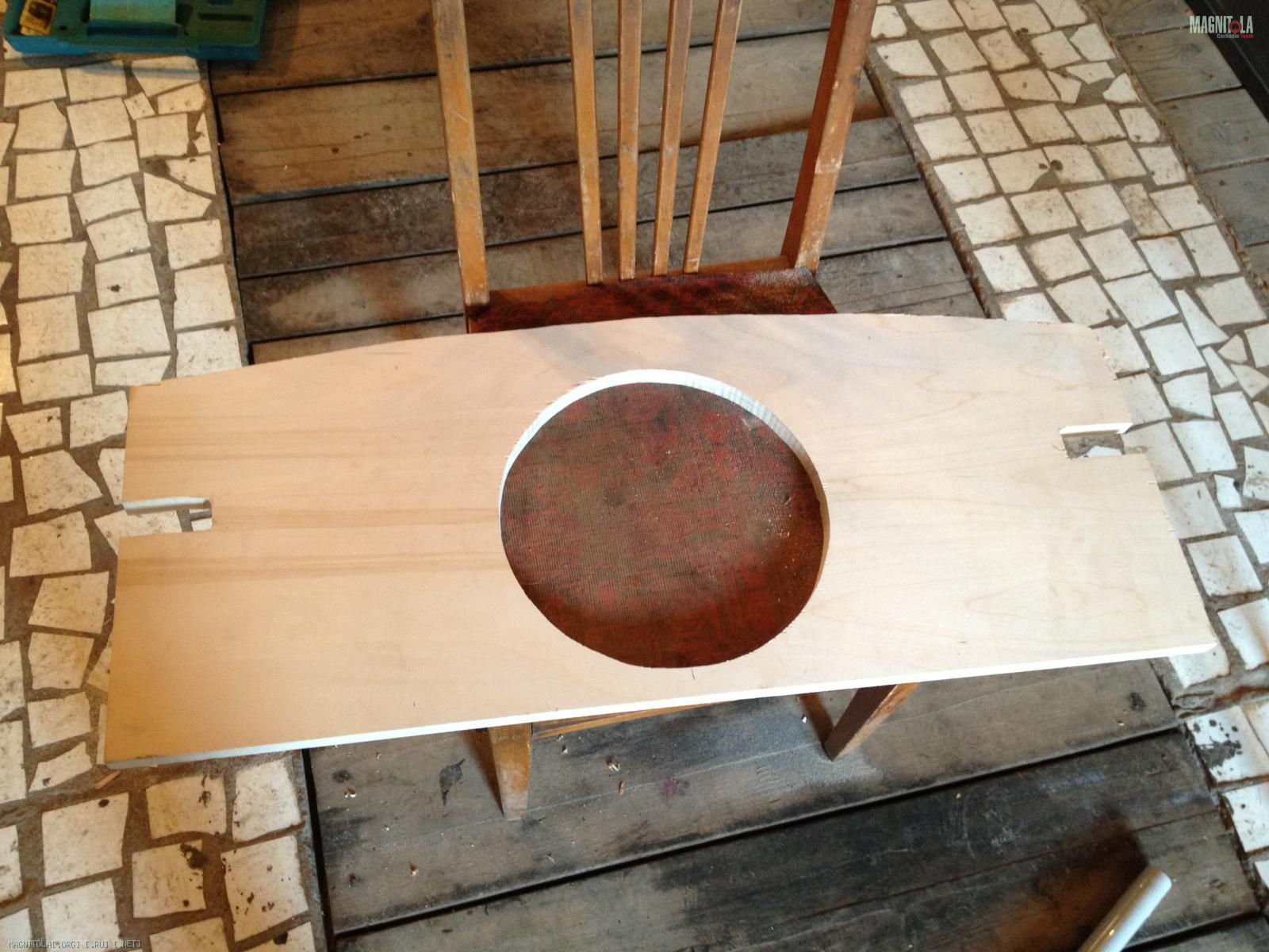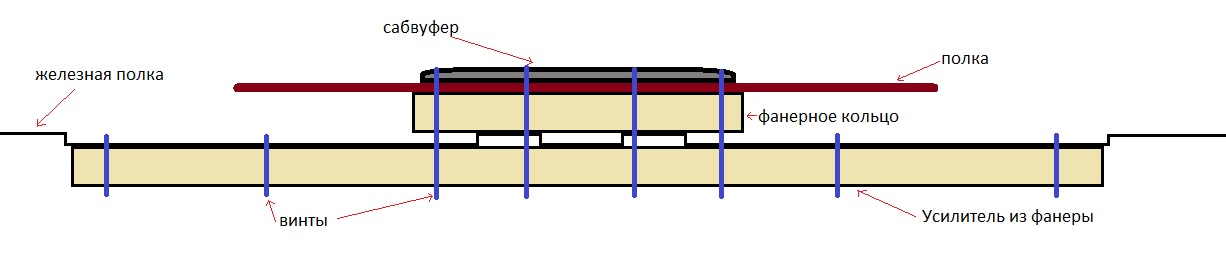 Над ним фанерный усилитель 18мм, потом полка желазная, потом кольцо фанерное 18 мм, ну и штатная полка 5мм.