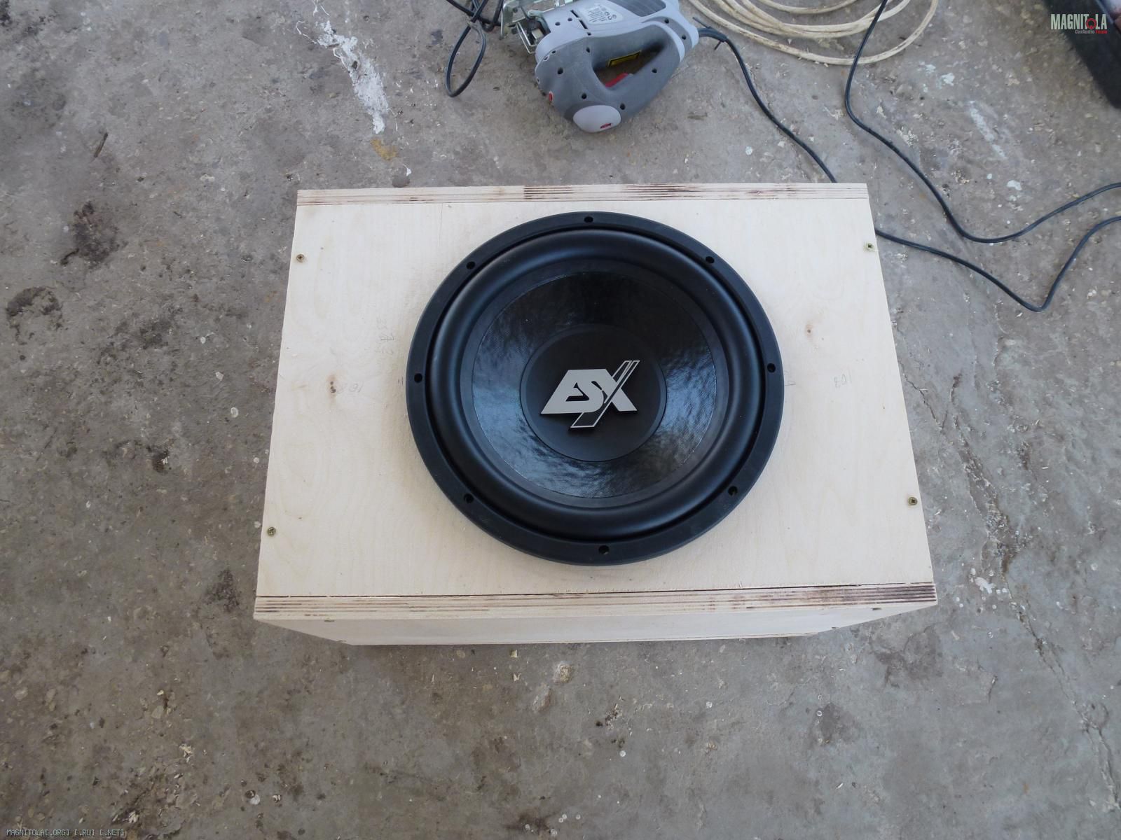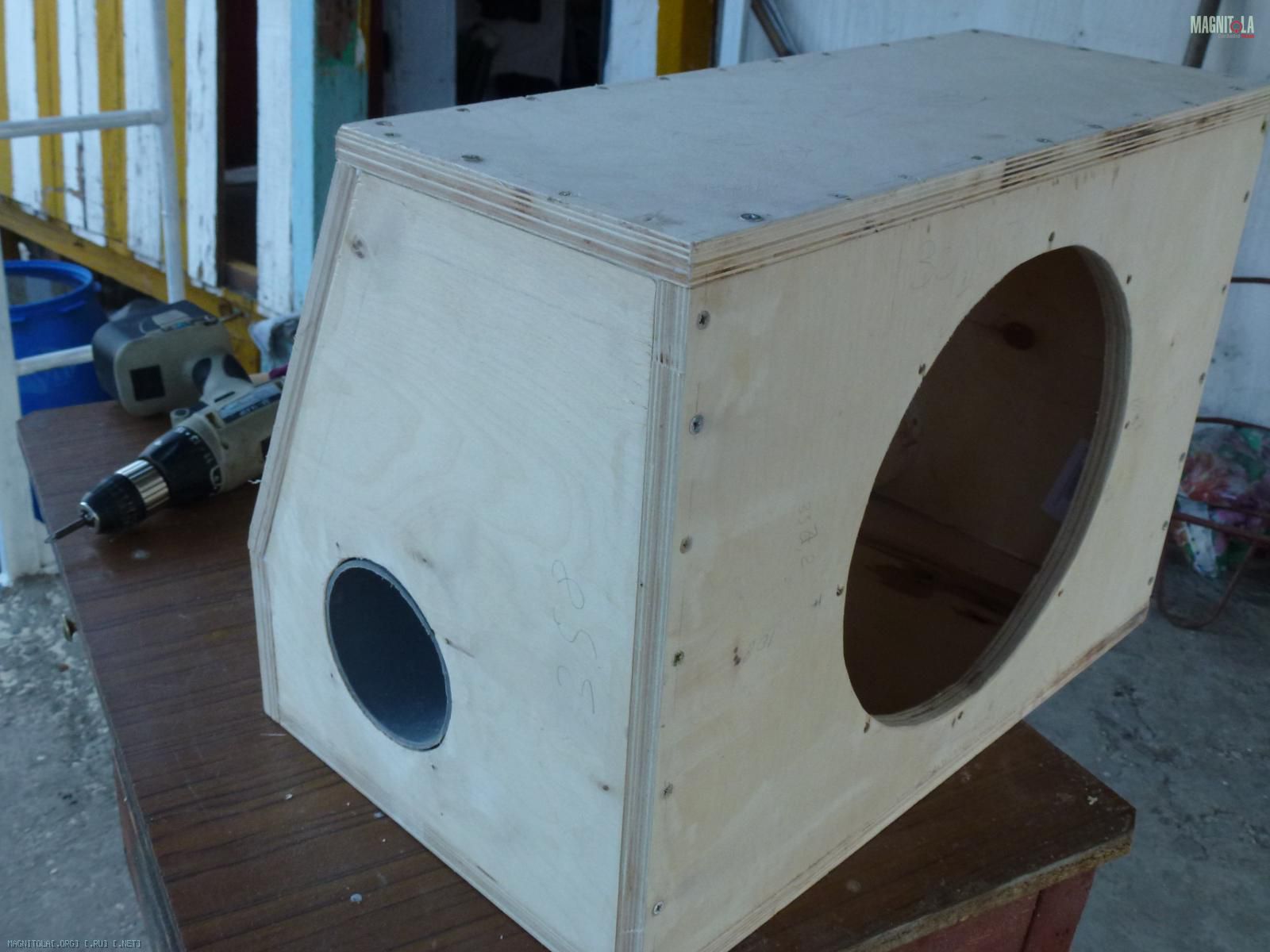 короб хотел сделать покомпактнее,получился 47л. и поэтому позволяет частоту порта понизить до 38Гц ,также была идея установить 2 порта по Ф45мм