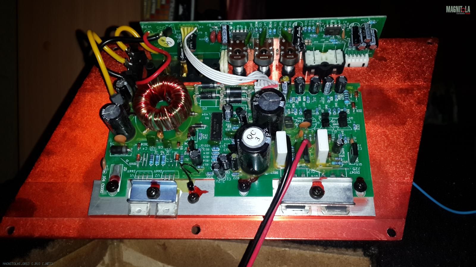 Картинка внешнего вида усилителя ни чего не прояснит в диагностике,кроме паяльника нужно иметь приборы (тестер и осциллограф),но самое основное-знания в построении схемы и поведения радиодеталей в измерениях.