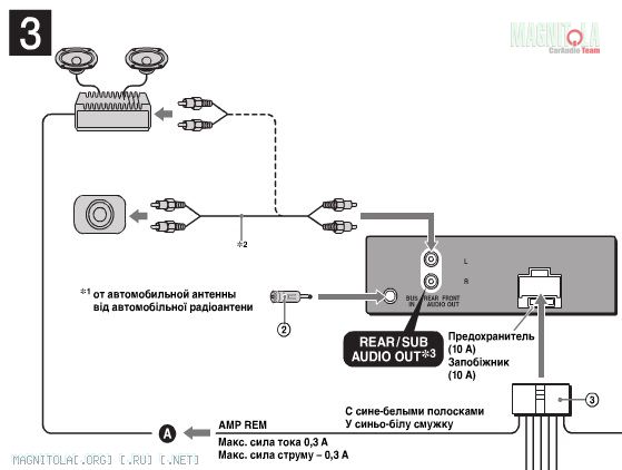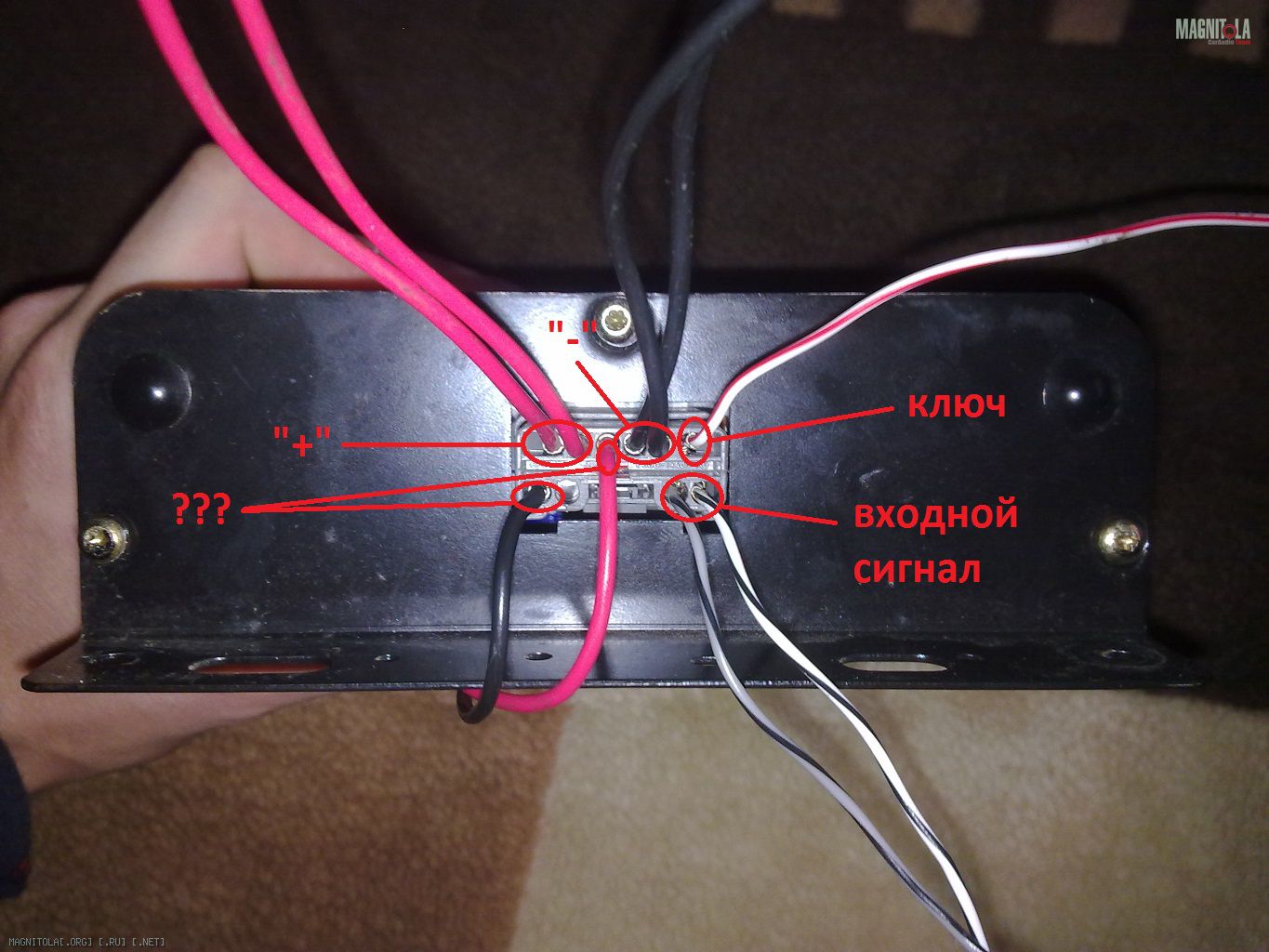 Судя по третьей картинке вход берется от динамика(высокий уровень),который надо и подать на этот вход.Справа над ним ремот(включение от ГУ +12В у соньки синий провод-иногда синий с белой полосой постоянно для уся и активной антенны)примерно так видится это соединение,но прозвонить не мешает,а также убедится в правильности моих рассуждений.,