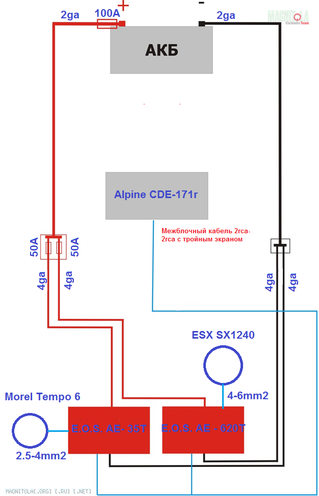 Совершенно верно,так и должно быть-из этого следует:60+80=140А на АКБ в колбе.При малой длине кабеля от дистрибьютора до усилителей(не более 0,5 метра 8Ga медного кабеля будет достаточно)4Ga, если медный, тоже хватит на длинную линию.Все медно-аллюминиевые кабели требуют увеличения сечения в соответствии 4Ga и 2Ga,следуя по выше указанному тексту в этом сообщении.,