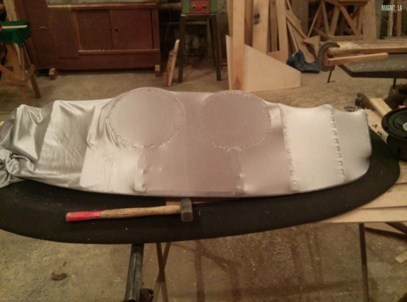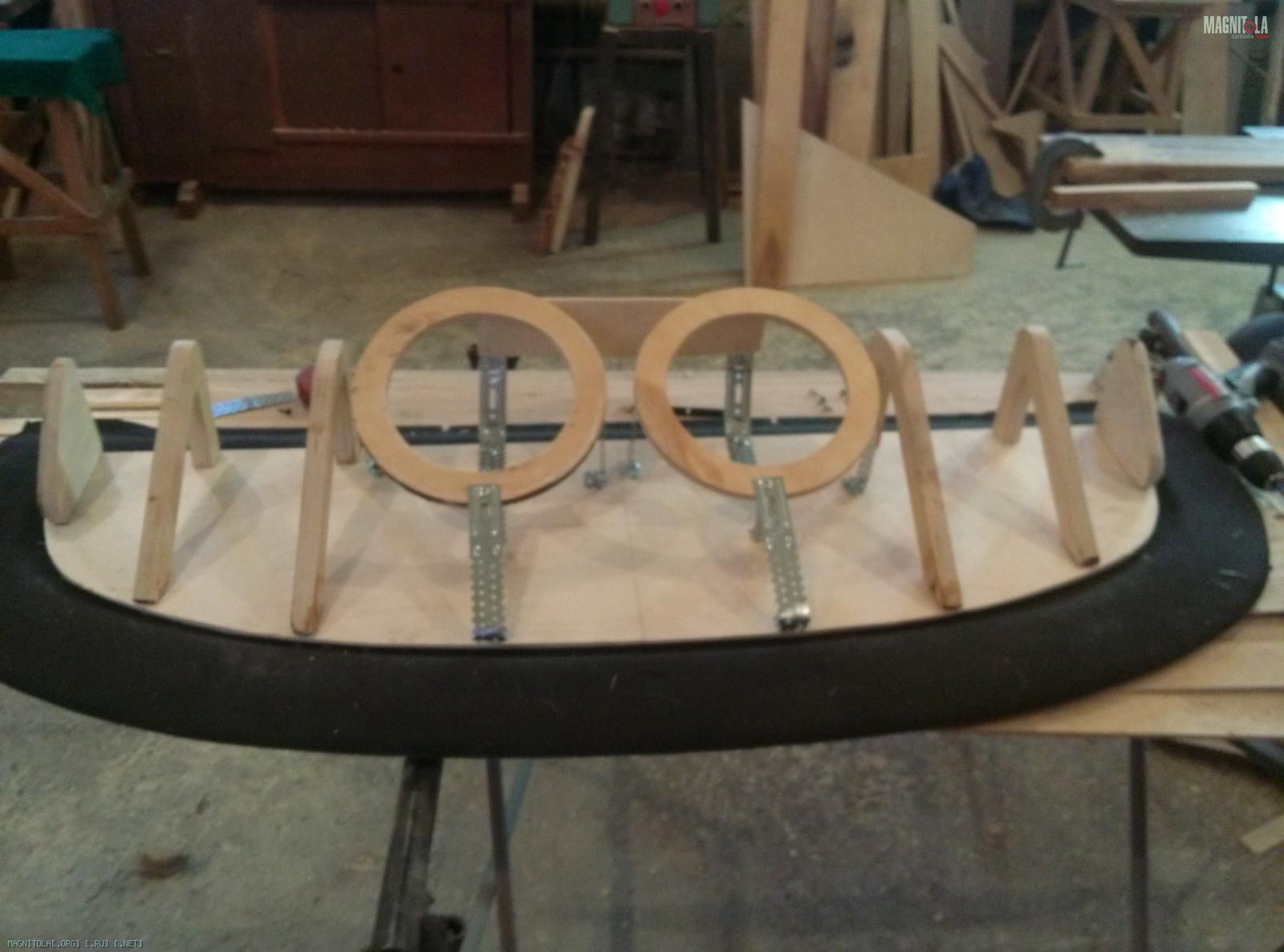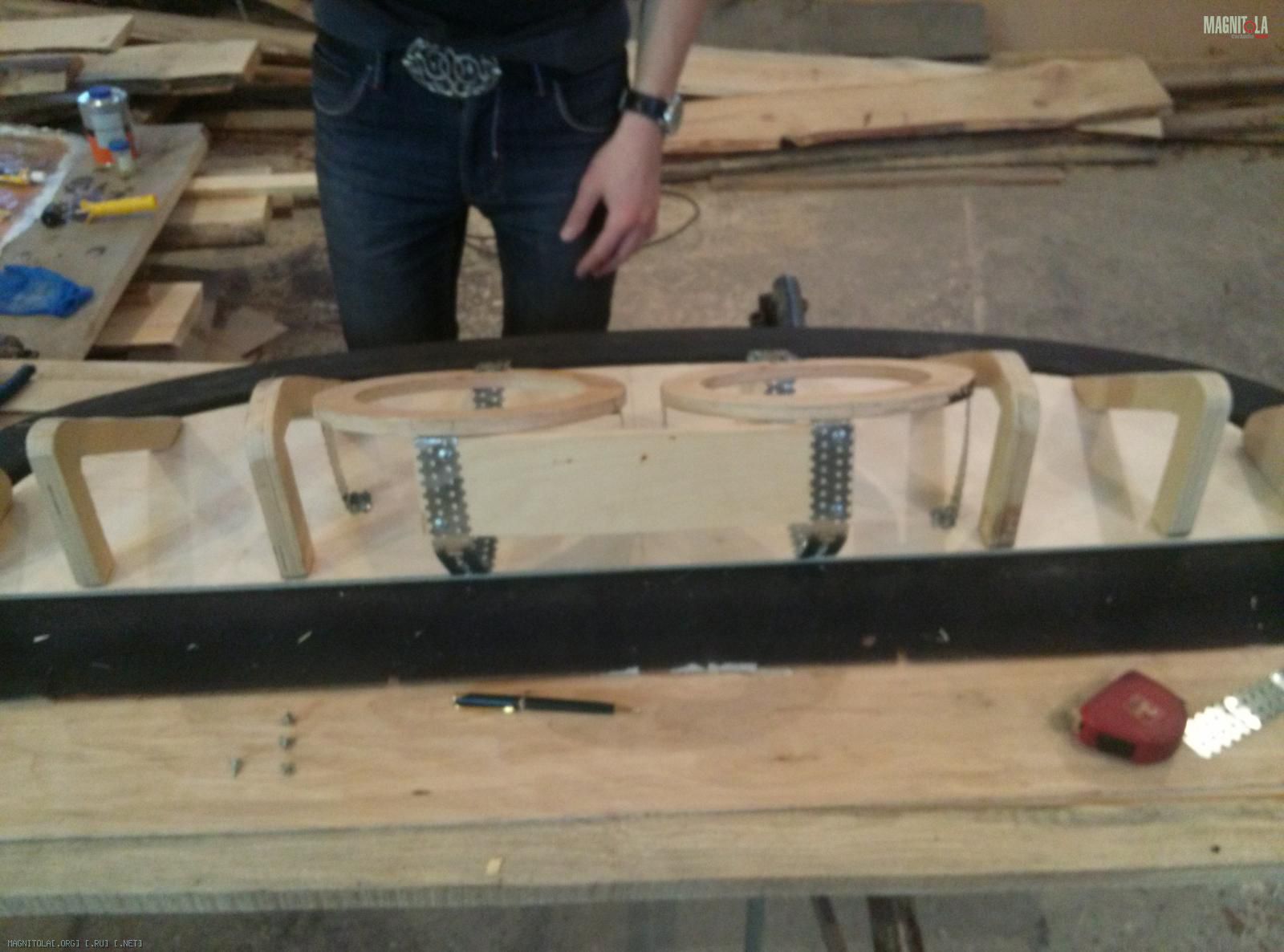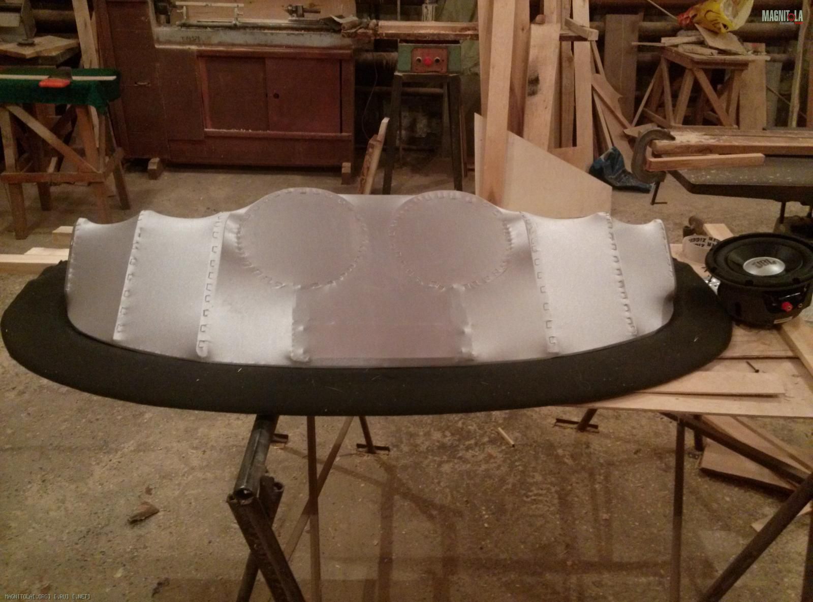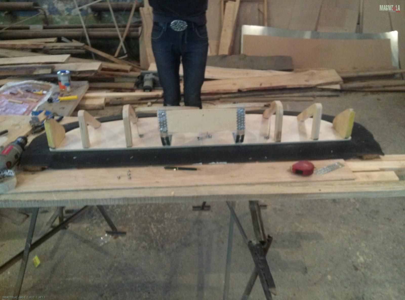 Да кстати решил внести изменение, основу вылепленную из стекломата убрал, т.к. это был первый опыт работы с материалом, мне она не очень понравилась, и была выпелена основа из фанеры 1см, такой же как и снизу полки, получилась общая толщина 2см. Ну и далее установка нервюров и колец, кольца зафиксировали намертво да и всё остальное тоже. Сил делать дальше сегодня не хватило, завтра продолжу после работы.