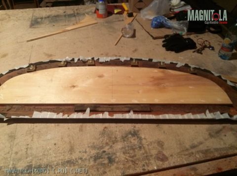 Интересно почему они начинают делать основу из волокна непосредственно в машине, не демонтируя для удобства заднюю полку. Не прощи ли полку снять положить на стол и спокойно обклеив ее малярным скотчем начинать выкладывать основу?
