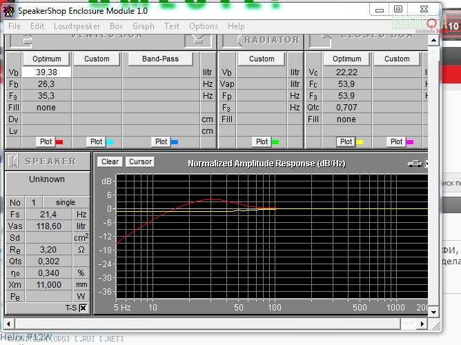 Это моделирование оптимального оформления для вашего сабвуфера в программе Спикершоп с учетом влияния салона автомобиля. Как видно из красного графика, программа рекомендует настройку порта на 26 герц и чистый объем 39,5 литров. Осталось прибавить объем самого динамика и объем трубы.