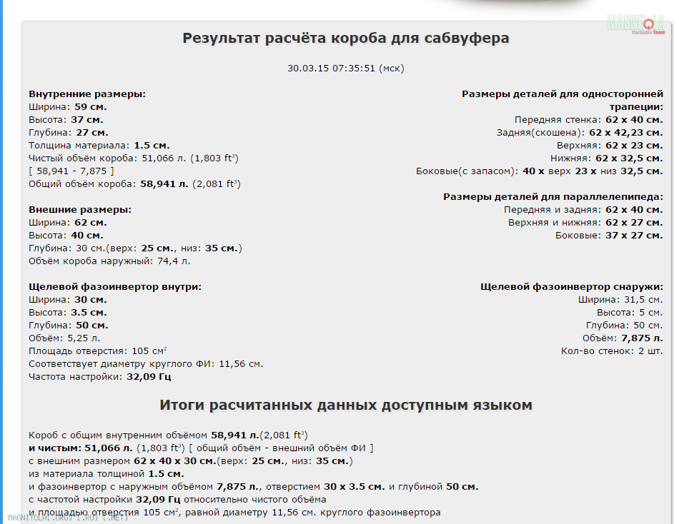 забил данные короба в калькулятор, кусок порта на 50мм не знаю как добавить в расчет, включил только 500*35: