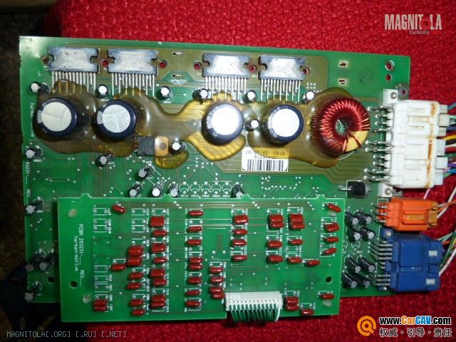 Нашел еще пару фоток этого усилителя. Выходы на саб, если верить схеме, на фотках как-то странно скручены парами.