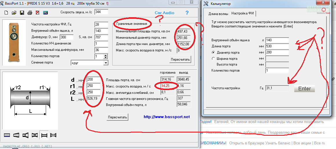 Подскажите пожалуйста по bassport , хочу научиться им пользоваться, попробовал посчитать короб под Pride s15 v3 http://pridecaraudio.com/catalog/subwoofers/s315 короб в басс боксе по графику построил на 140 литров желаемая настройка 28 гц на 200й трубе