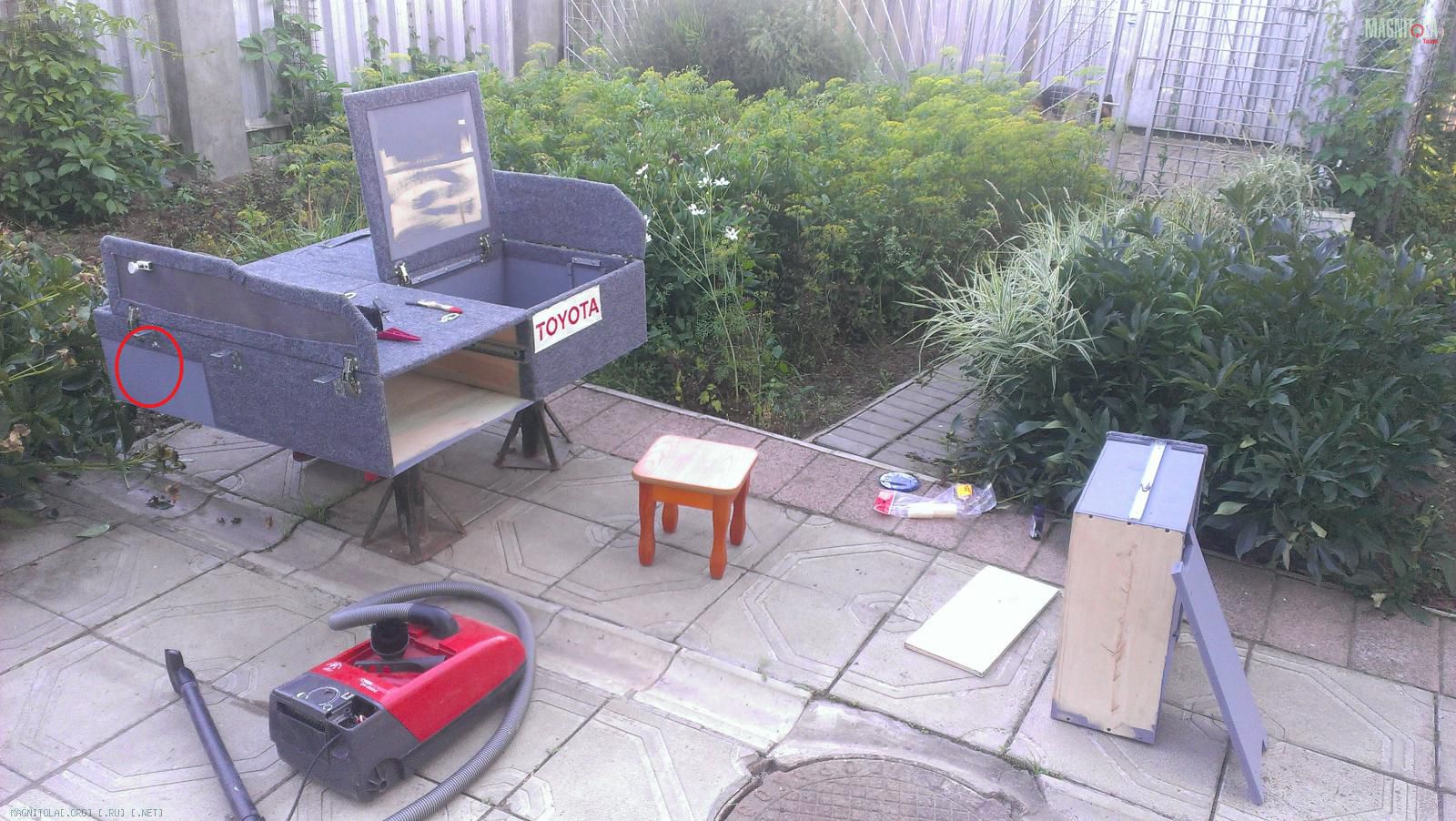 А это спальник-рундук вне машины, сделан из фанеры (толщина: верх и низ 20 мм, бока 15 мм), отметил красным куда думаю врезать саб, высота спальника чуть больше 25 см, поэтому туда поместится только 8', ну максимум может 10'