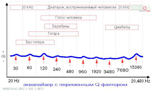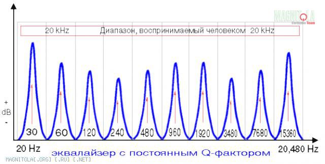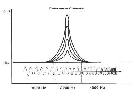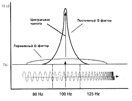 Степень взаимовлияния полос при регулировке определяется Q-фактором. Регулировка центральной полосы в эквалайзере влечет за собой соответствующее изменение соседних частот справа и слева от нее. Эквалайзеры бывают с постоянным или с переменным Q-фактором. Если эквалайзер имеет постоянный Q-фактор, то регулировка центральной частоты повлияет на частоты, находящиеся внутри этой же полосы, и не окажет практически никакого влияния на соседние полосы. Положение регуляторов в точности будут соответствовать звуковой картине, создаваемой Вами. Если же эквалайзер имеет переменный Q-фактор, то усиление или срез центральной частоты повлияет на частоты, лежащие не только в пределах соответствующей полосы, но и затронет частоты в соседних полосах. Настроить звук такими эквалайзерами гораздо труднее, так как положение регуляторов на панели эквалайзера не будет точно соответствовать реальной звуковой картине.