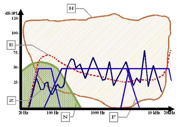 Основная работа эквалайзера - это улучшение акустического состояния звукового пространства, в котором находится слушатель. На рисунке 1 замкнутая кривая H представляет диапазон частот, воспринимаемых человеческим ухом. Кривая N - это посторонние шумы в салоне автомобиля.