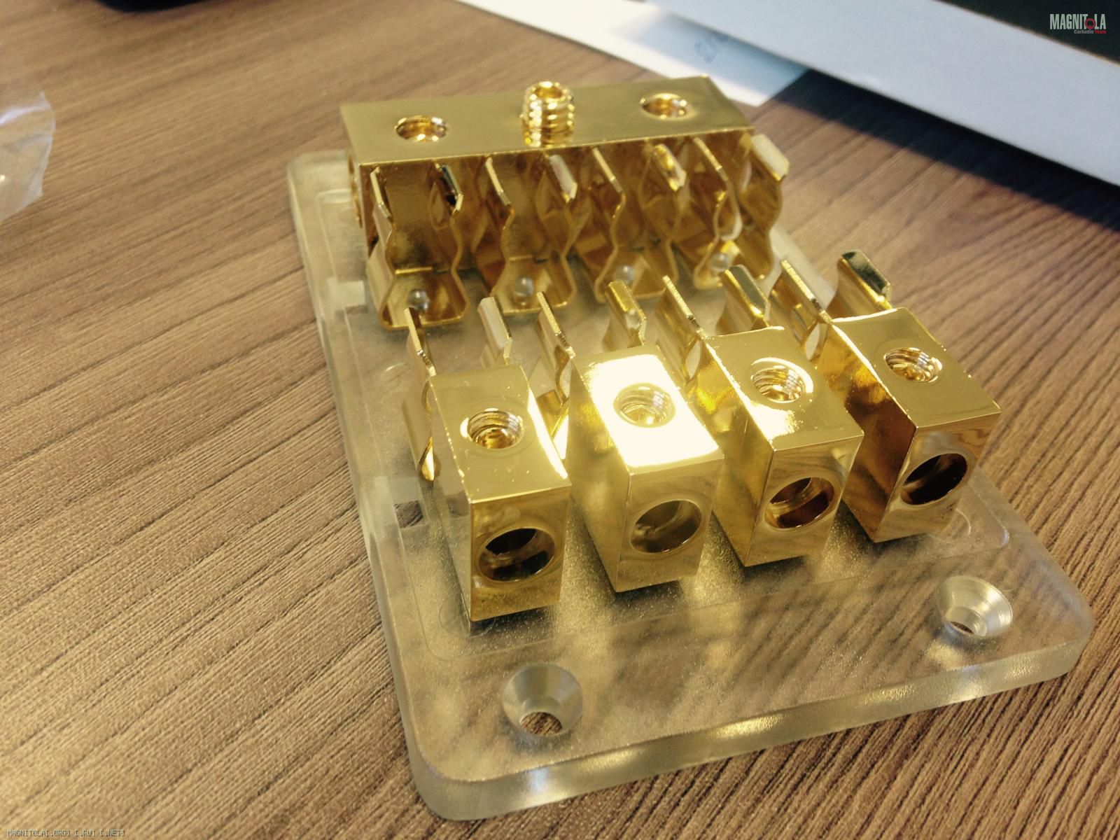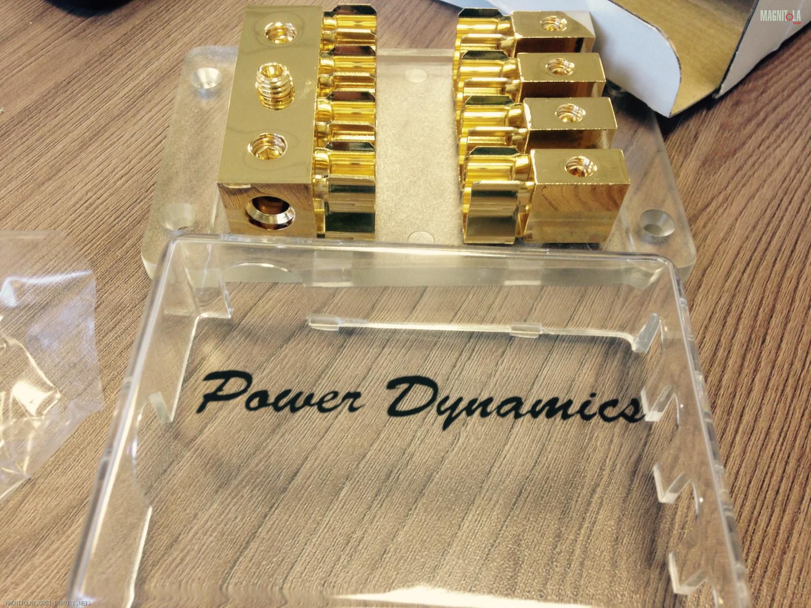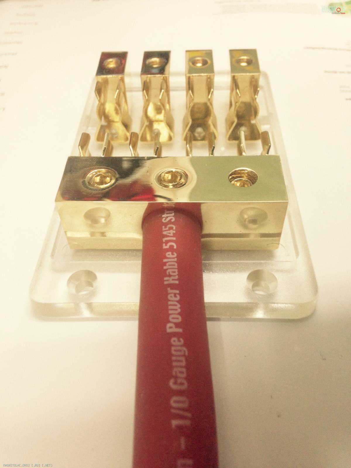 Выход: 4 х до 16кв.мм. (свой делитель, я без проблем рассверлил сверлом 7мм для монтажа кабеля 4Ga 21мм.кв.)