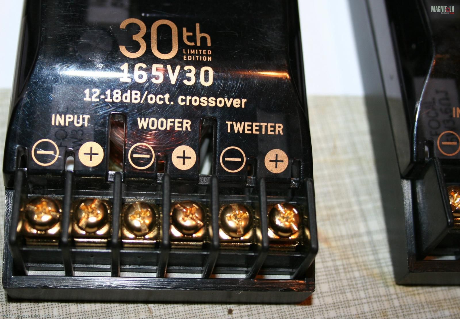 "В кроссовере использованы позолоченные разъемы, полипропиленовые конденсаторы высокой серии и катушки индуктивности низкого сопротивления. Для гибкой настройки звучания в зависимости от места расположения динамиков по отношению к слушателю и друг к другу предусмотрены два варианта частоты раздела и крутизны характеристики фильтров: 3700 Гц, 6/12 дБ/окт, или 5000 Гц, 12/18 дБ/окт."