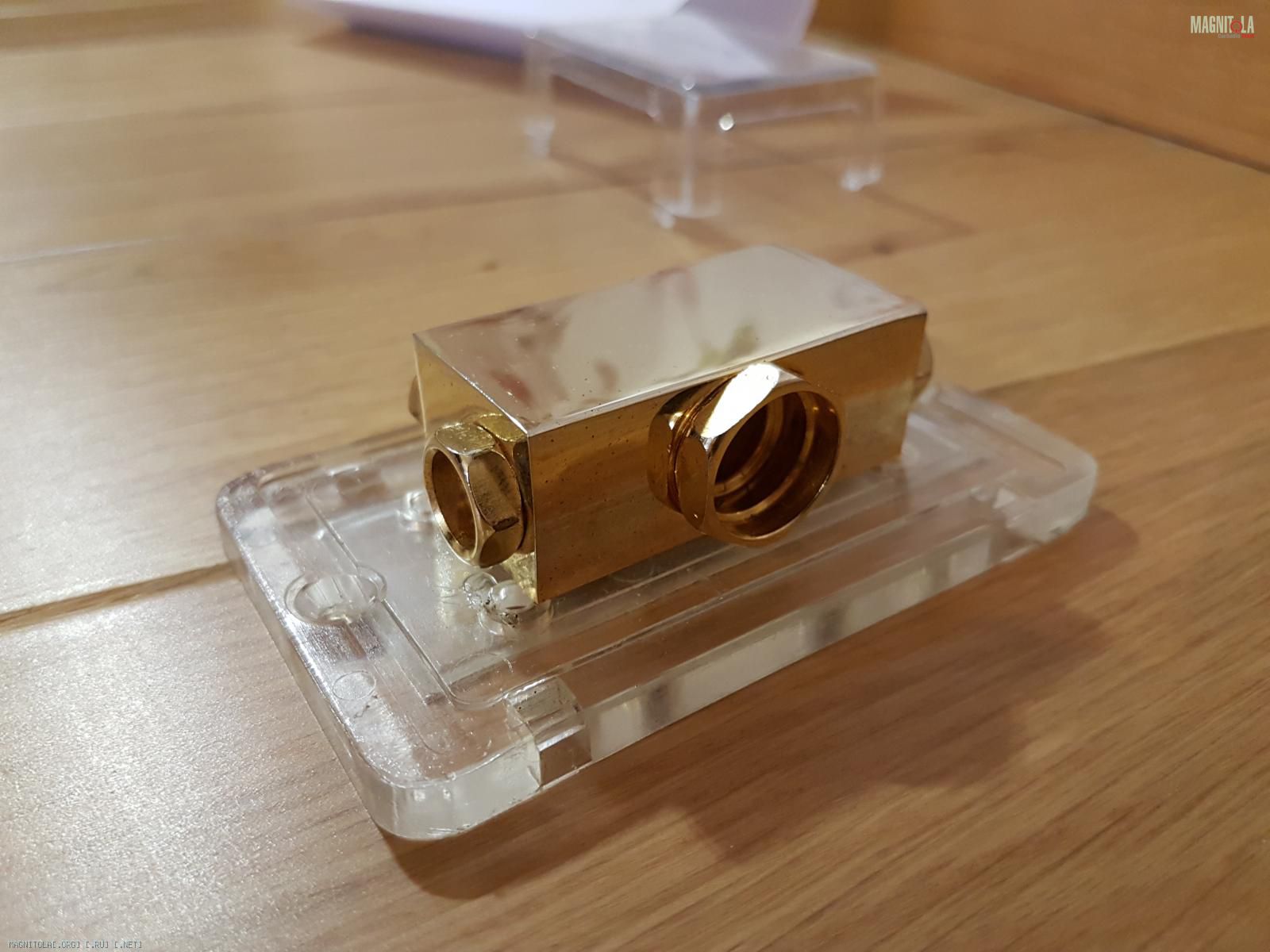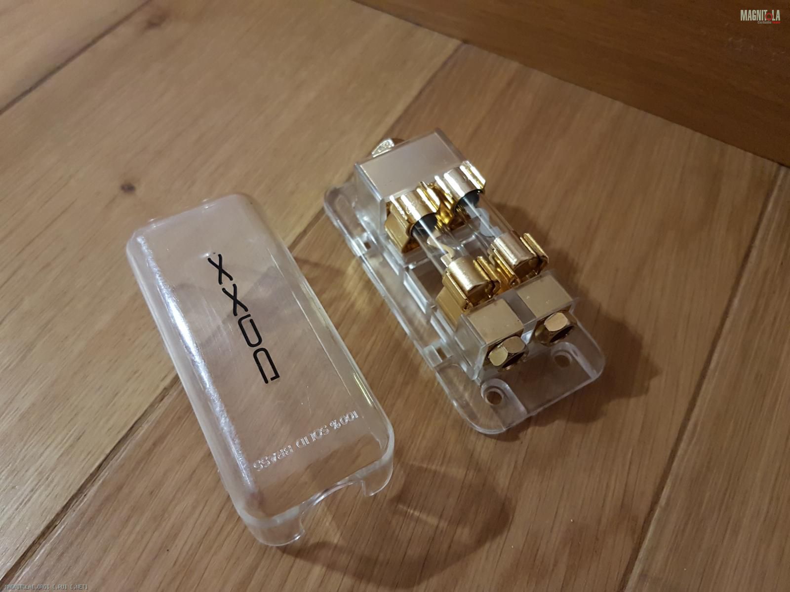 Распределительные блоки D82 изготовлены из бронзы, позолочены для обеспечения высокой электропроводности, стойкости к коррозии и смонтированы на прочном тугоплавком поликарбонате. Секция для предохранителей имеет надежные позолоченные обхваты для цилиндрических предохранителей типа AGU. Компрессионные зажимы обеспечивают плотный и надежный контакт и позволяют фиксировать кабели меньшего калибра. Вввод в блок расчитан на кабель 4 калибра и после секции из 2 предохранителей, имеет 2 выхода на кабели 8 калибра.