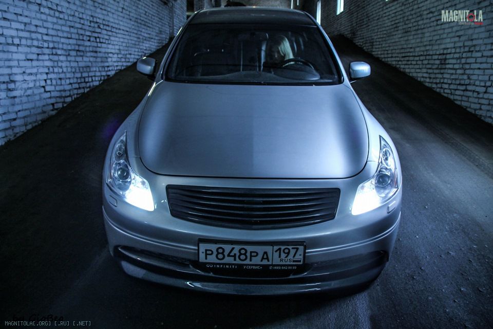 Infinity G35… это уже давно не стоковый авто, хотя даже в его исходном варианте он дает жару! Именно этот – целый проект своего владельца по созданию VIP седана и уже второй год он продолжает его нашпиговывать. Перечислять все детали тюнинга можно очень долго, поэтому расскажу об основных. Итак, у него на счету имеется аэродинамический обвес; грамотный выхлоп(звук бударажит воображение), очень стильные диски vossen и наша любимая игрушка – пневмоподвеска. Скажу честно, несколько раз мы ее опробовали, пока авто стояло у нас, Паша дал добро! Прикольная вещь, конечно!