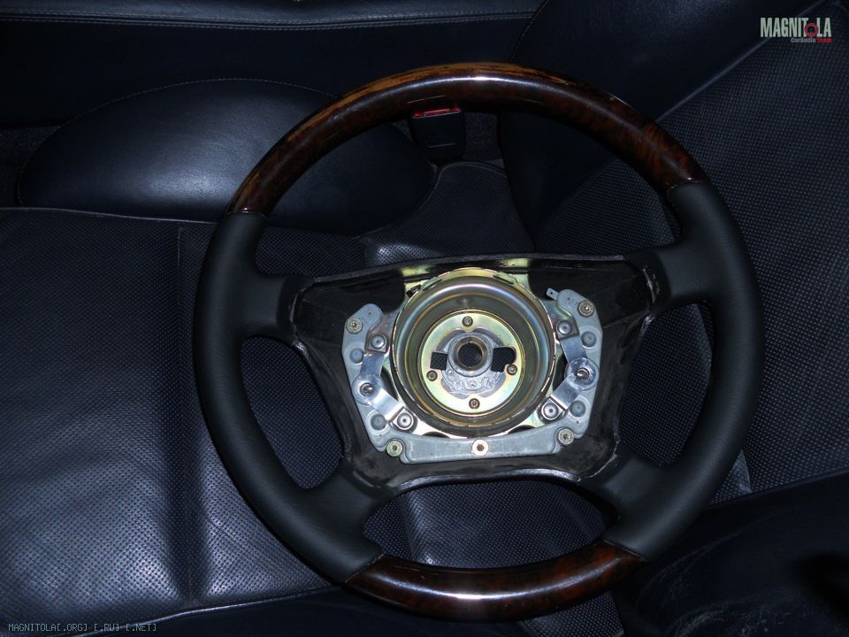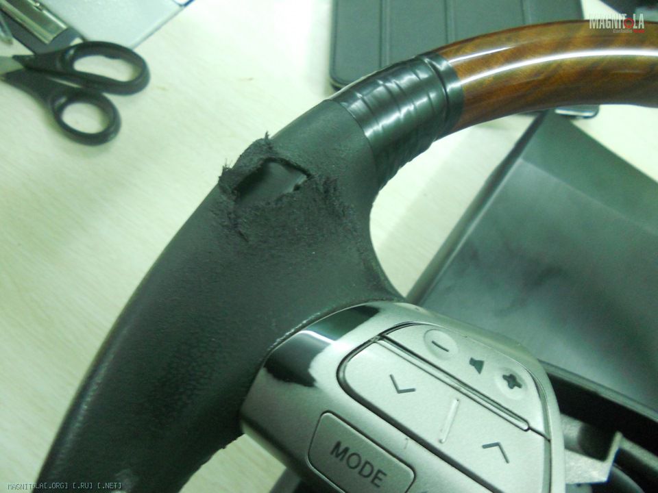 Первый в нашем списке руль от мерседеса E-class (пучеглазенький). Этот руль изначально кожаный с деревянными вставками. Дерево еще ему послужит, а вот кожа стопроцентно шла под замену. Владелец маляр, у него есть привычка ездить на авто с грязными руками, работяга. Руки может и бывают грязными, но зато золотые! И вот что мы сделали…