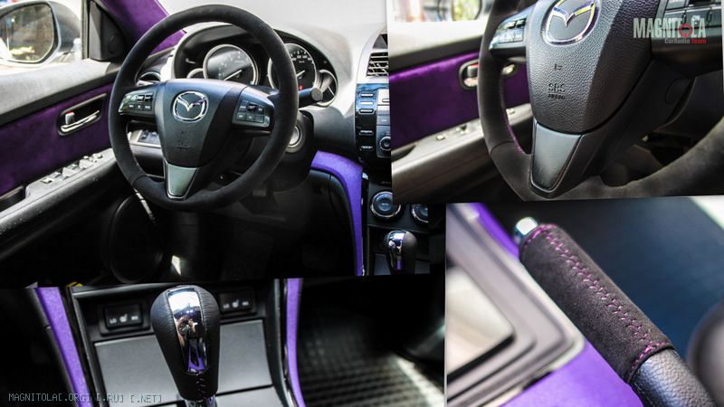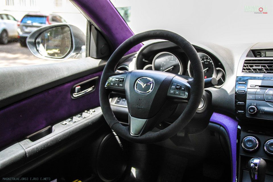 Ну а со вторым вы все уже давно знакомы – это наш старый друг Gio на своей «ганста» mazda 6. Эта та самая мазда, которая создала некую революцию своим фиолетовым потолком и элементами салона. Он вообще наш частый гость! Ему мы тоже перетянули руль, но только строчку пустилии фиолетовой ниткой под стать всему остальному.